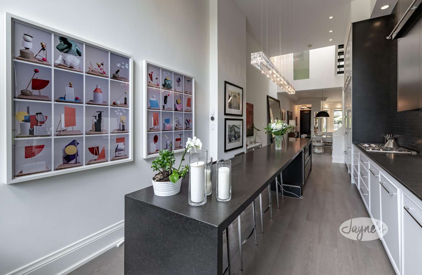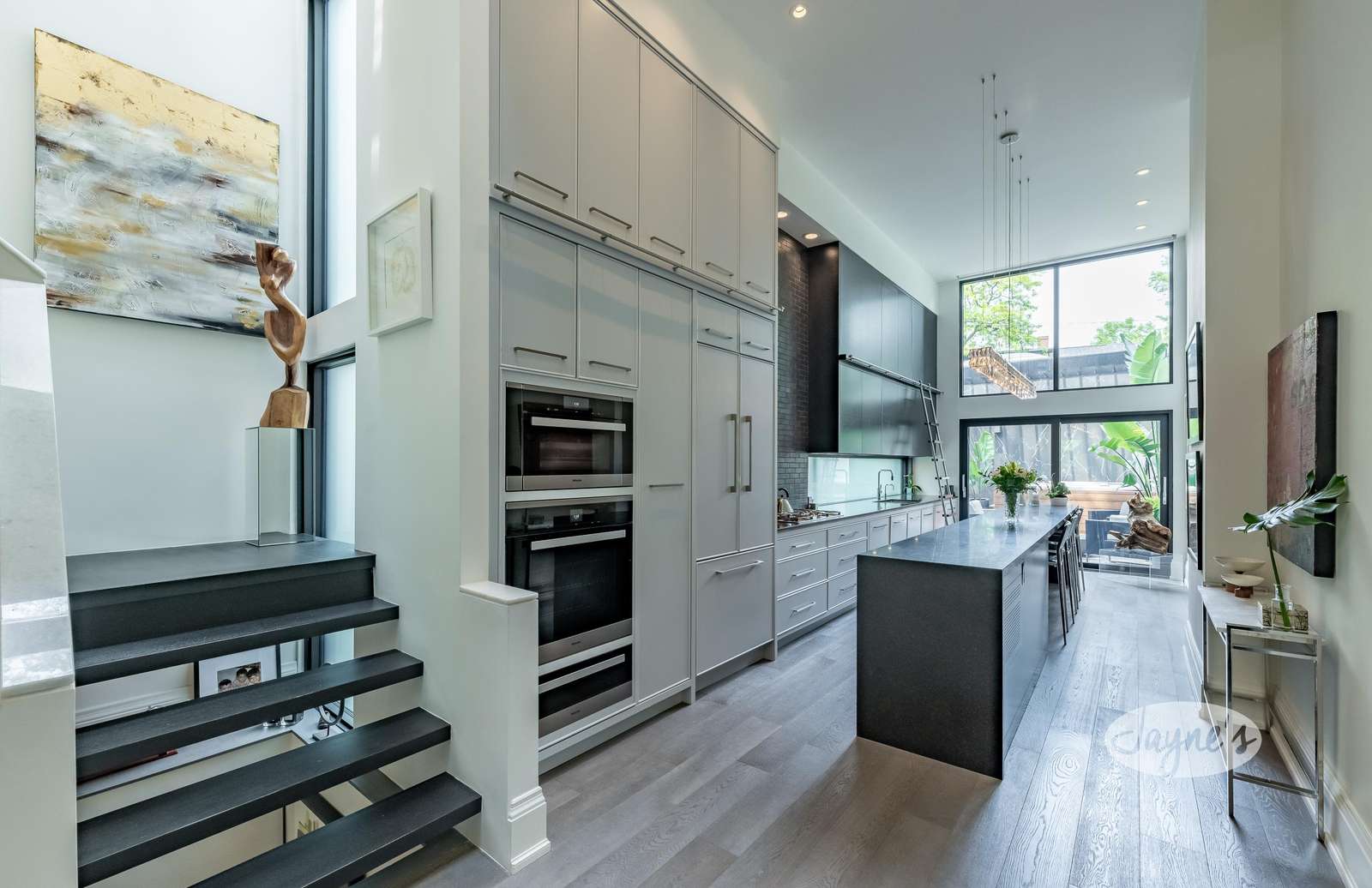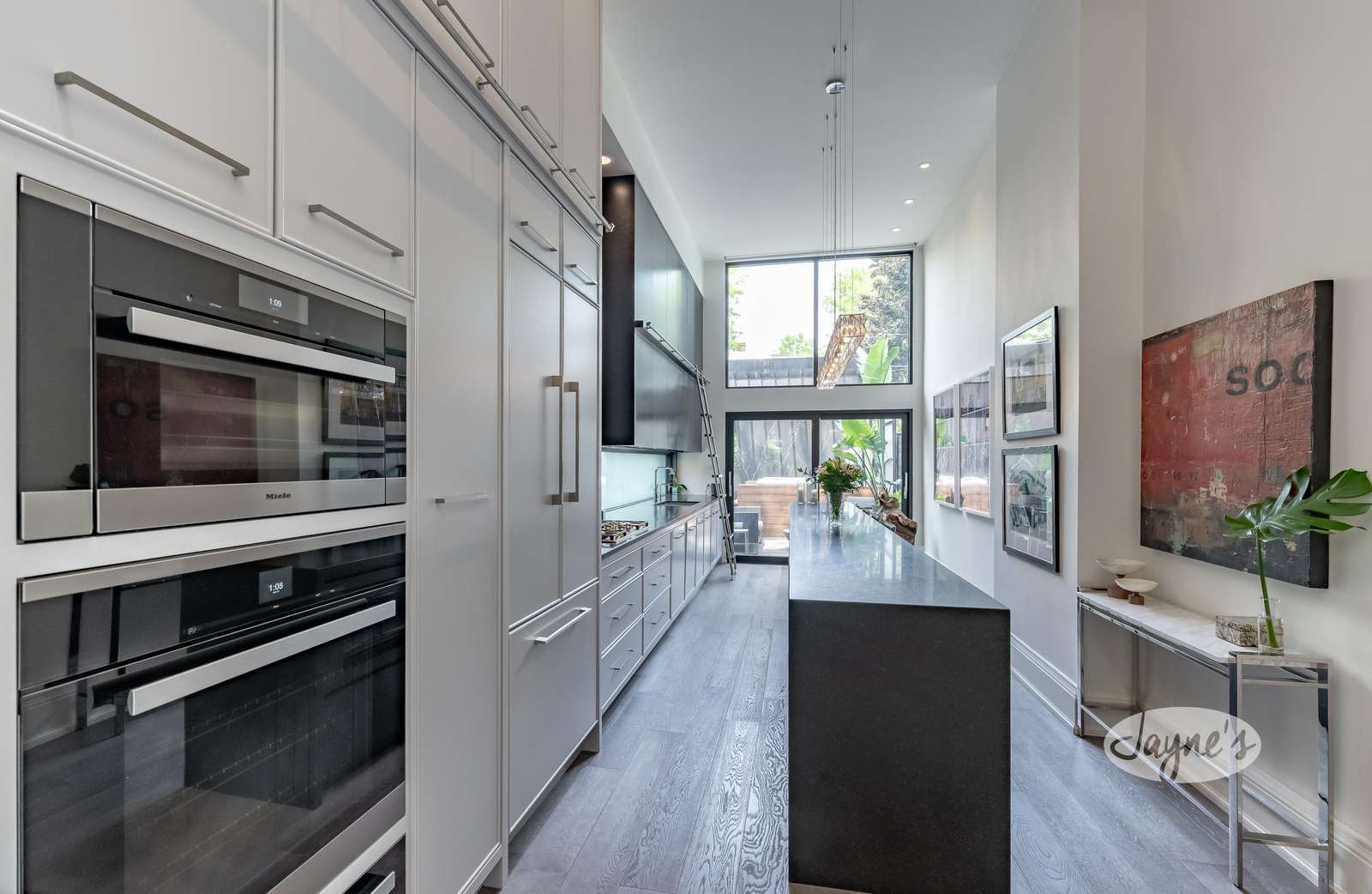 Floor to ceiling double height cabinets, drop down remote TV, 17 ft island seats 4, gas cooktop high end appliances, open concept