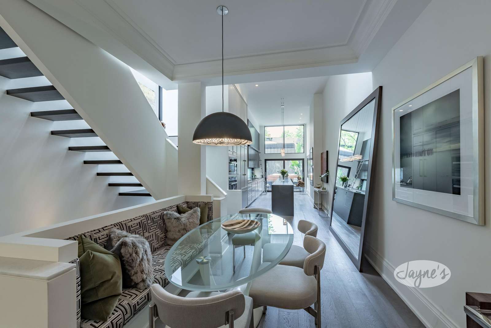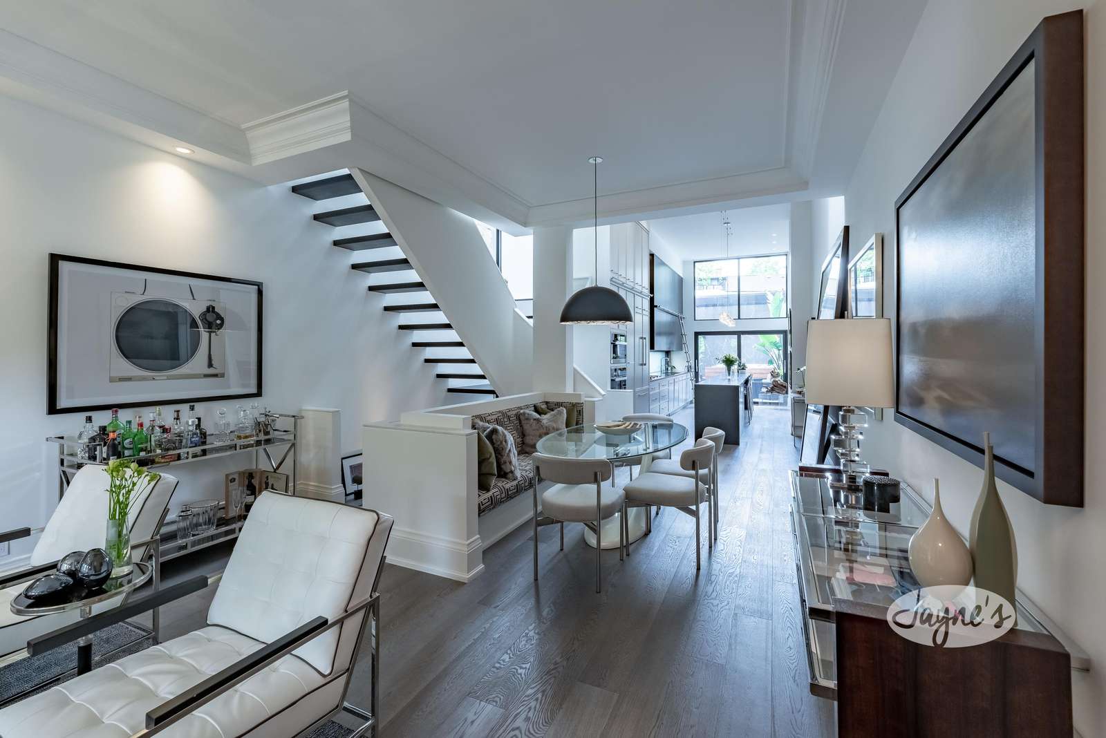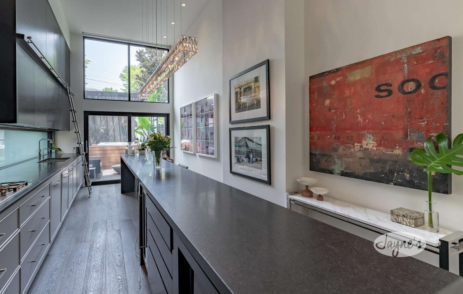 Floor to ceiling double height cabinets, drop down remote TV, 17 ft island seats 4, gas cooktop high end appliances, open concept