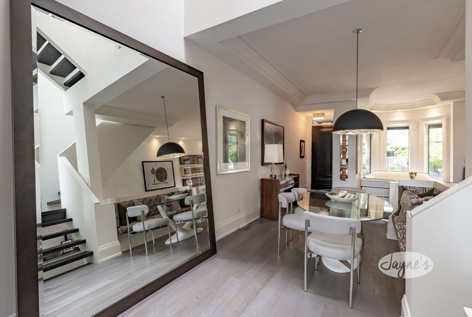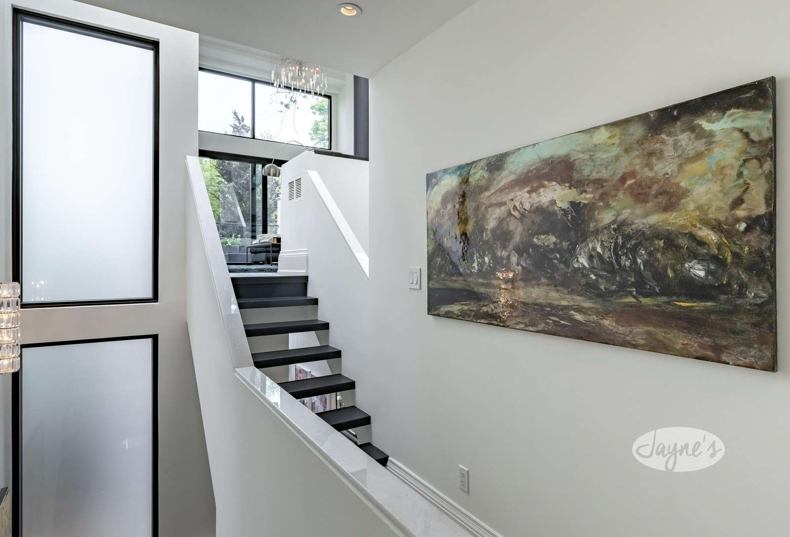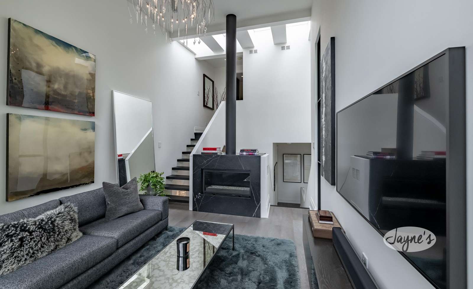 Open concept with bay window. 28 ft stairwell, marble banister tops with 5 skylights