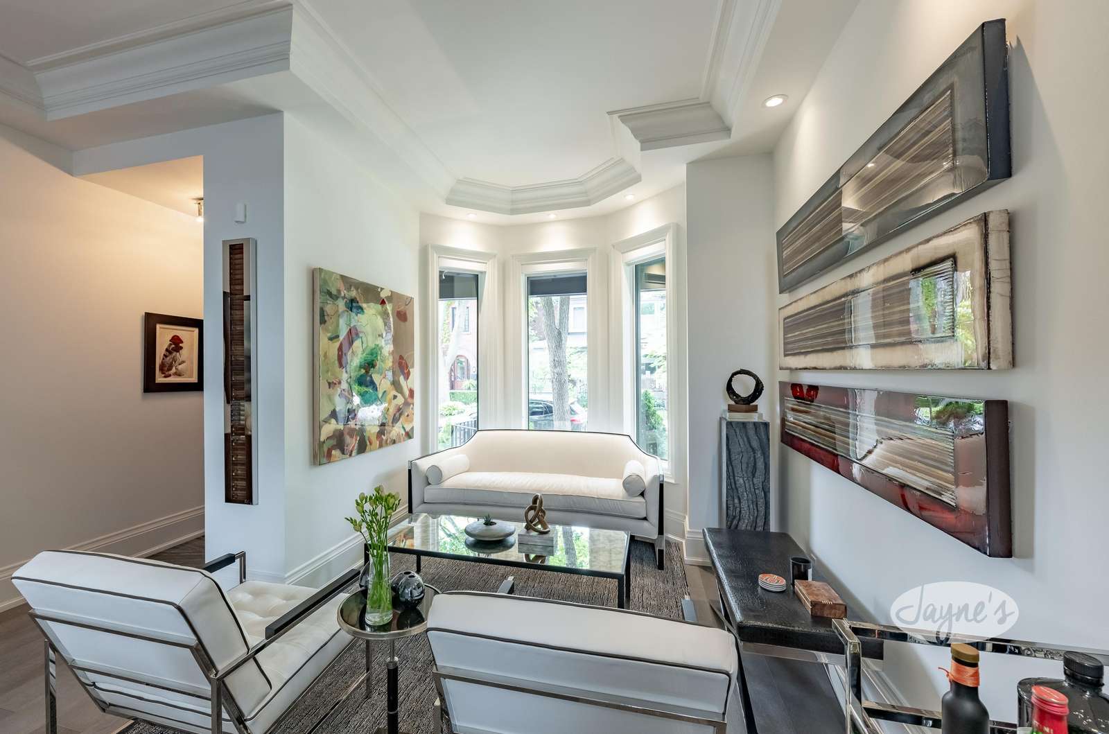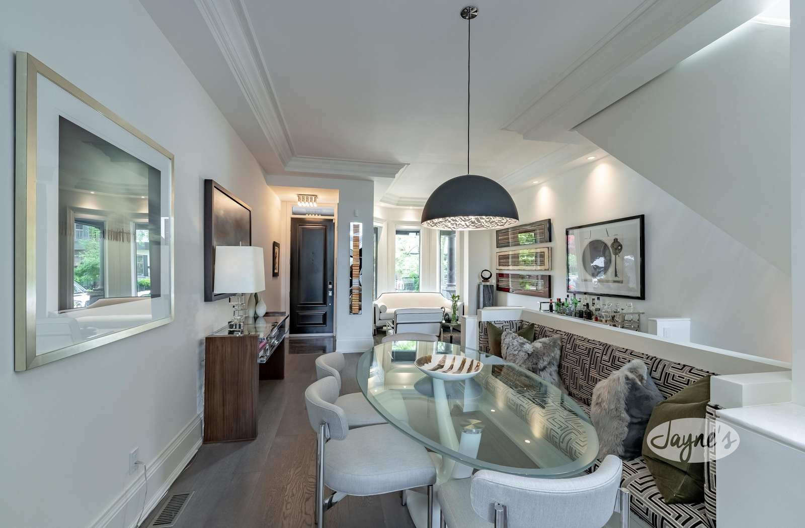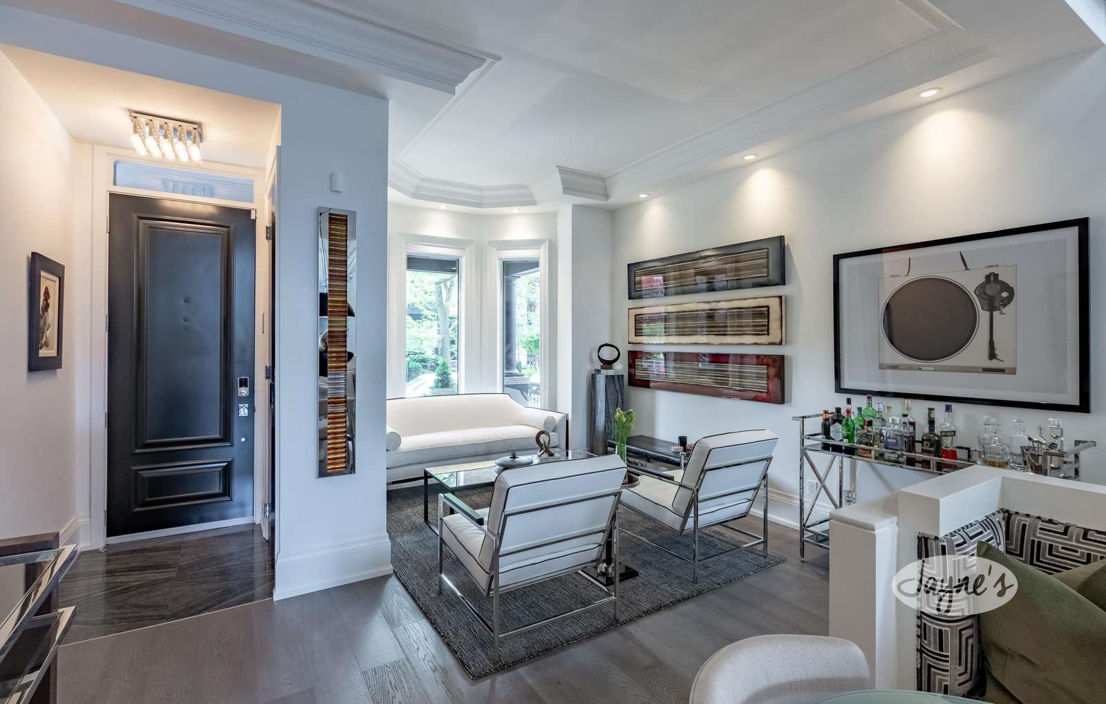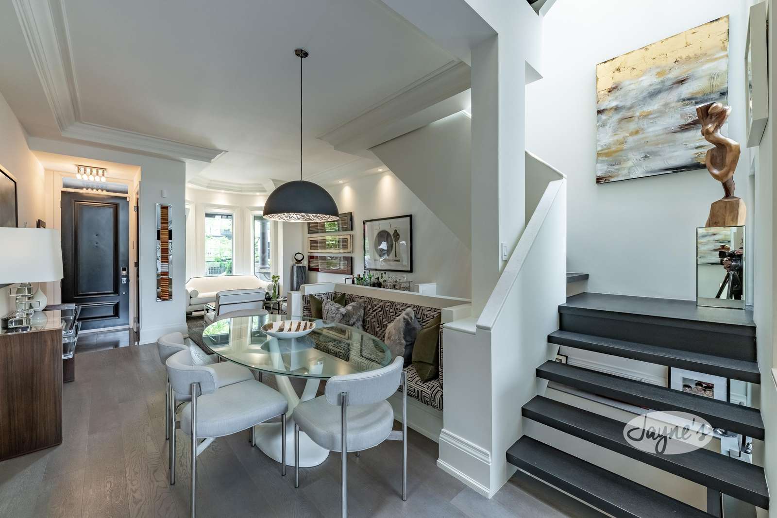 Open concept with bay window. 28 ft stairwell, marble banister tops with 5 skylights