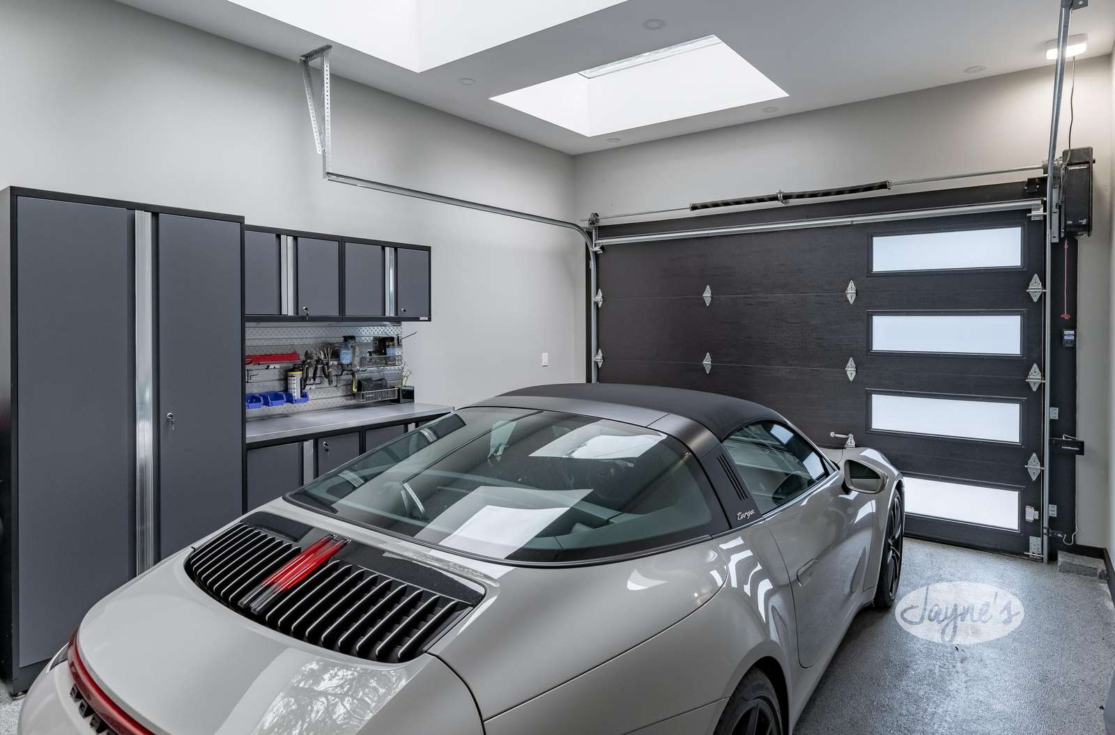 Pristine heated oversized single garage with skylights