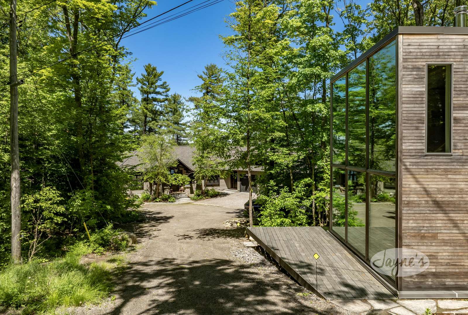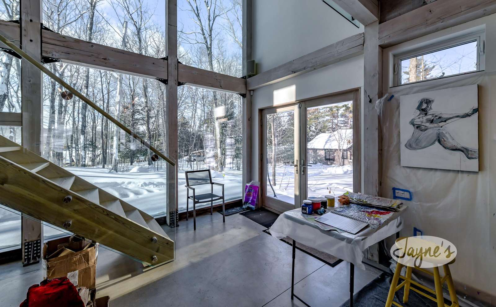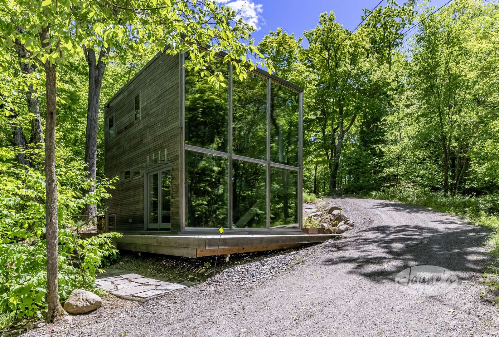 Custom built art studio with sleeping quarters in loft above (2022). Full curtain wall of windows and deck facing west.