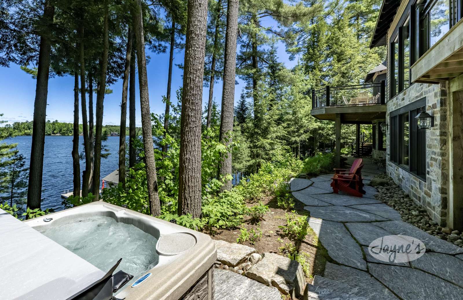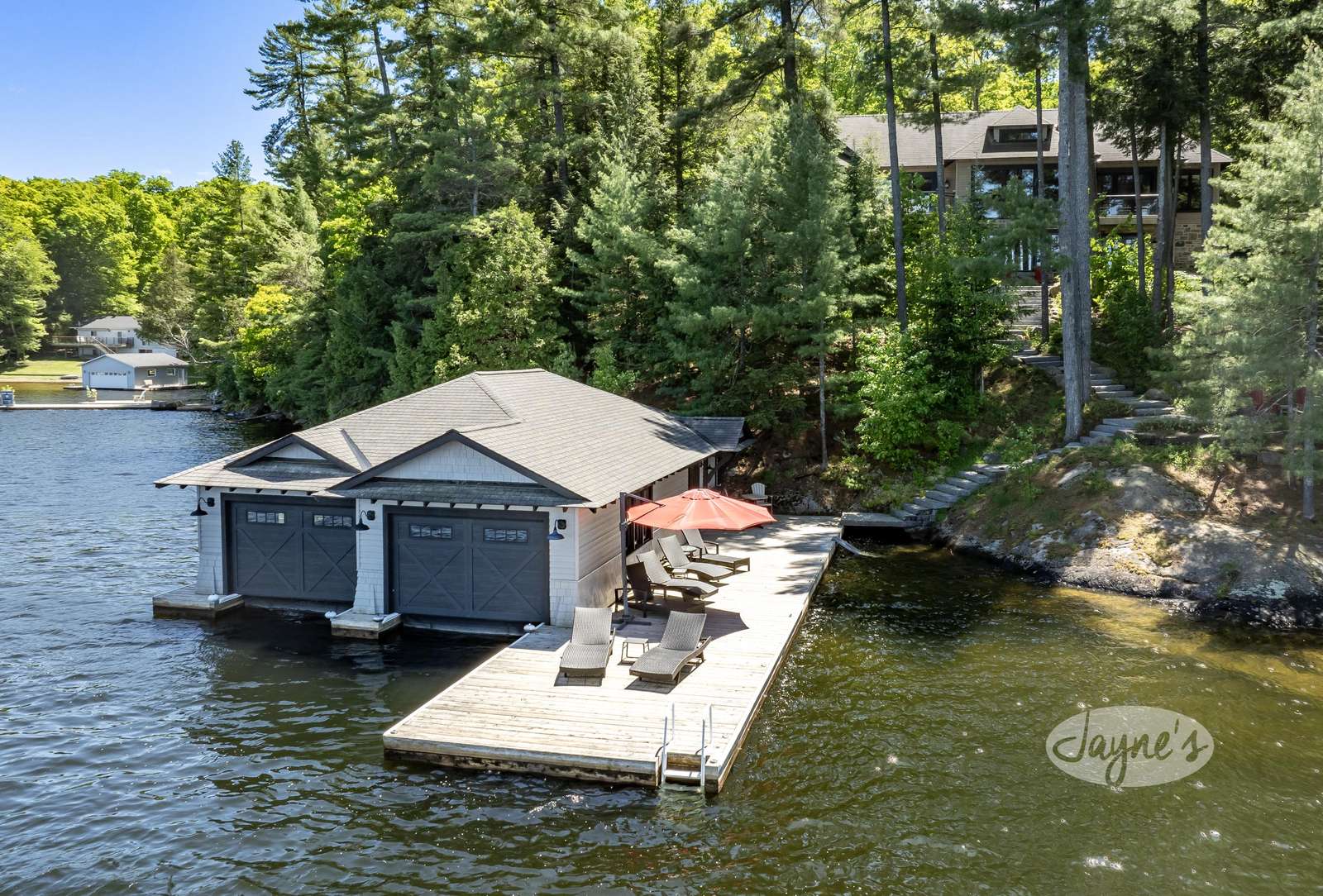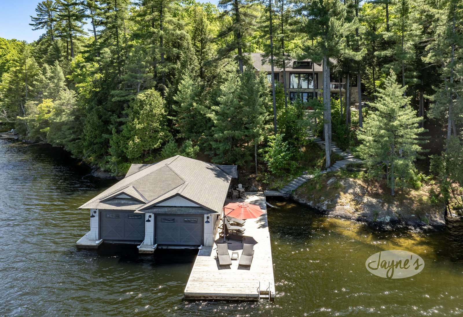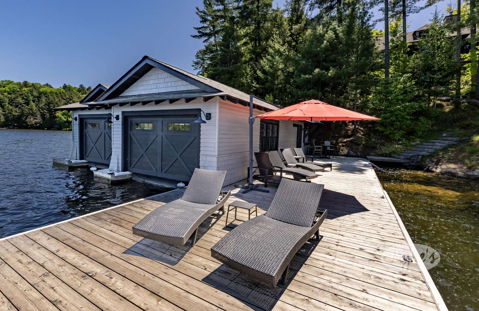 TALL TIMBERS - This stunning, custom-built cottage sits on over four acres of well-treed, beautifully-landscaped land in Arthurlie Bay, Lake Rosseau. Boasts 200' of prime Lake Rosseau frontage, a 3-slip boathouse complete with a kitchenette and bathroom, a spacious dock with lounge chairs, and a hot tub! Northwest exposure promises sunny days and breathtaking Muskoka sunsets! Equipped with path lighting and steps leading down to the rocky waterfront. Deep water off the end of the dock! There is also a 3-car garage with a BBQ and wine fridge.