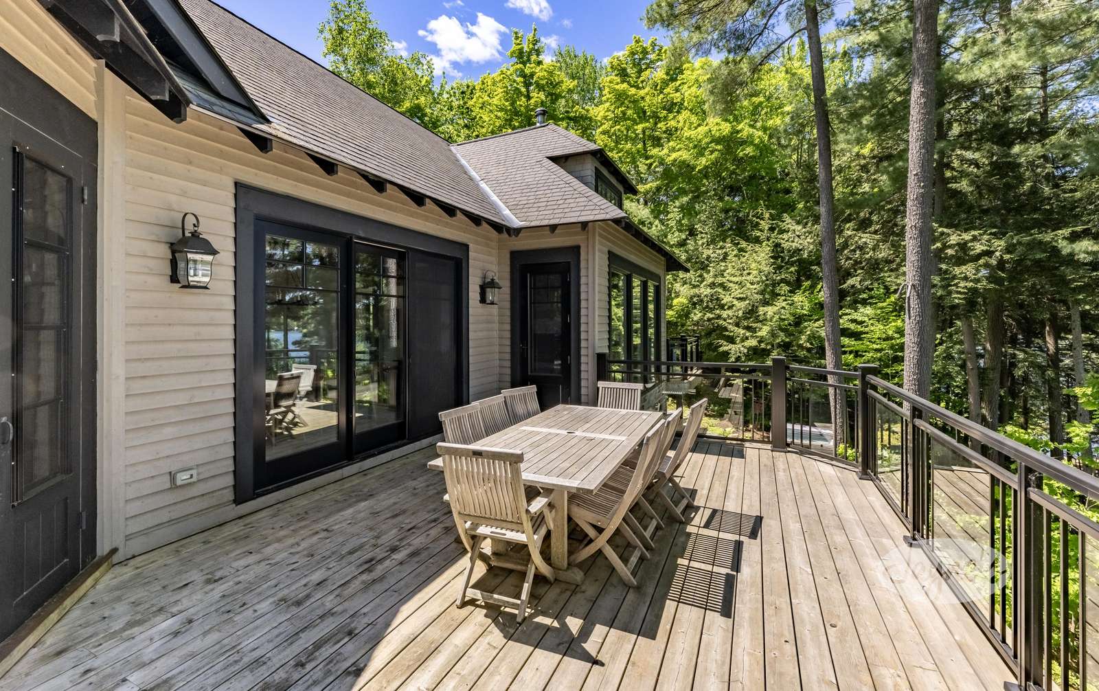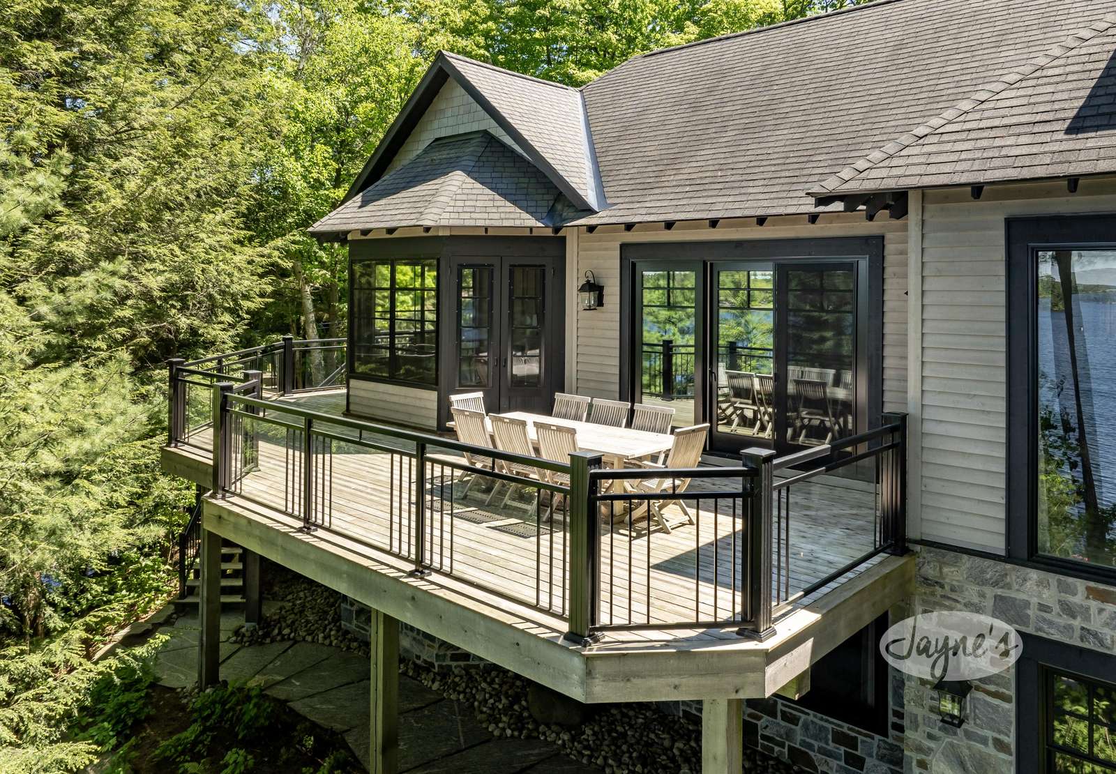 This cottage features spacious, open-concept main rooms and wood-beamed cathedral ceilings, white walls and elegant stone accents. The Great Room provides a wonderful space for family and friends to congregate, and is equipped with an oversized stone fireplace, floor-to-ceiling windows overlooking Lake Rosseau. Plenty of comfortable seating and doors leading out to the deck. The spacious kitchen is also located on the main floor of the cottage, and features stainless steel appliances, an island with 4 stools, a pantry, a double-door refrigerator, two sinks and sleek white granite countertops. The new dining table (2023) is located just beyond the kitchen island, with seating for 10 guests. The large Muskoka Room can be accessed through the kitchen, and features screened-in windows, a sitting area, and doors leading out to the upper deck.