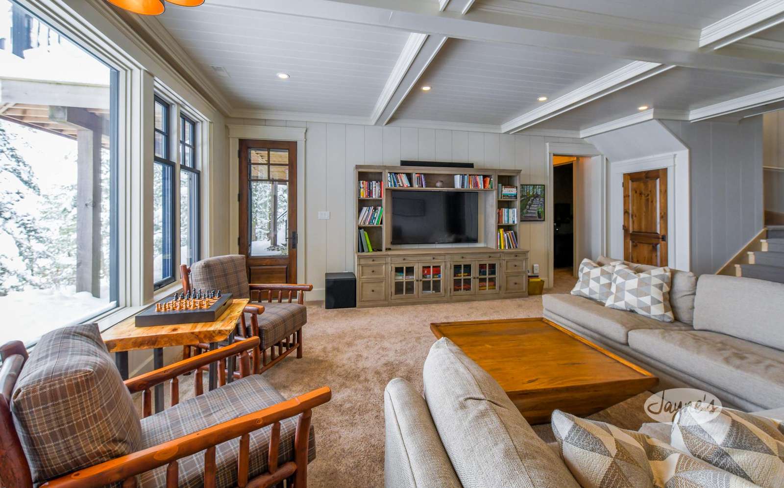 There is a spacious games room located on the upper level of the cottage, complete with a flat-screen TV, a sitting area with pull out queen couch, a live-edge desk and a ping pong table. The lower level of this cottage features a living room with sectional couches, oversized windows, a flat screen TV and a walkout to the lower patio. There is an exercise room/yoga studio located on the lower level, complete with a flat screen TV, a variety of workout equipment including a Peloton Bike, TRX and a 3-piece bathroom.
