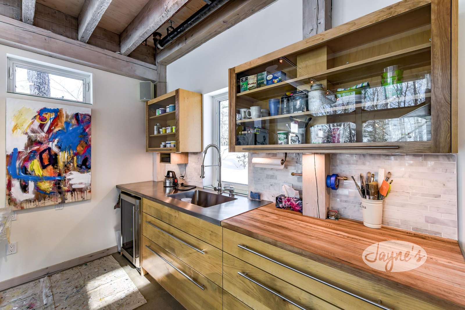 Owner’s art studio is off limits to renters, except for small fridge, kitchen area and use of cooling equipment if needed. Sonos system can also be accessed here. Bedroom and bathroom upstairs are