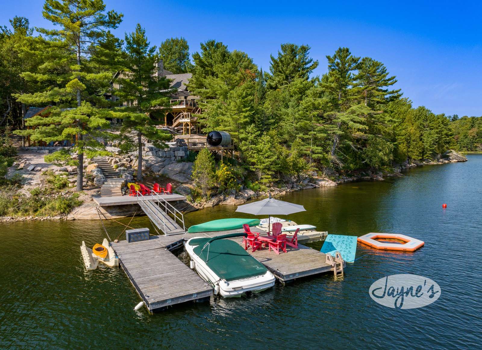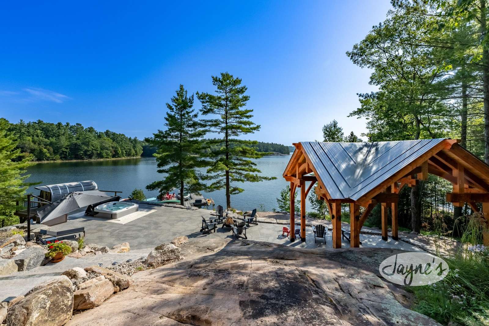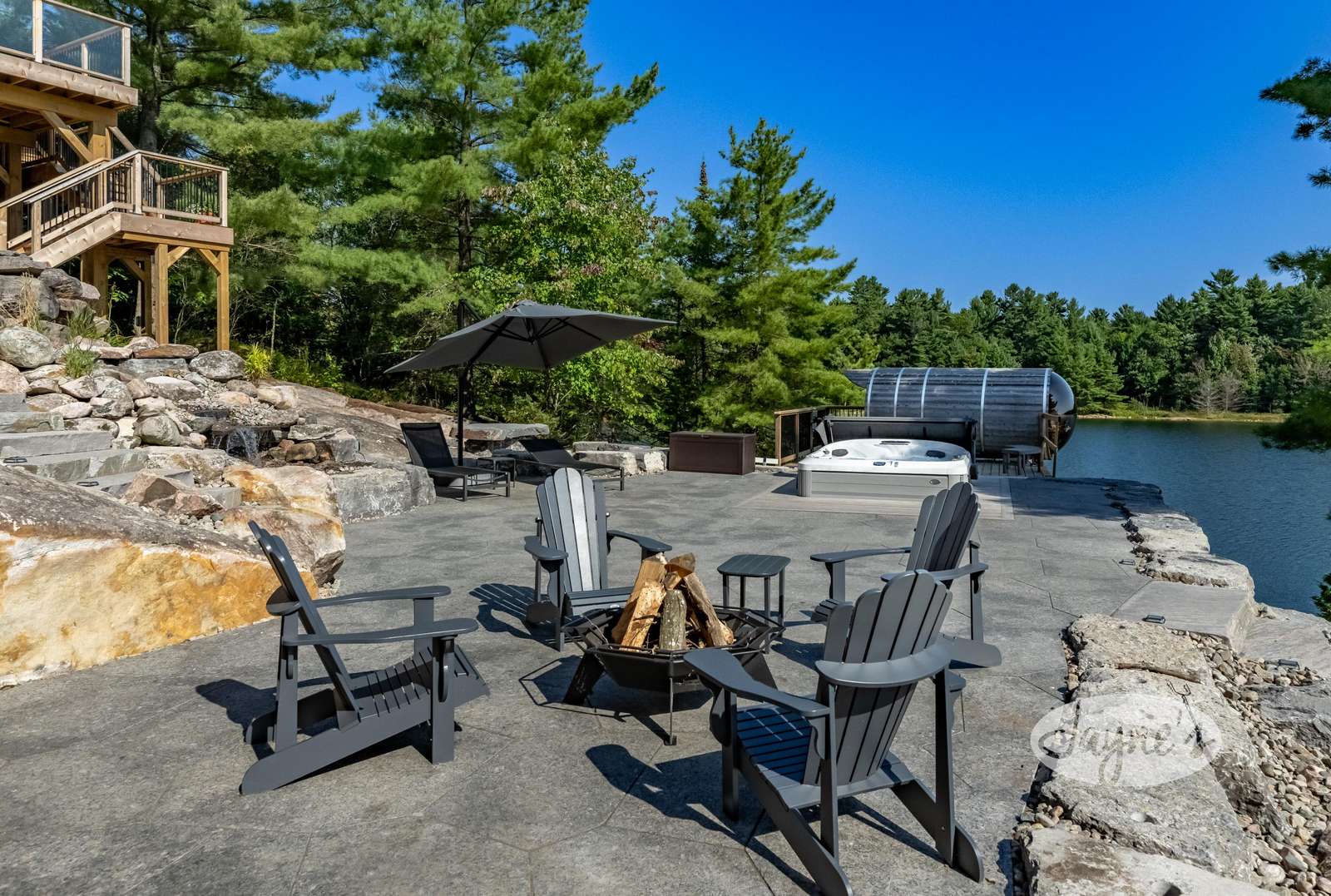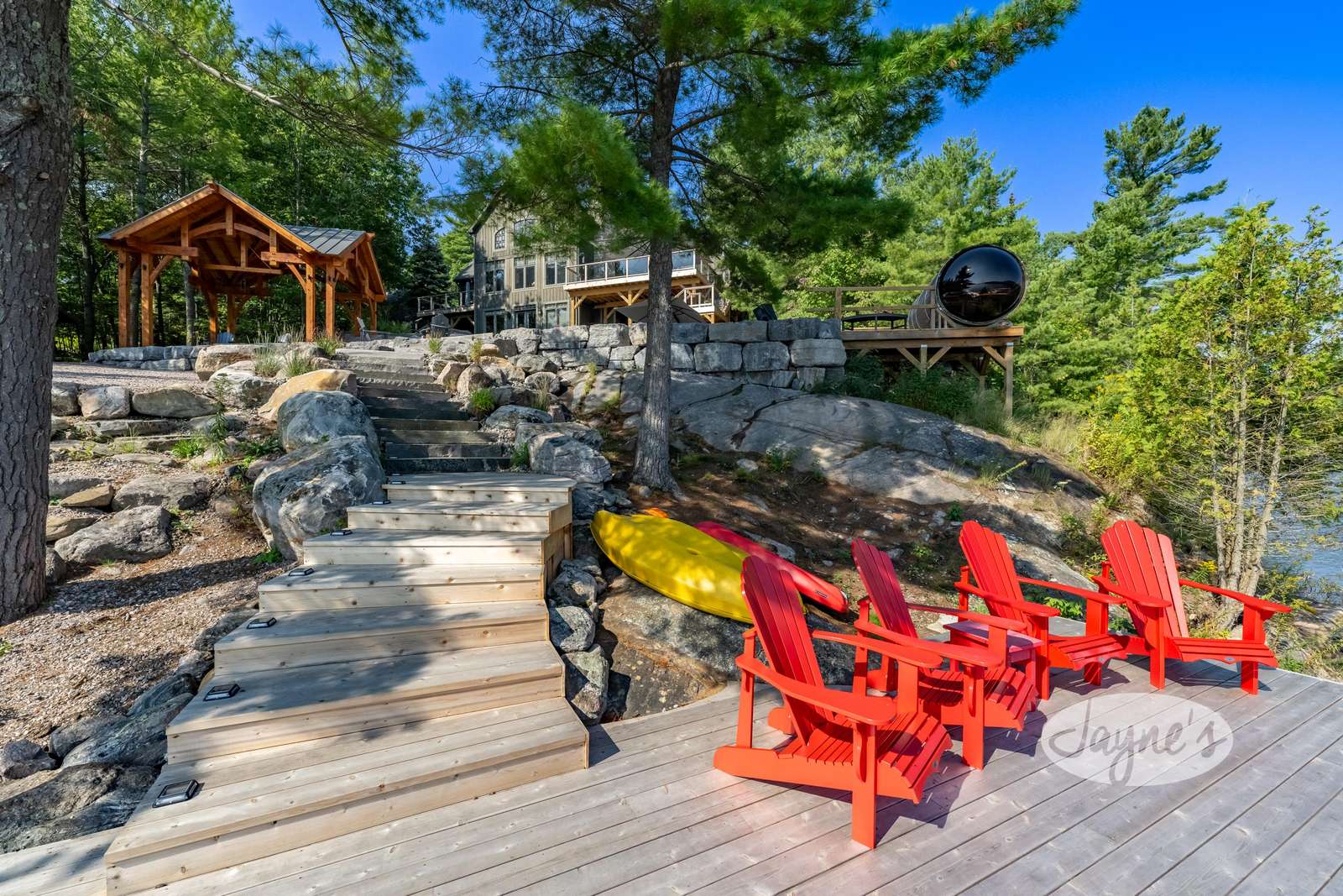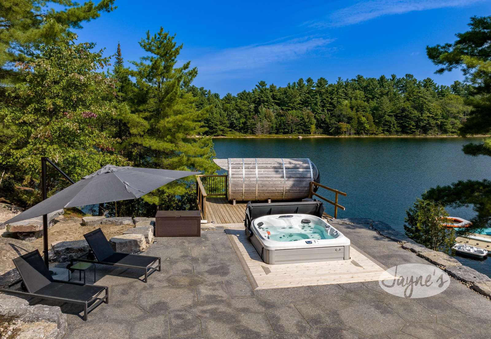 TEA HOUSE is a well-appointed holiday home with every luxury inside and out. This property allows parking for up to 8 cars. Professionally landscaped, there is something to entertain you at every level outdoors. Beautiful decks off of the main level of the home. Primary bedroom walkout with seating. A great place to enjoy your morning coffee and take in the sights. The deck off of the main floor hosts a gas BBQ, an umbrella to shield from the all day sun and plenty of seating. Make your way down the stone steps to the newly constructed patio with Pavilion. Large dining table that seats 12 and a new outdoor kitchen with additional BBQ, flat top grill, propane burner, fridge, and beverage fridge everything a gourmet cook will need for outside entertainment. A landscaped firepit with Muskoka chairs surrounding ensure plenty of smores and star gazing nights. Sauna and hot tub make for a spa like experience and extend the season to enjoy this beautiful space throughout the fall months. A sandbox for the littles ensures family fun for everyone. More seating at the dock allows for a quick dip into the water. Deep water off of the dock allows for great boating, fishing and water sports.