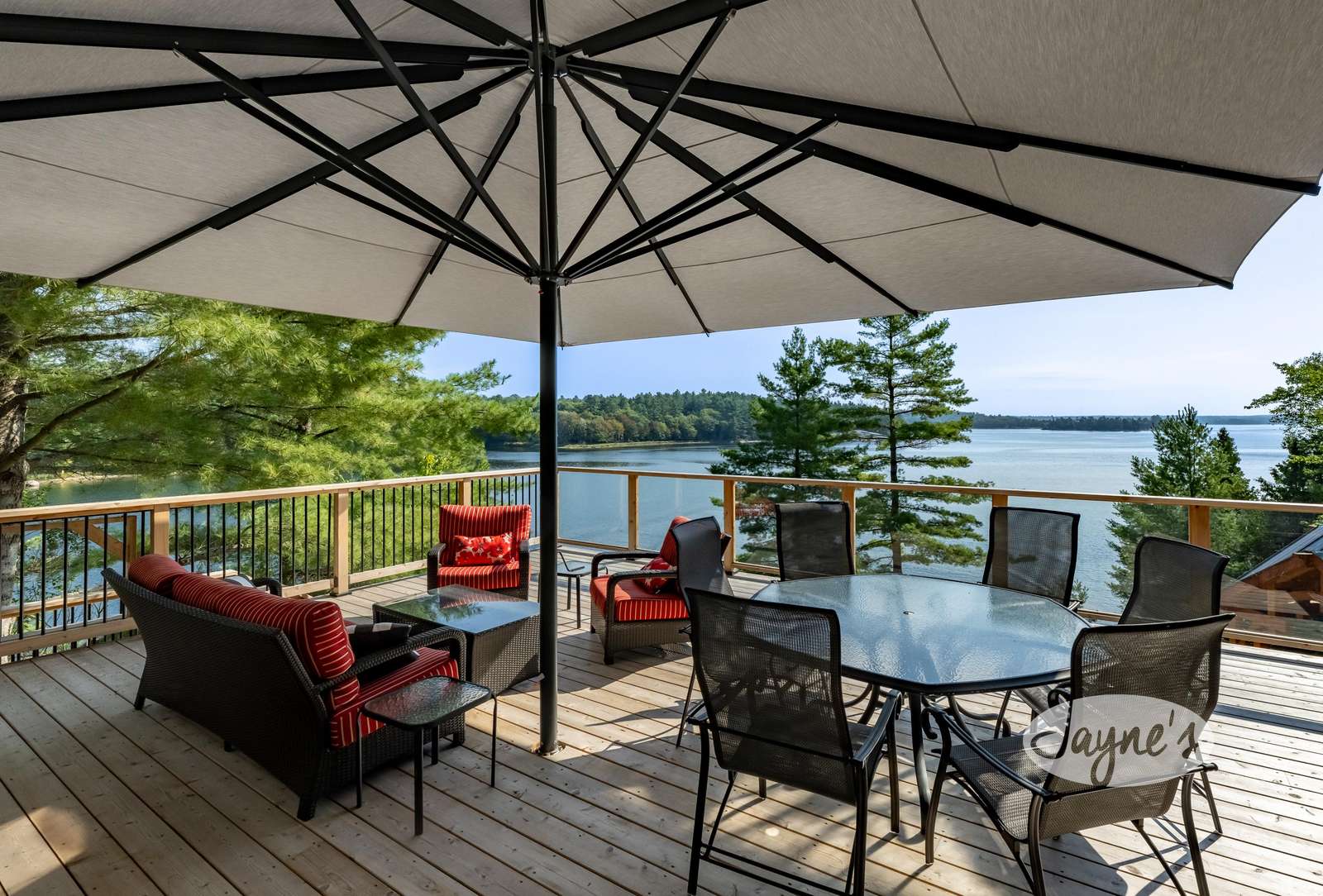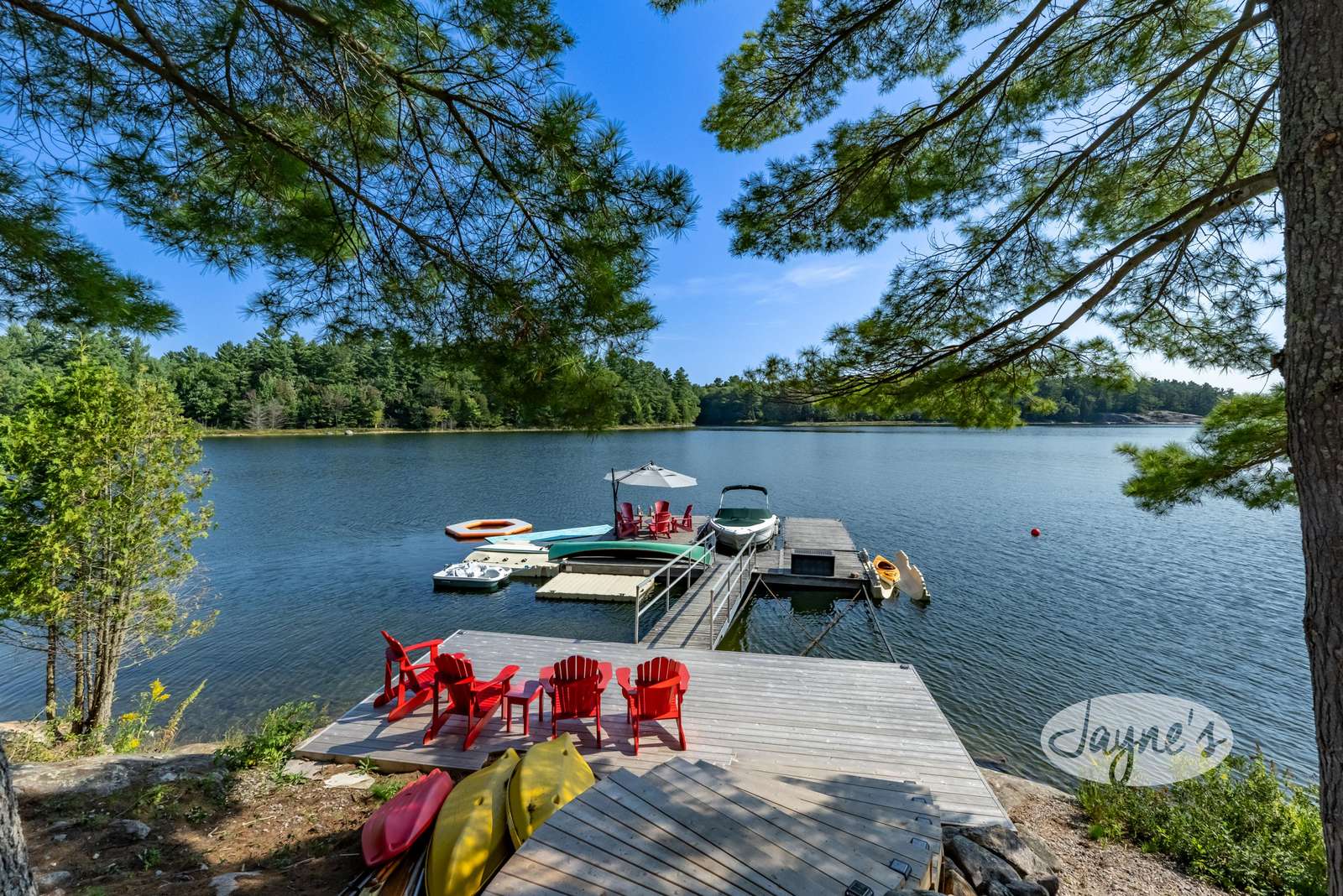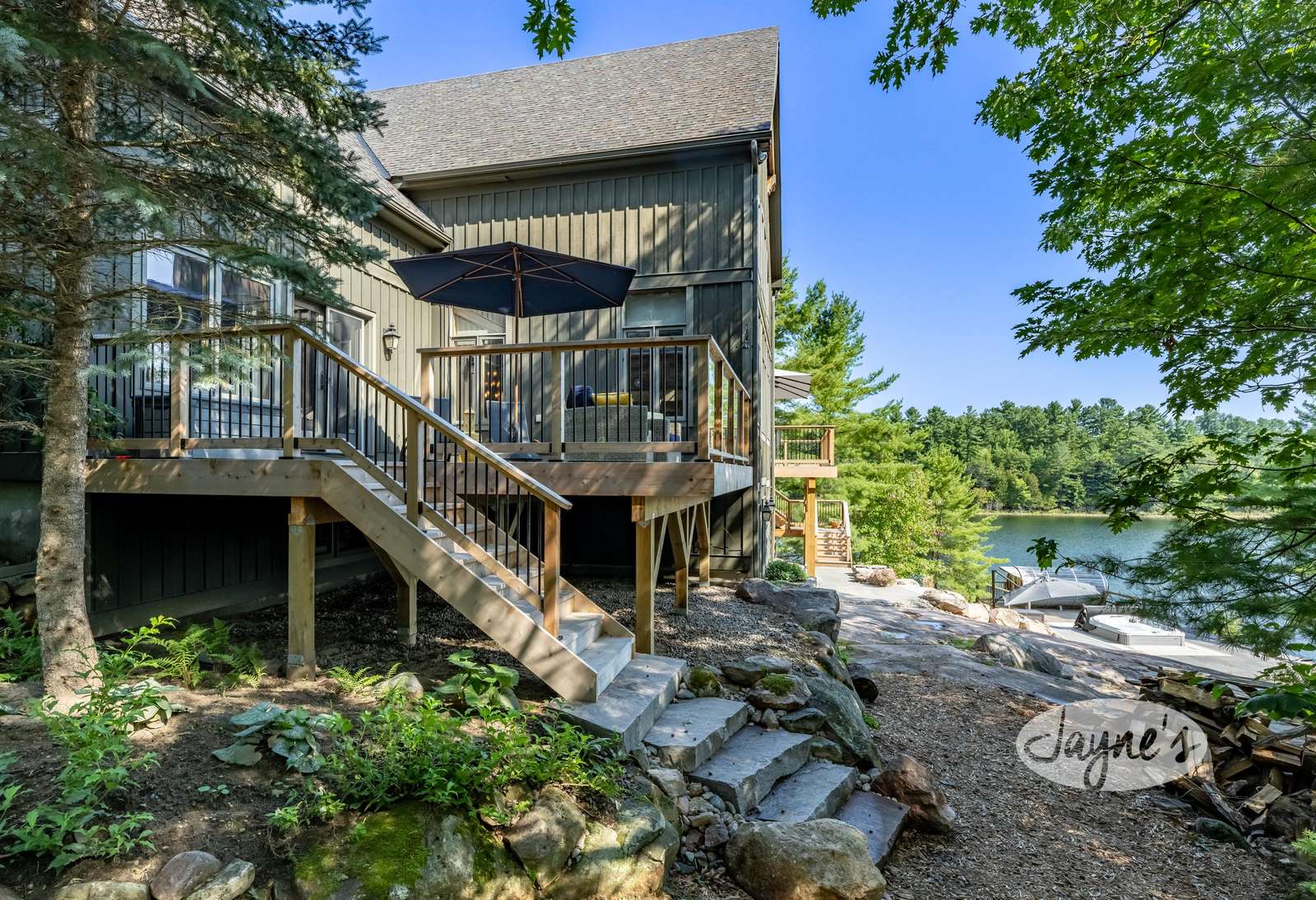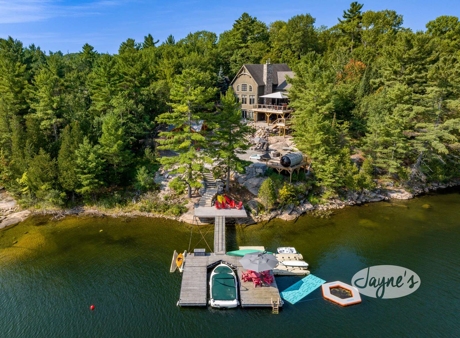 TEA HOUSE is a well-appointed holiday home with every luxury inside and out. This property allows parking for up to 8 cars. Professionally landscaped, there is something to entertain you at every level outdoors. Beautiful decks off of the main level of the home. Primary bedroom walkout with seating. A great place to enjoy your morning coffee and take in the sights. The deck off of the main floor hosts a gas BBQ, an umbrella to shield from the all day sun and plenty of seating. Make your way down the stone steps to the newly constructed patio with Pavilion. Large dining table that seats 12 and a new outdoor kitchen with additional BBQ, flat top grill, propane burner, fridge, and beverage fridge everything a gourmet cook will need for outside entertainment. A landscaped firepit with Muskoka chairs surrounding ensure plenty of smores and star gazing nights. Sauna and hot tub make for a spa like experience and extend the season to enjoy this beautiful space throughout the fall months. A sandbox for the littles ensures family fun for everyone. More seating at the dock allows for a quick dip into the water. Deep water off of the dock allows for great boating, fishing and water sports.