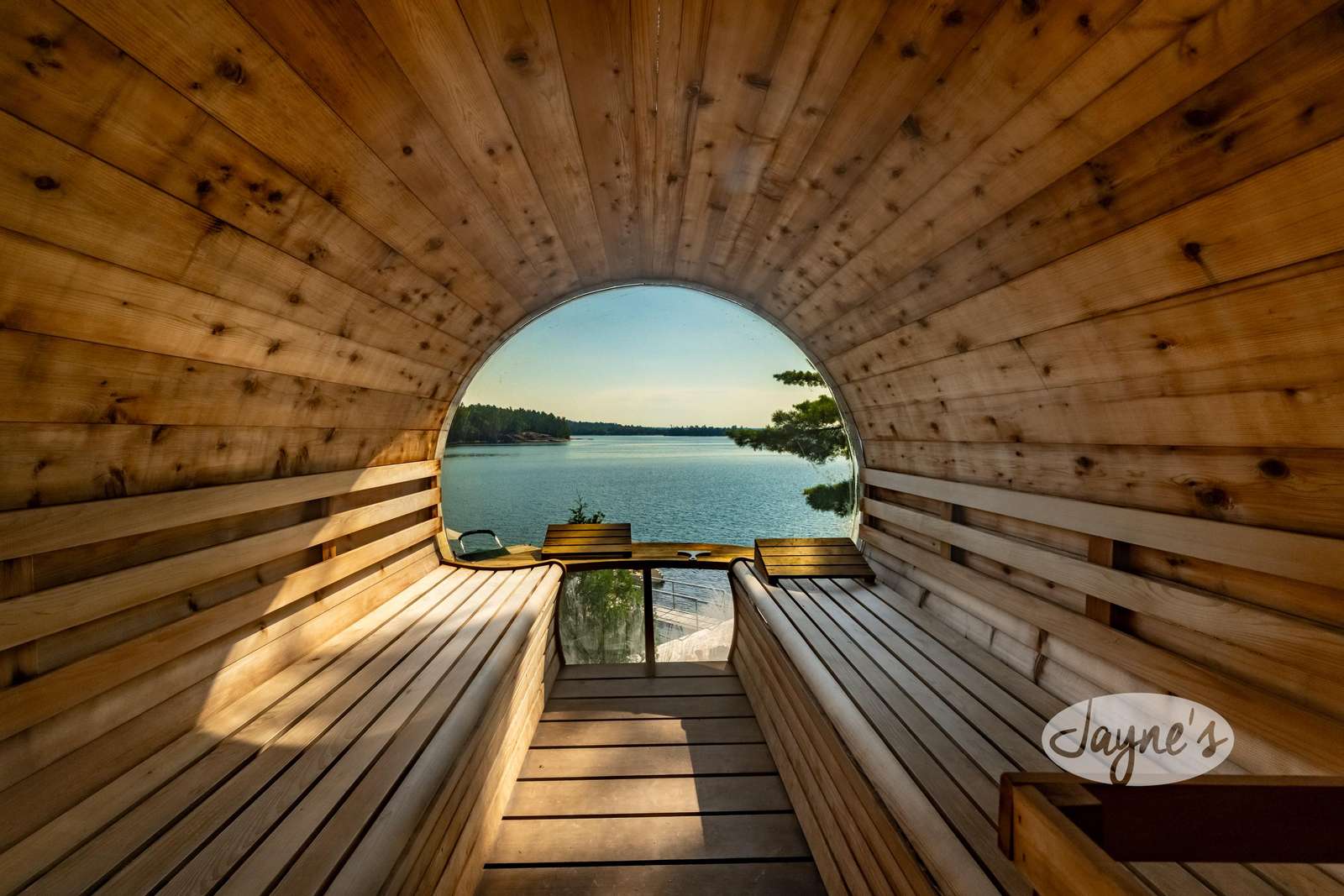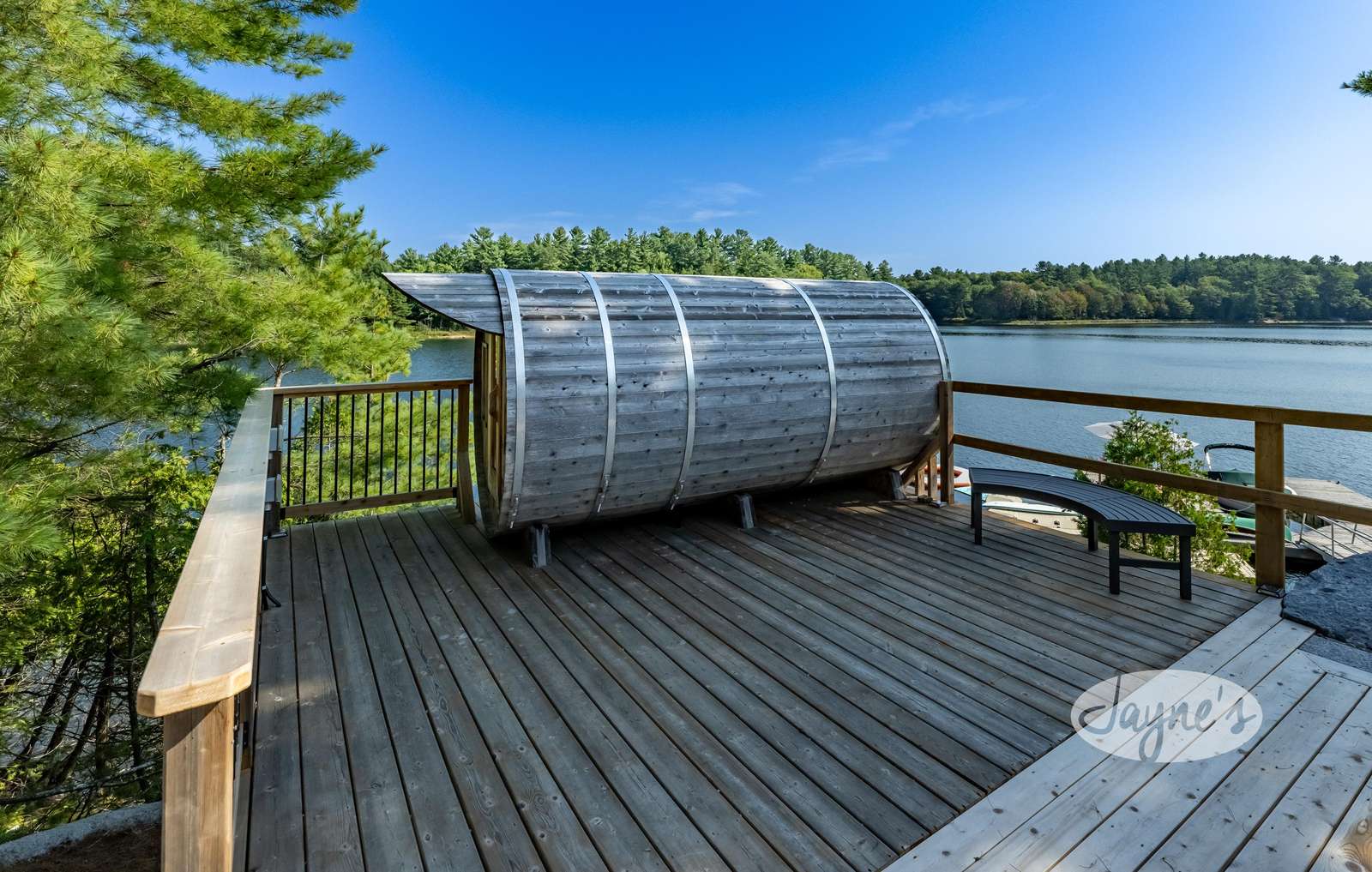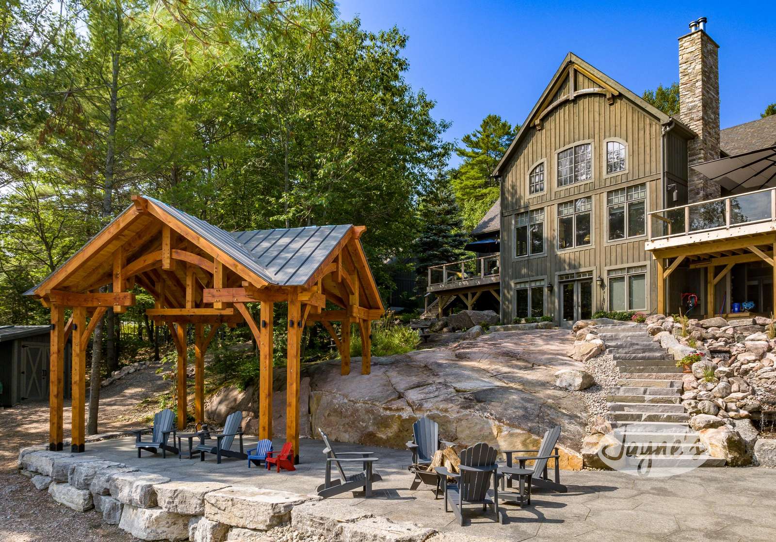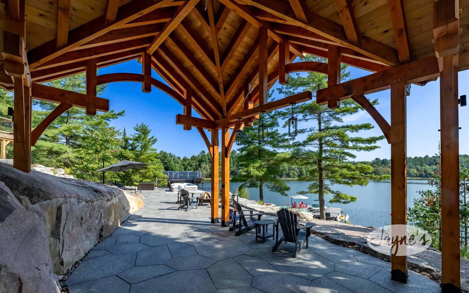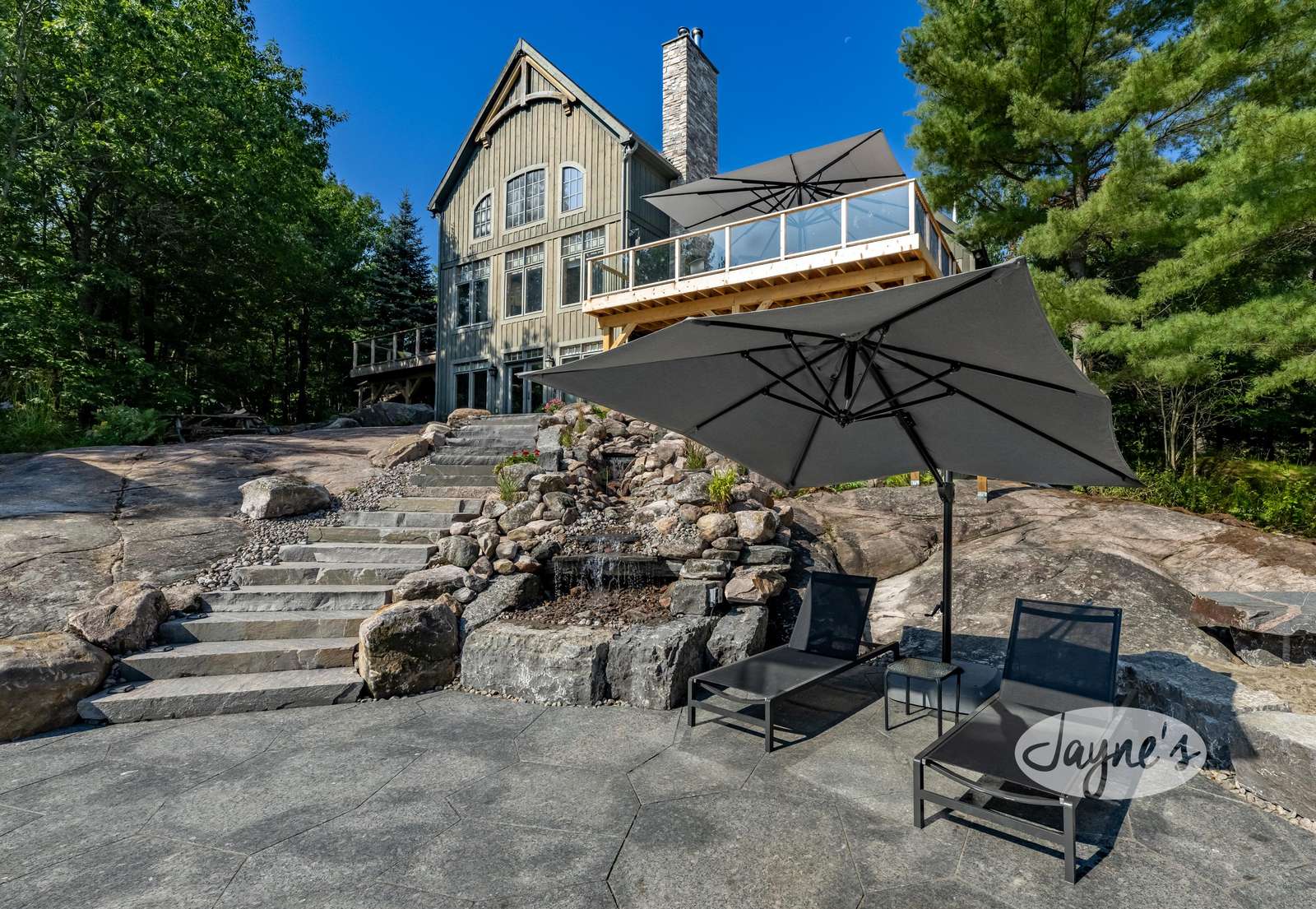 TEA HOUSE is a well-appointed holiday home with every luxury inside and out. This property allows parking for up to 8 cars. Professionally landscaped, there is something to entertain you at every level outdoors. Beautiful decks off of the main level of the home. Primary bedroom walkout with seating. A great place to enjoy your morning coffee and take in the sights. The deck off of the main floor hosts a gas BBQ, an umbrella to shield from the all day sun and plenty of seating. Make your way down the stone steps to the newly constructed patio with Pavilion. Large dining table that seats 12 and a new outdoor kitchen with additional BBQ, flat top grill, propane burner, fridge, and beverage fridge everything a gourmet cook will need for outside entertainment. A landscaped firepit with Muskoka chairs surrounding ensure plenty of smores and star gazing nights. Sauna and hot tub make for a spa like experience and extend the season to enjoy this beautiful space throughout the fall months. A sandbox for the littles ensures family fun for everyone. More seating at the dock allows for a quick dip into the water. Deep water off of the dock allows for great boating, fishing and water sports.