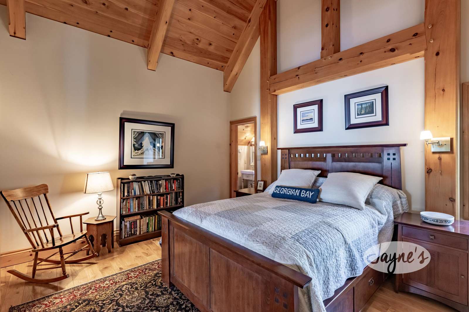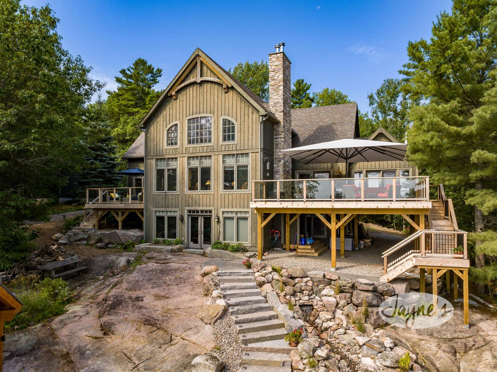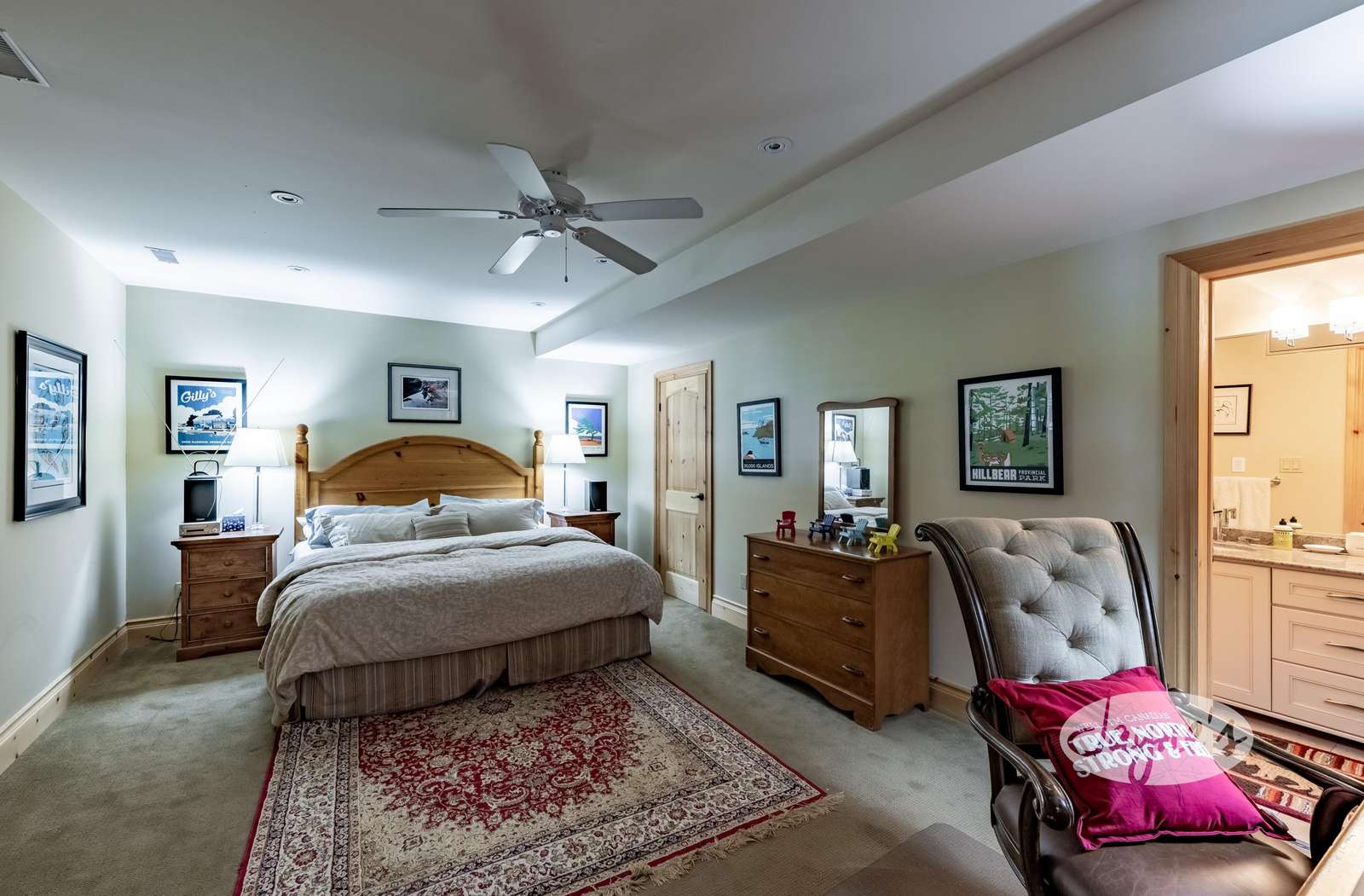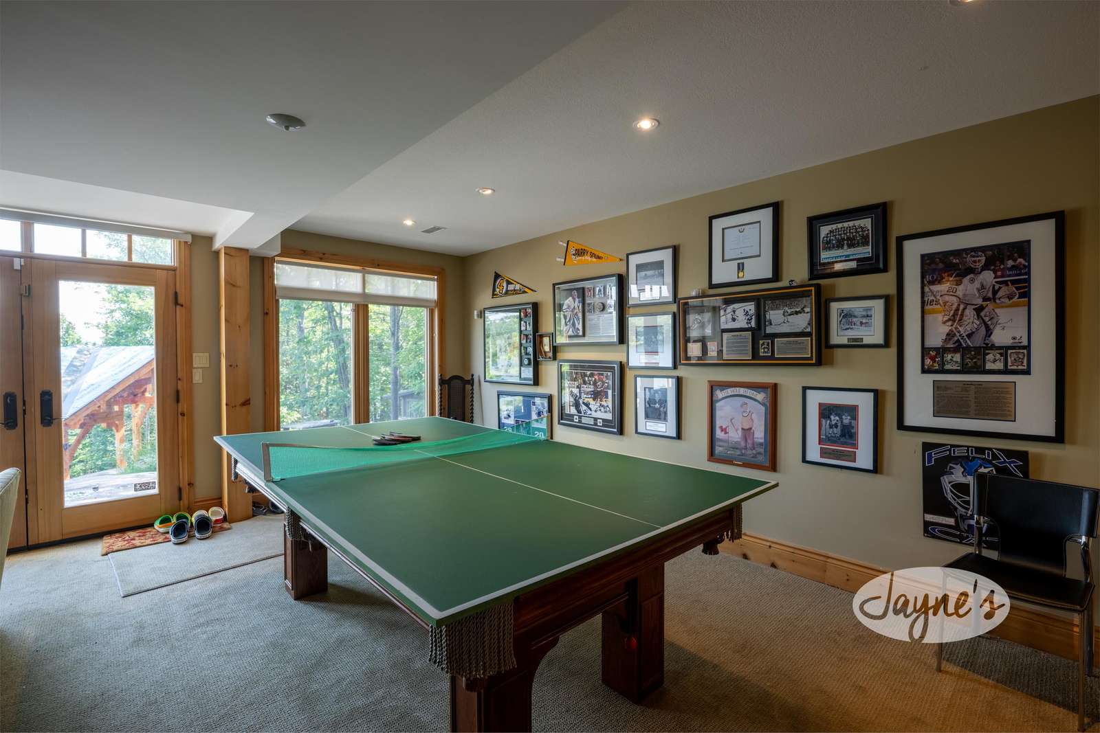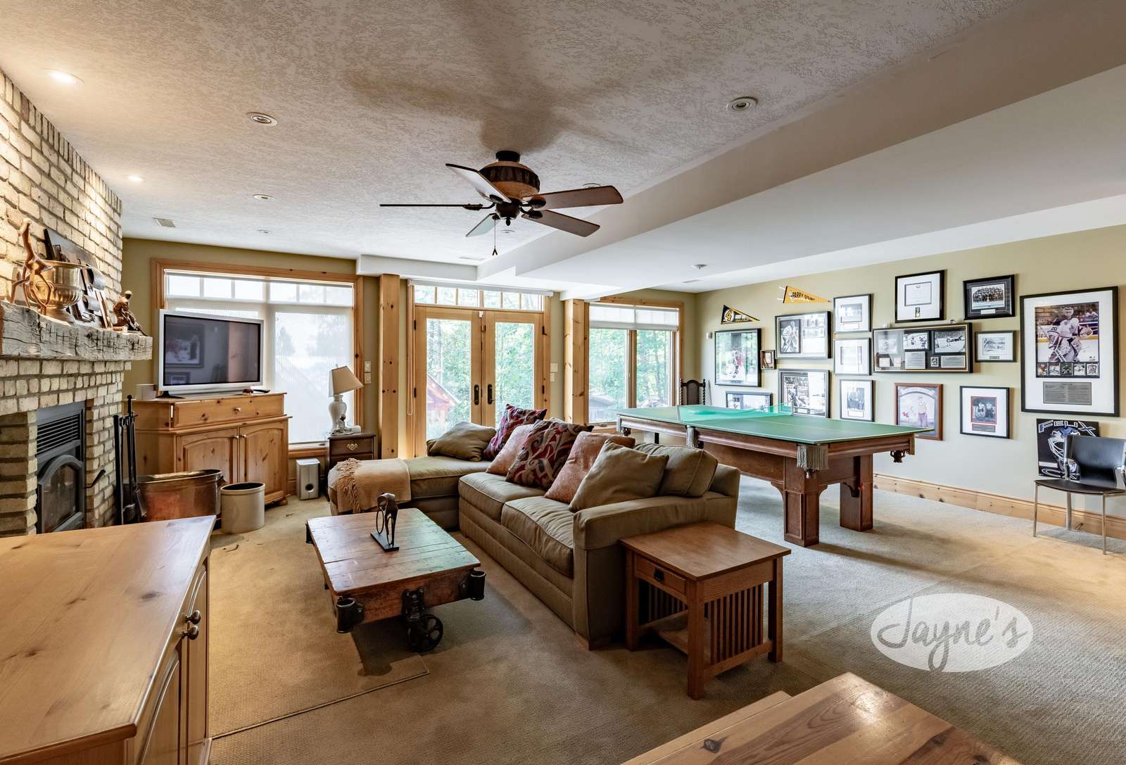 Elegant but cozy, all the rooms are filled with thoughtfully-selected comfortable furnishings. With 6 bedrooms, 7 bathrooms, gourmet kitchen, various indoor and outdoor seating areas, there is enough room for everyone to enjoy together and alone time. The Great Room takes advantage of the wonderful views with a cathedral ceiling that adds elegance to this room, and the large windows take advantage of all the natural light. Here you will find your kitchen, living area, plus a floor-to-ceiling Muskoka stone wood-burning fireplace that adds the ambiance of the true Canadian north. In addition, you have a breakfast bar and dining room with entry to another deck - this room is truly the heart of the home. The deck off the dining room has an Weber BBQ with rotisserie, outdoor dining for 6 and seating area that can sit 5 with a coffee table plus expansive views. This is an entertainer's paradise. There is a 4 season Muskoka room off the dining area to increase your seating or allow a separate conversation area. The gourmet kitchen is a chef's dream, well-lit with natural light and is complete with granite countertops, decorator finishes and upscale appliances. Off of the Great Room sits the main floor master bedroom. With its 5-piece ensuite and private deck, it's a true retreat. The lower level games rooms, has another stone wood-burning fireplace, television, pool table that can be converted to a ping pong table and walkout.