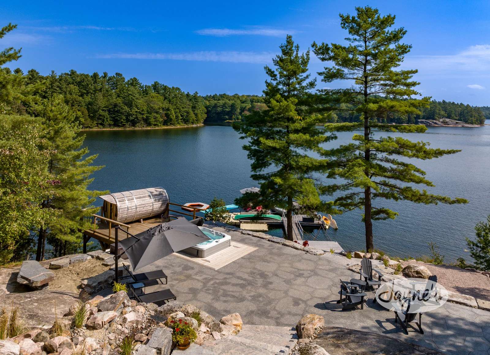 Perched above the water on natural rock, surrounded by mature trees, enjoy the privacy and water views at this perfect getaway. Looking over spectacular Georgian Bay is 5000 sq. ft. 6 bdrm, 7 baths, sleeps 16. Hot tub, sauna, pool table!