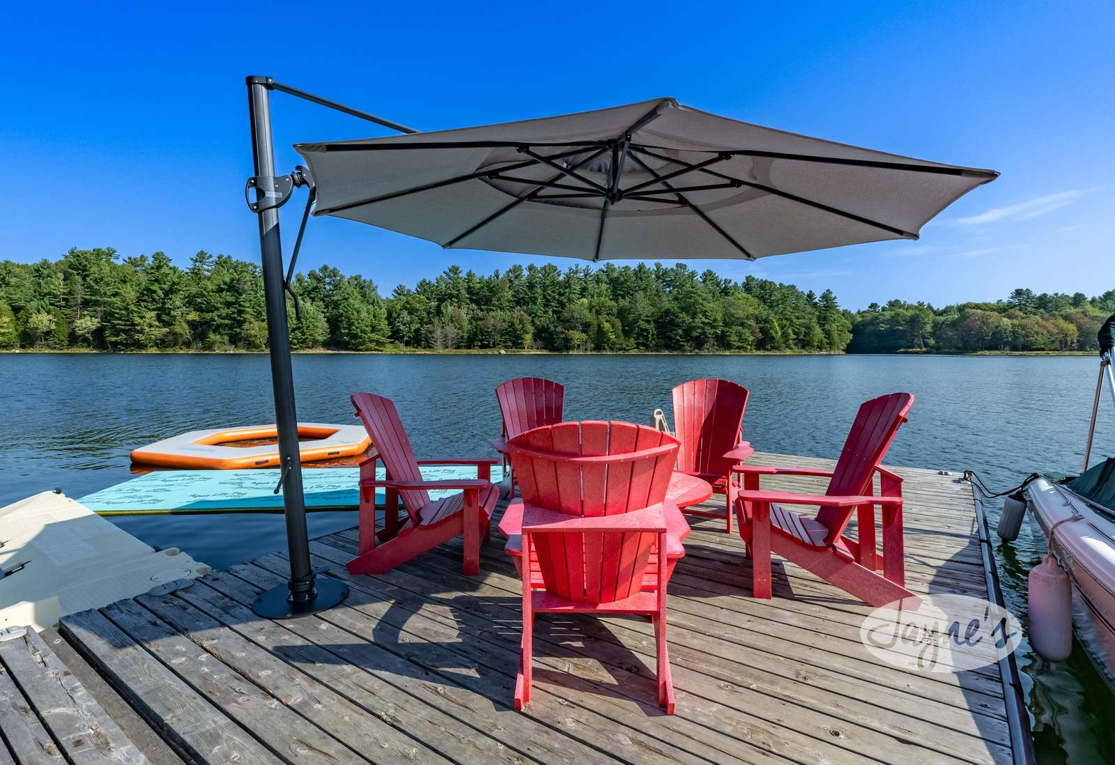 4 Muskoka chairs on dock, 1 umbrella and + 2 Muskoka chairs on second dock extension