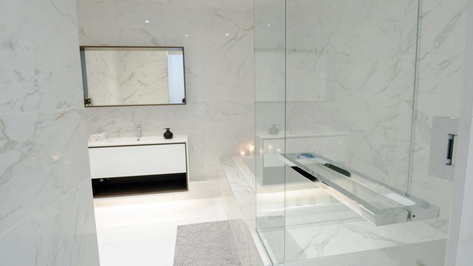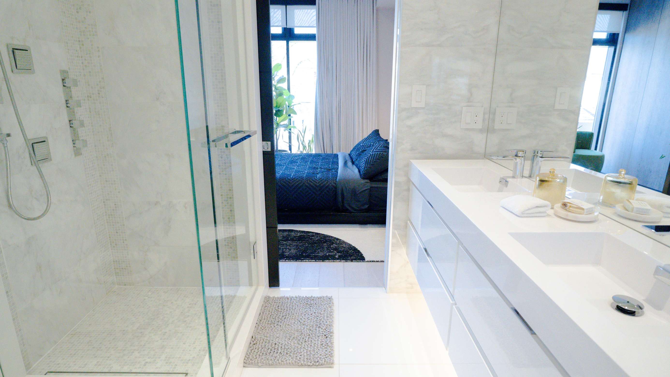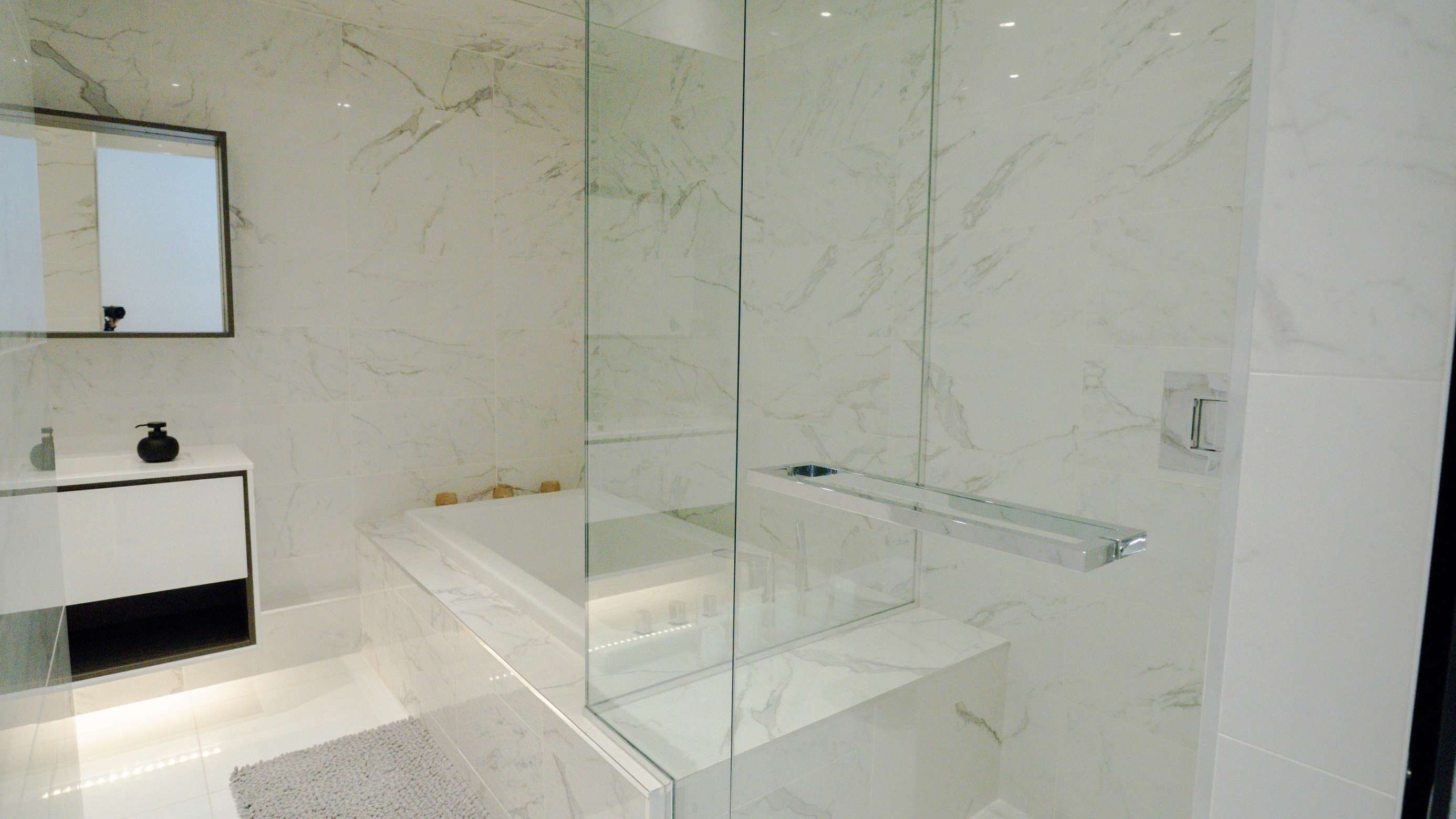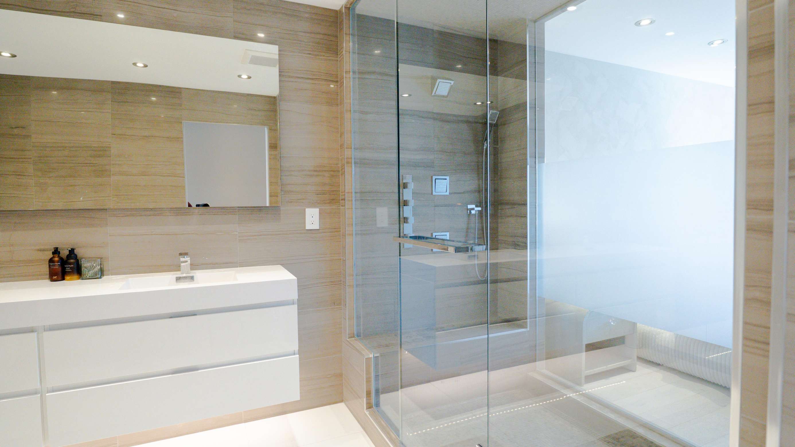 Bathroom 2 - 4-piece double vanity w large glass shower and tub
