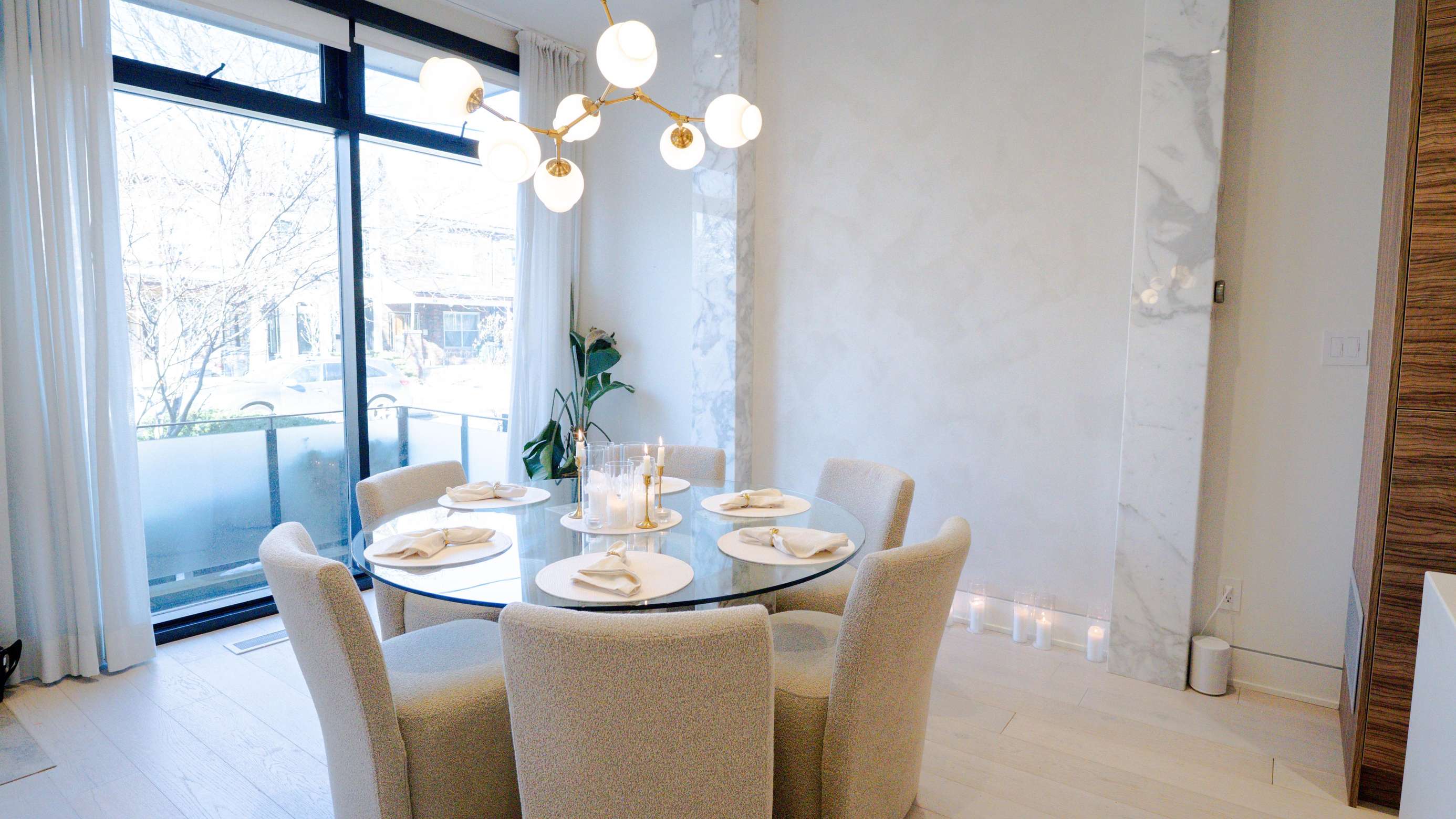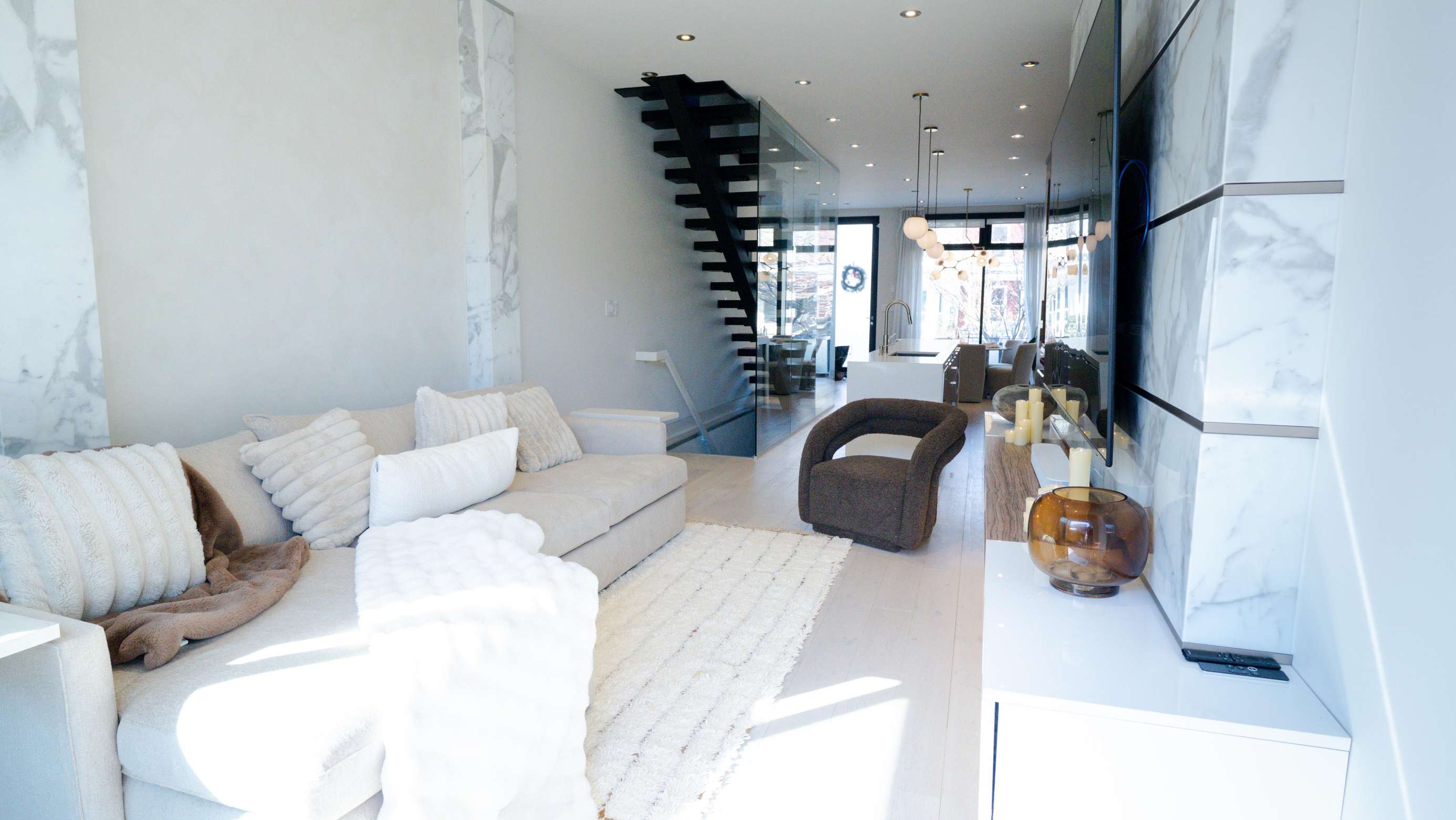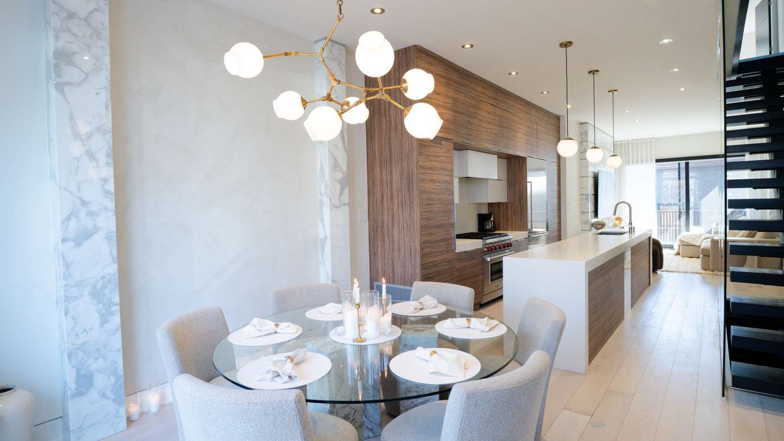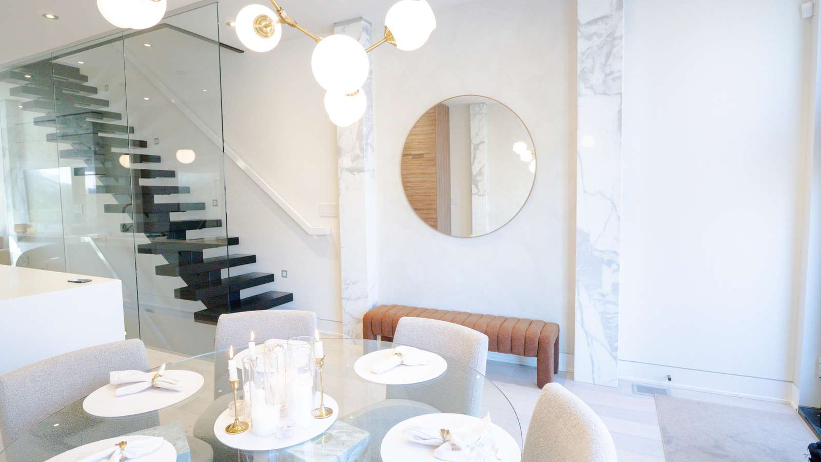 Open-concept dining room with elegant marble accents, sleek floating staircases with glass railings, and designer lighting add refined modern touches throughout