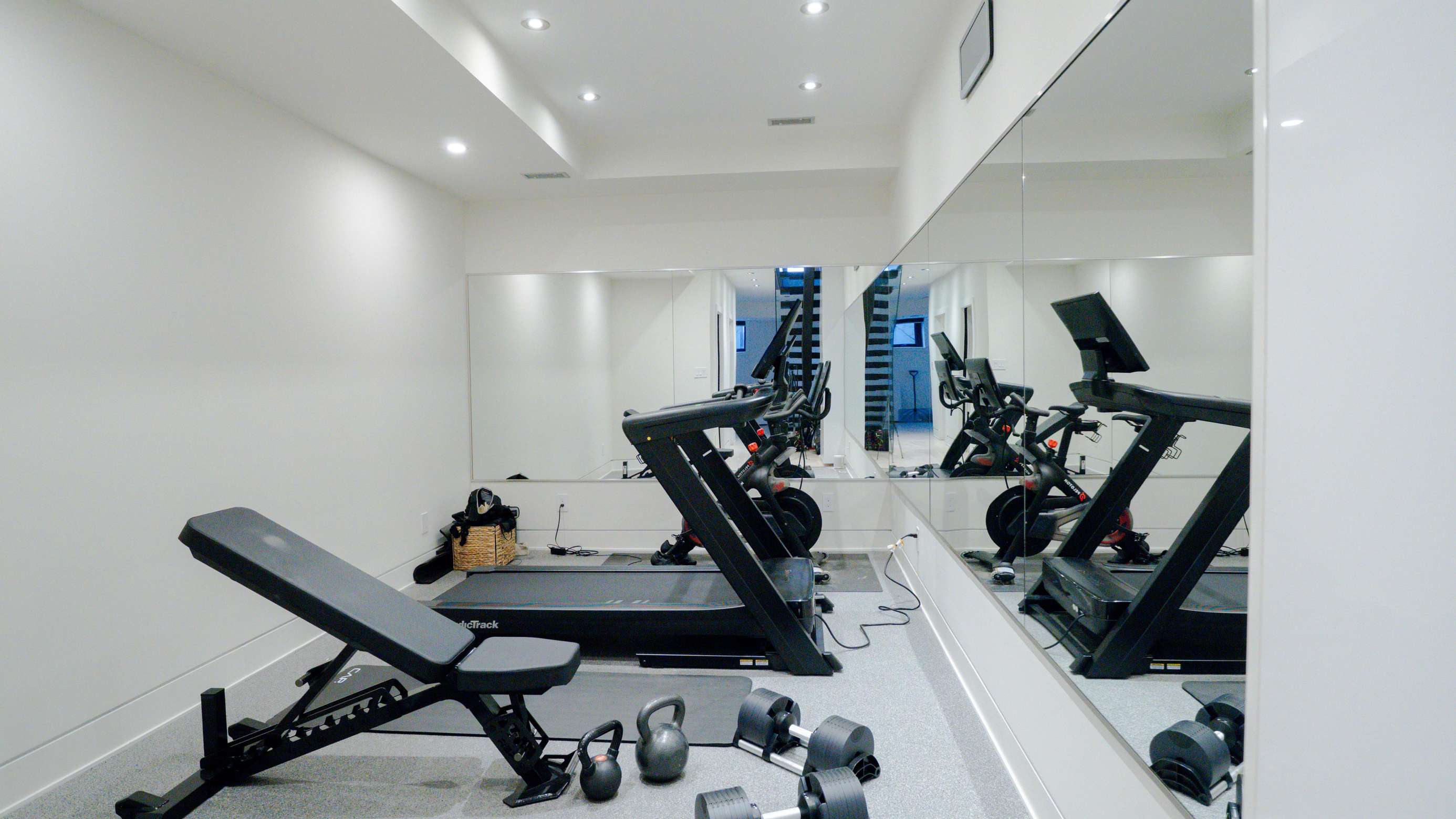 Features rec room with TV and high ceilings as well as separate entrance and fully equipped gym