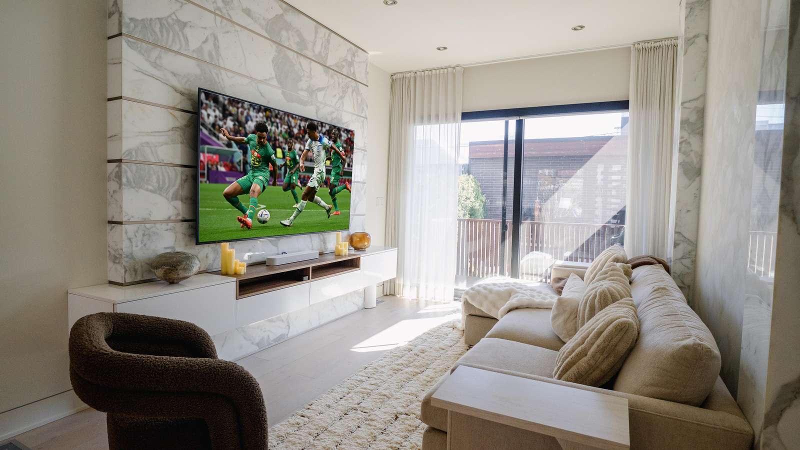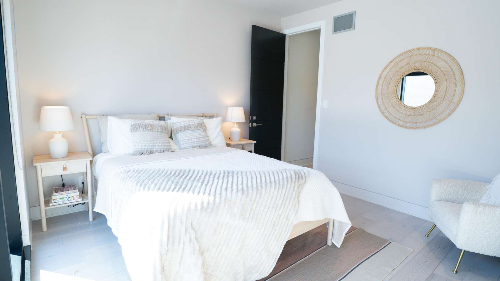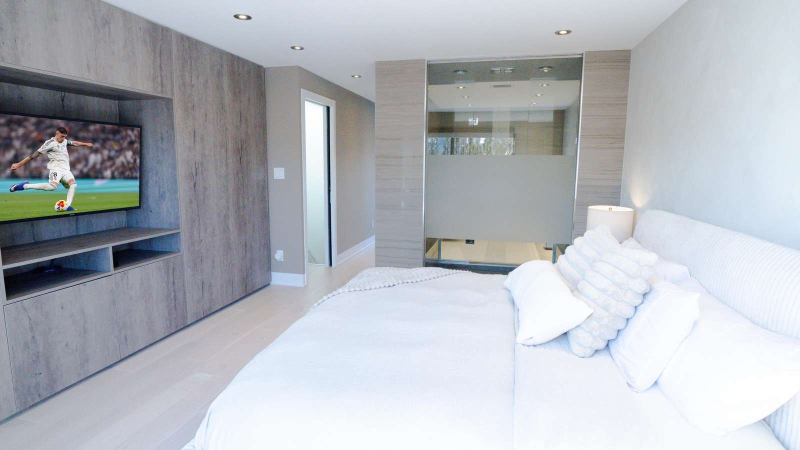 Bright and airy with 10-foot ceilings and floor-to-ceiling windows, the main floor features a dramatic open-concept living room, large screen smart tv, and walkout to deck