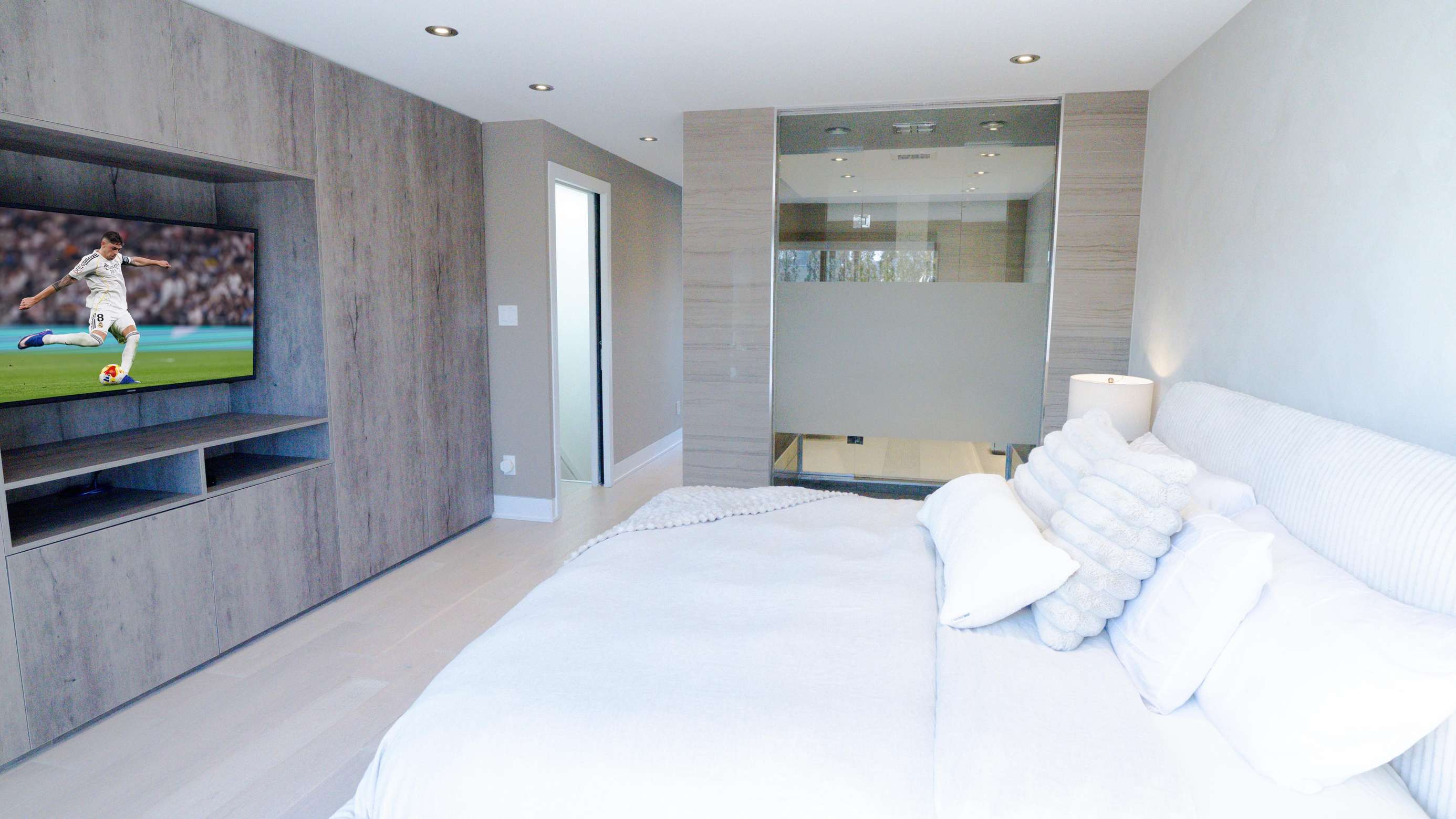 Bedroom 1 - King (Primary) with ensuite, TV, gas/wood-burning fireplace, dressing room and walkout to deck
