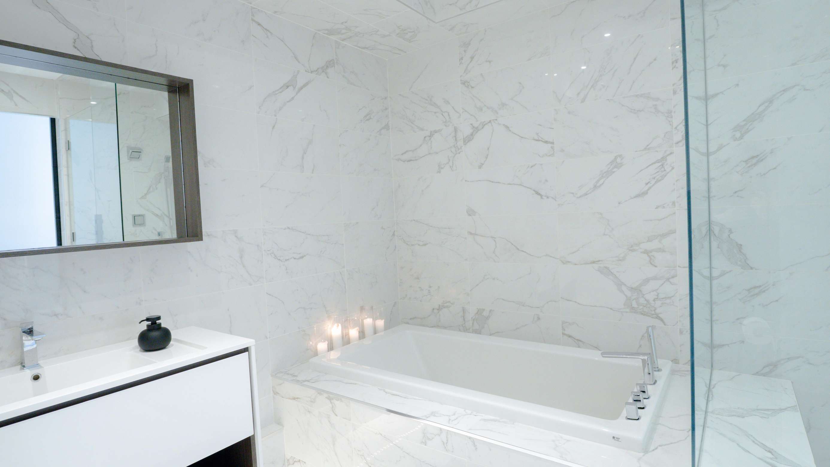 Bathroom 1 - 4-piece primary ensuite with double vanity, double multi jet shower and tub