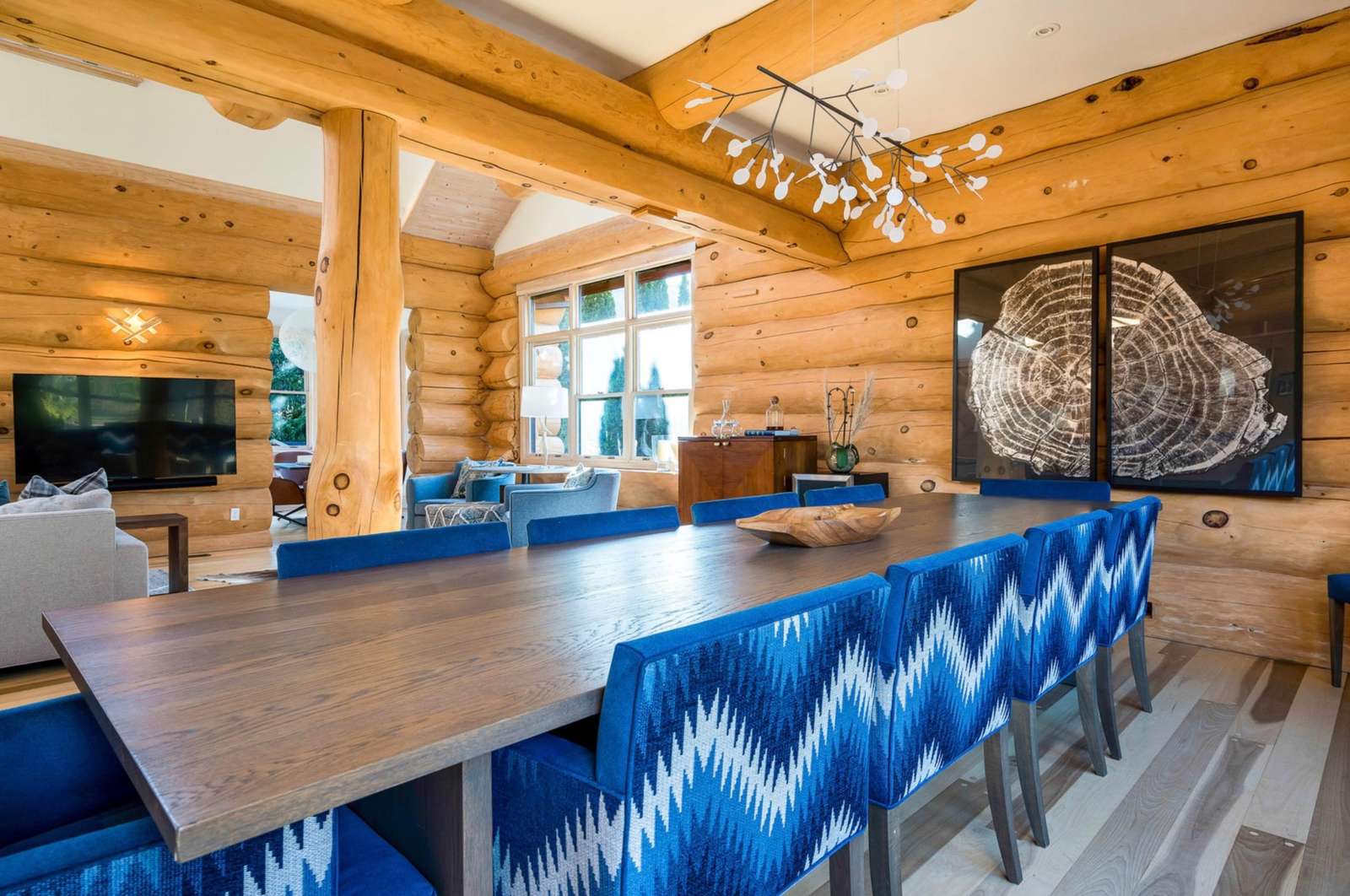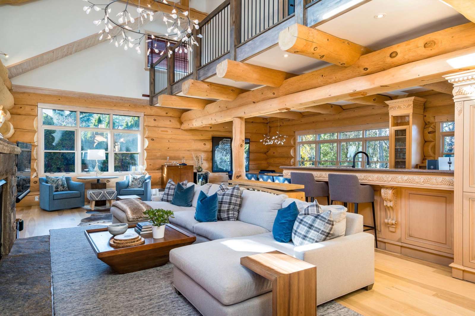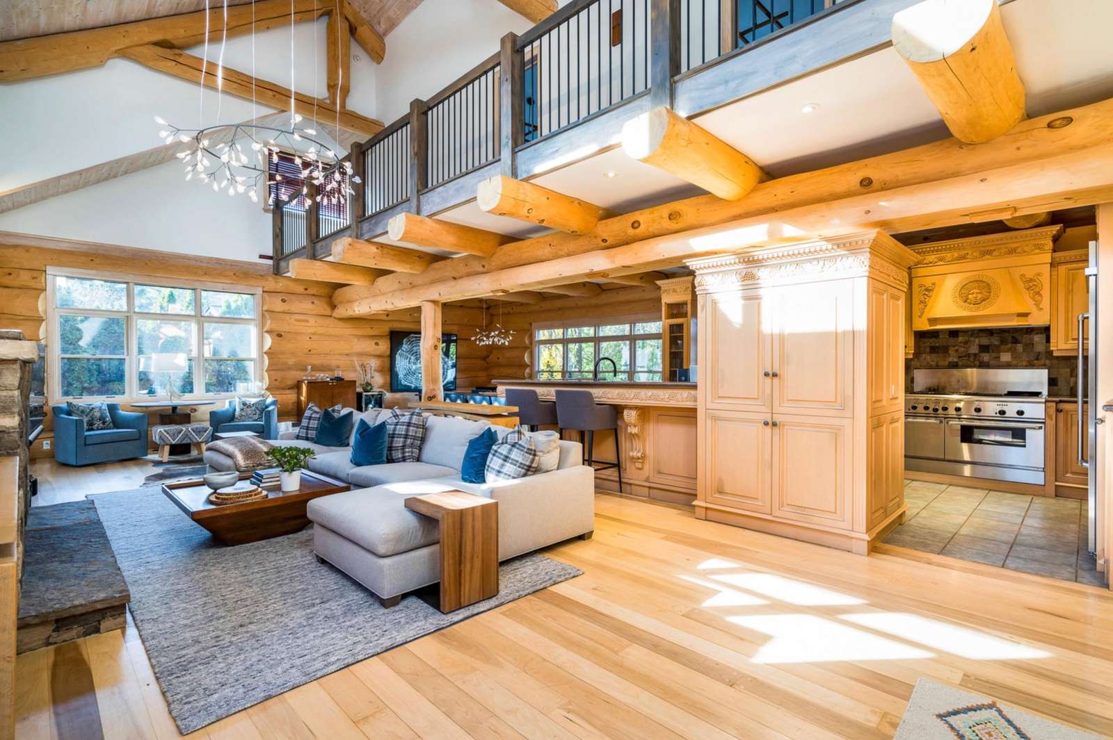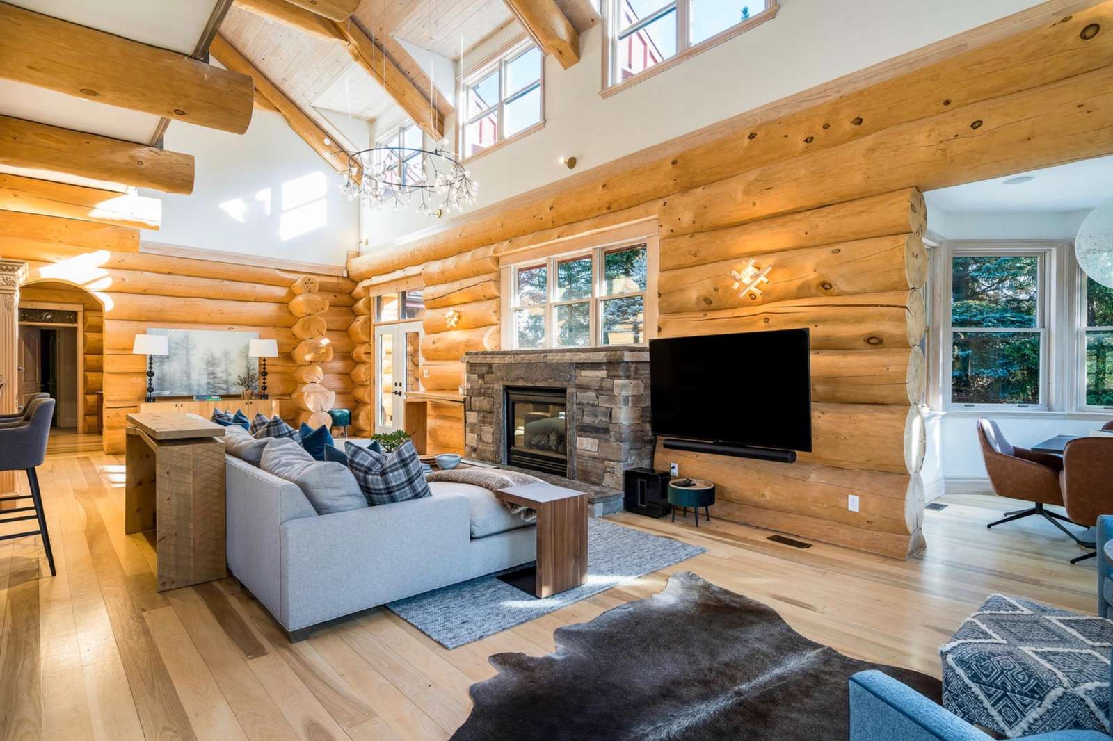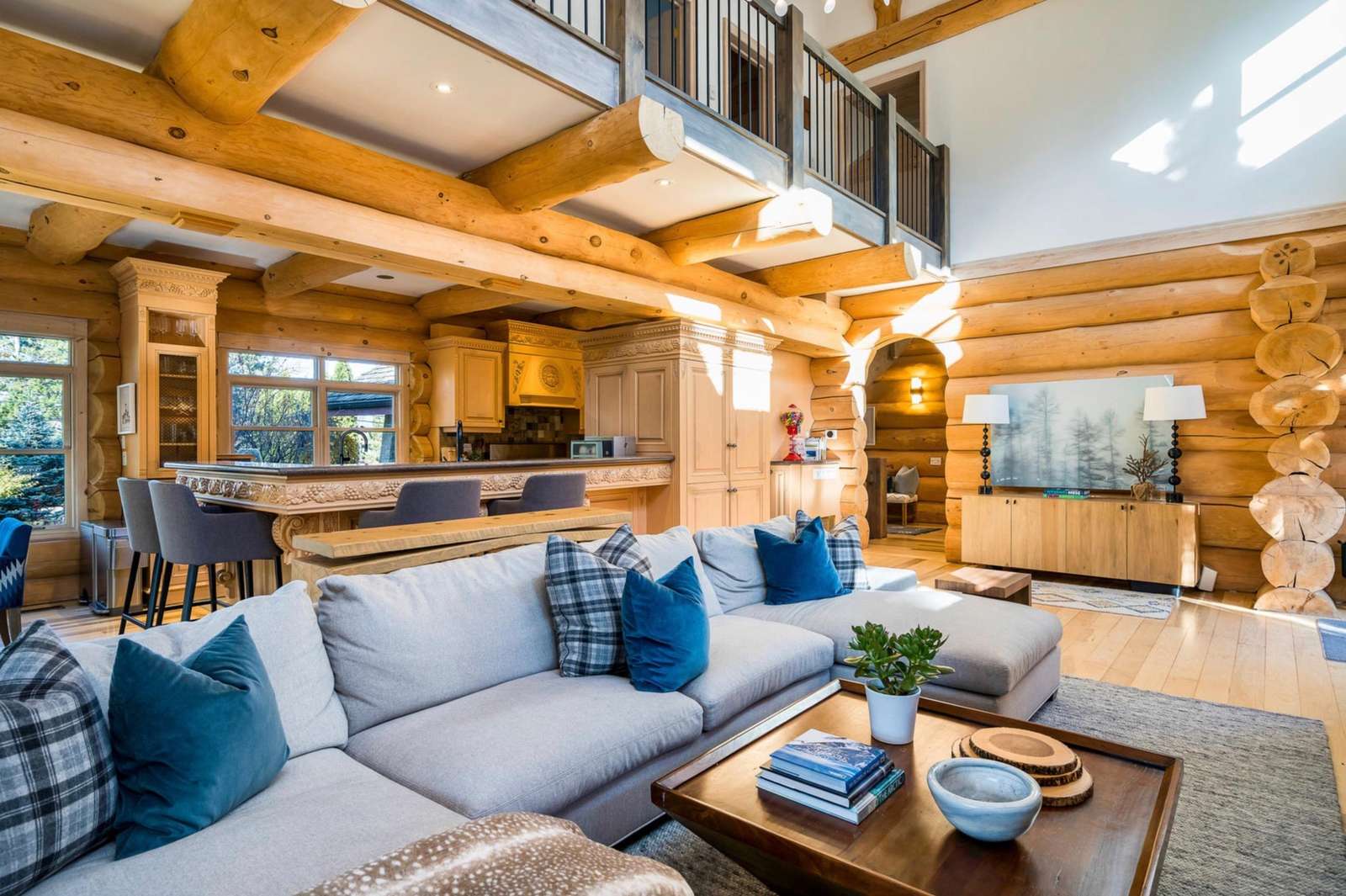 Majestic log and towering ceilings allow for plenty of natural light and views of the ski slopes. Cozy up and watch your favourite movie on the large sectional sofa in front of the stone, gas fireplace. Open to the kitchen and dining areas and the upper loft gives this space a grand feel.