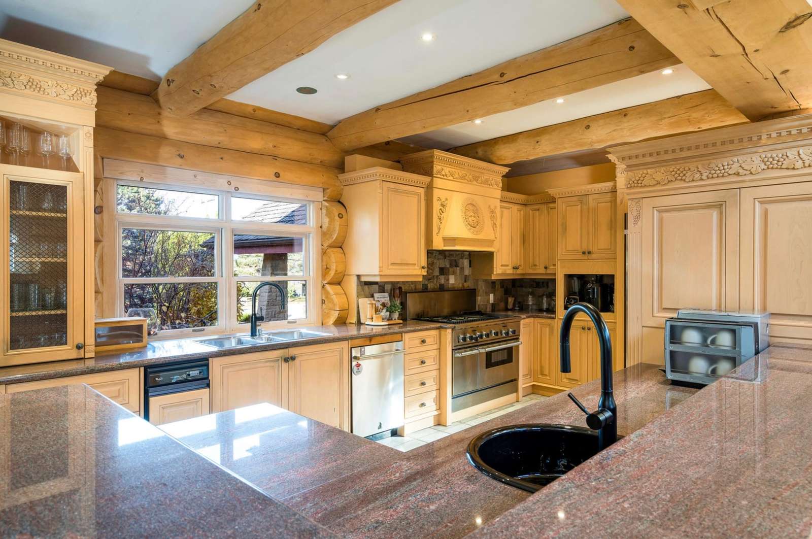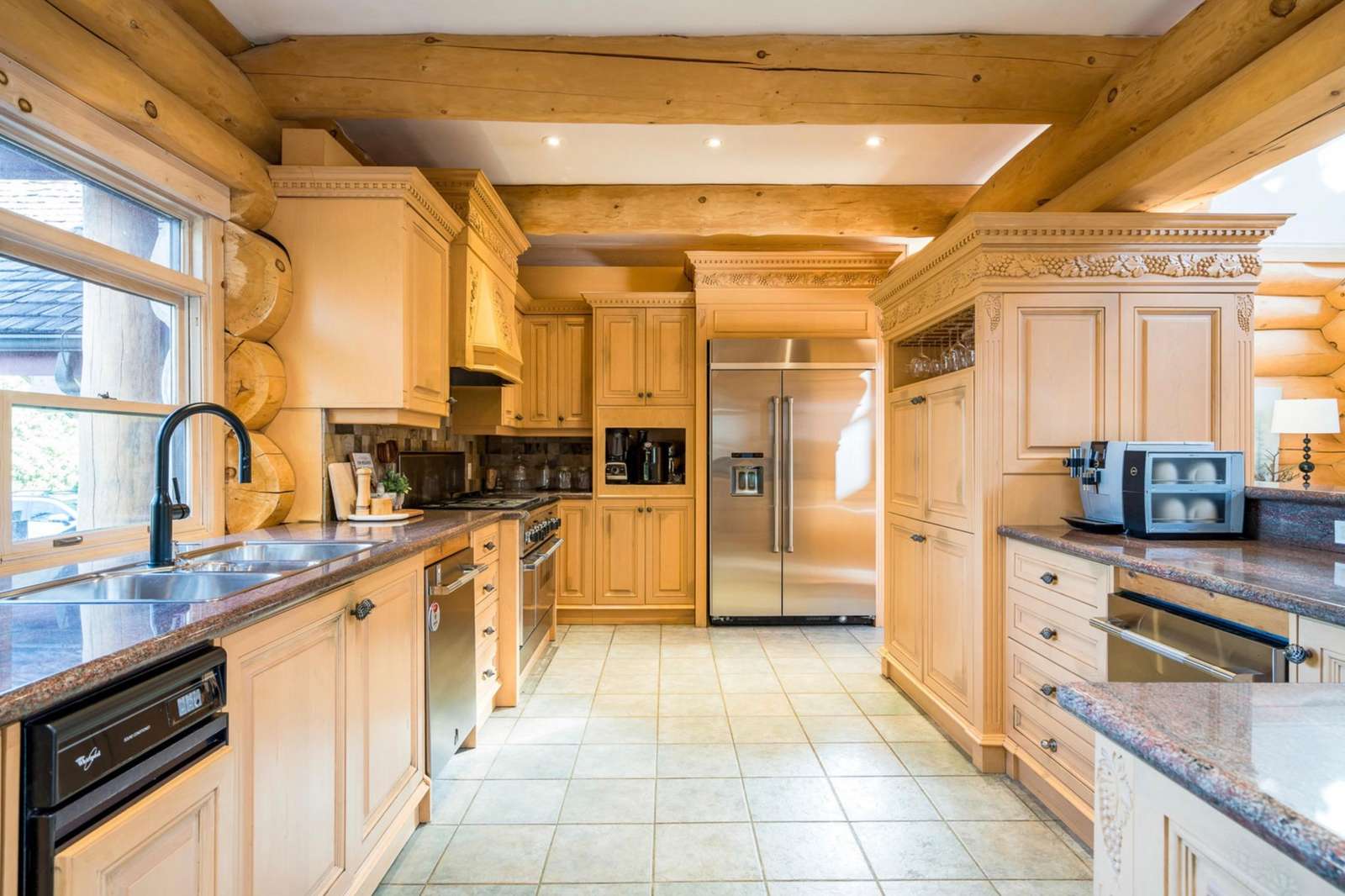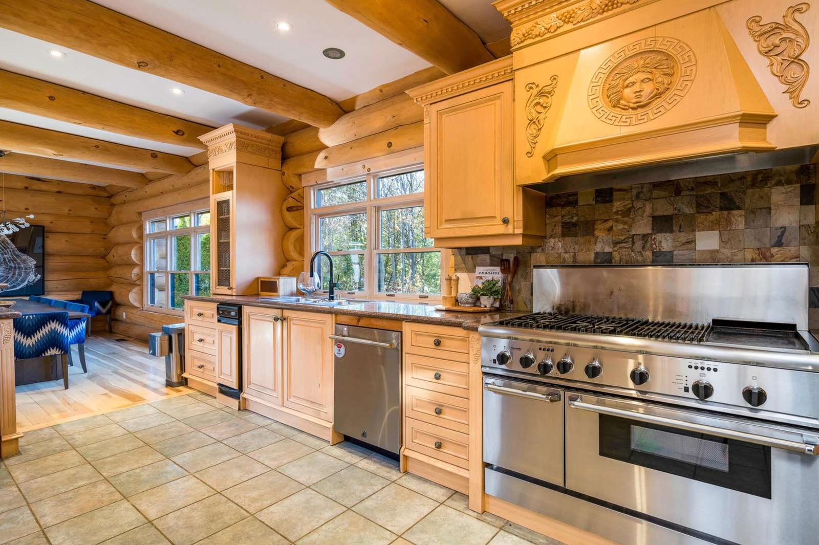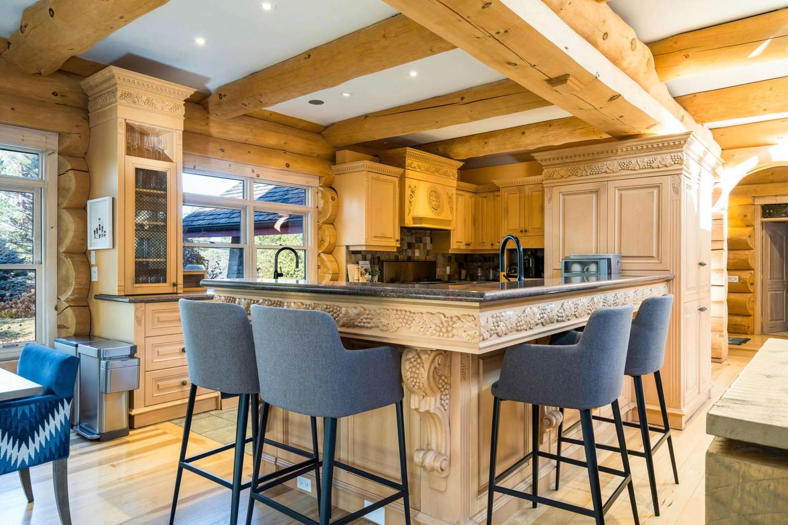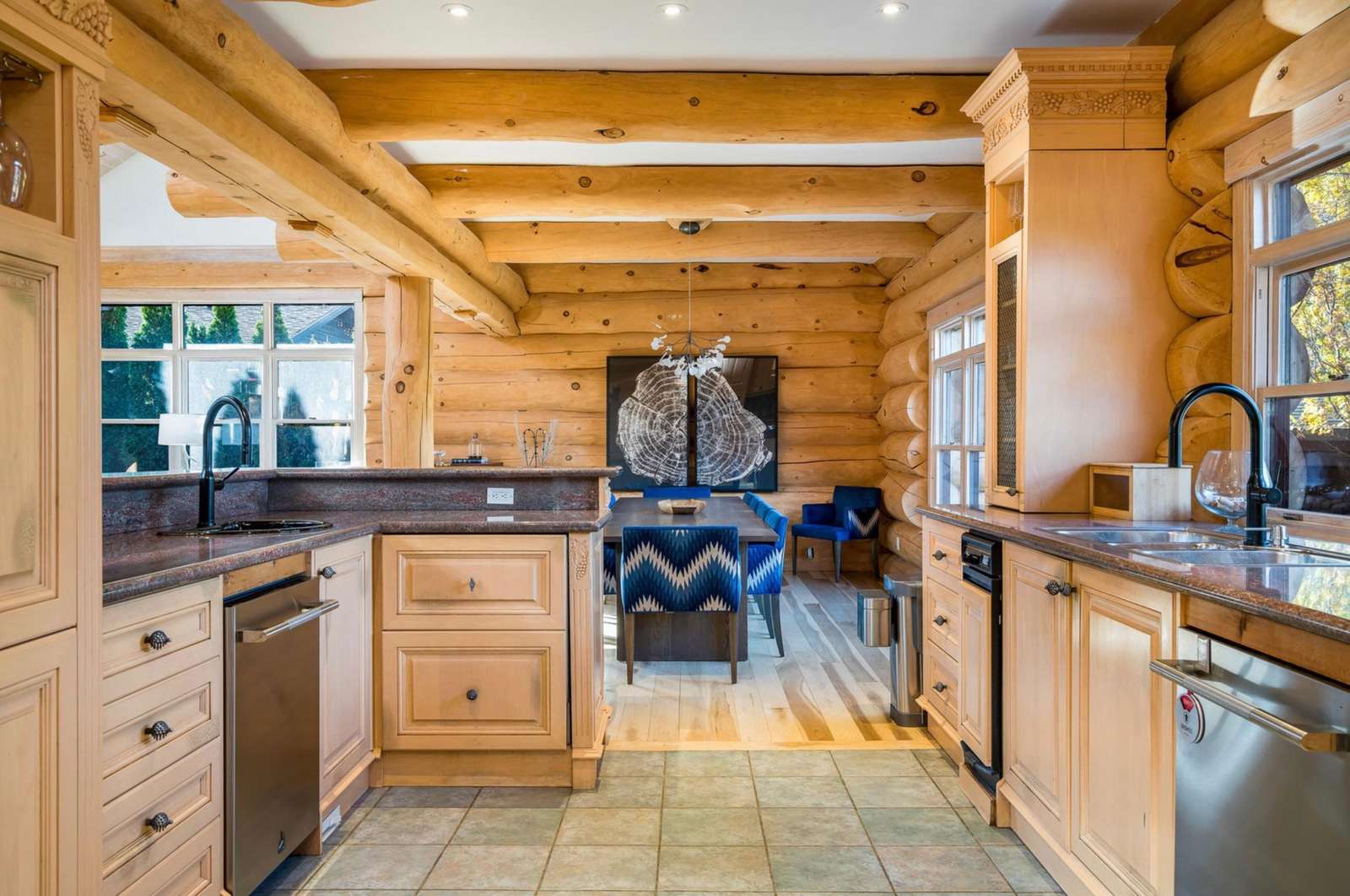 Majestic log and towering ceilings allow for plenty of natural light and views of the ski slopes. Cozy up and watch your favourite movie on the large sectional sofa in front of the stone, gas fireplace. Open to the kitchen and dining areas and the upper loft gives this space a grand feel.