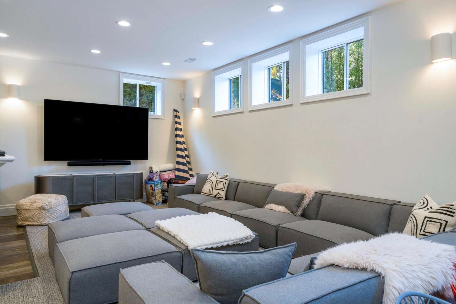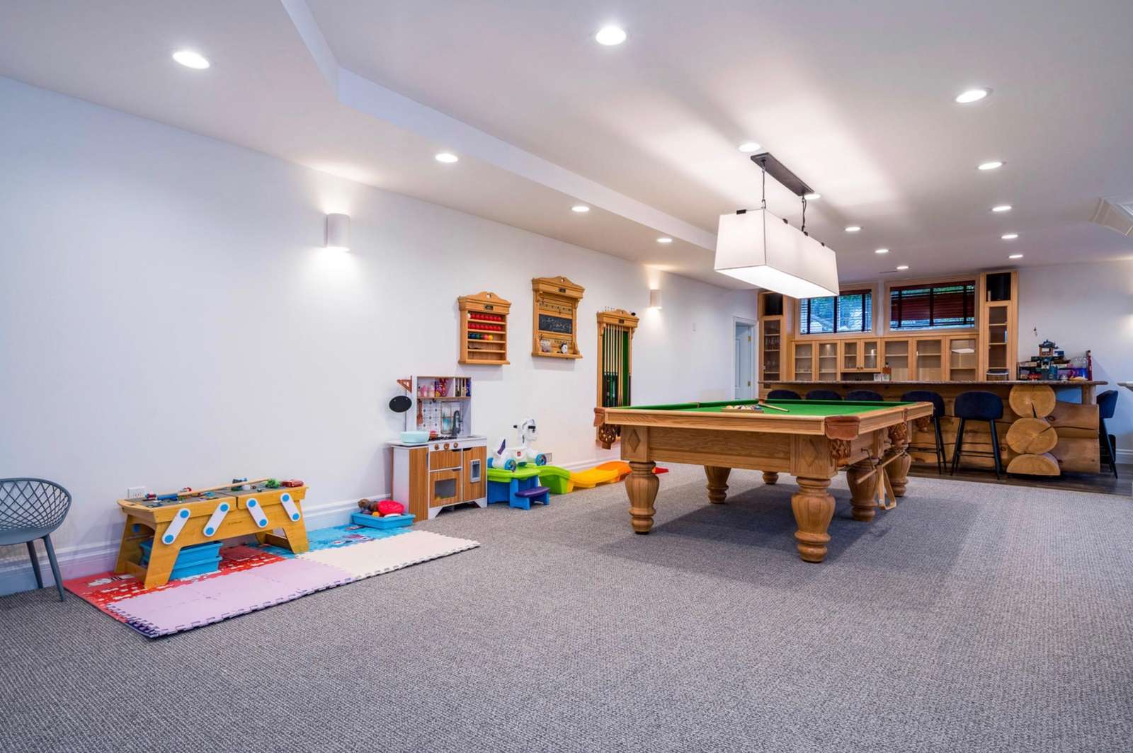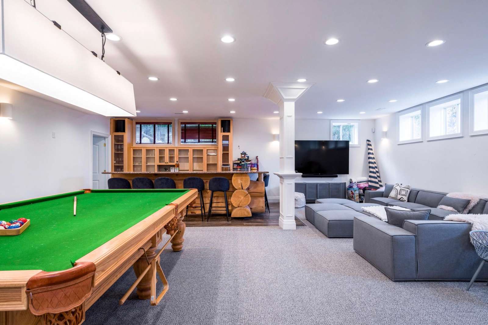 The lower level comes equipped with a full games room with pool table, darts, wet bar with 8 bar stools , cozy seating around flat screen tv, steam room and ski/storage lockers with access to the outside.