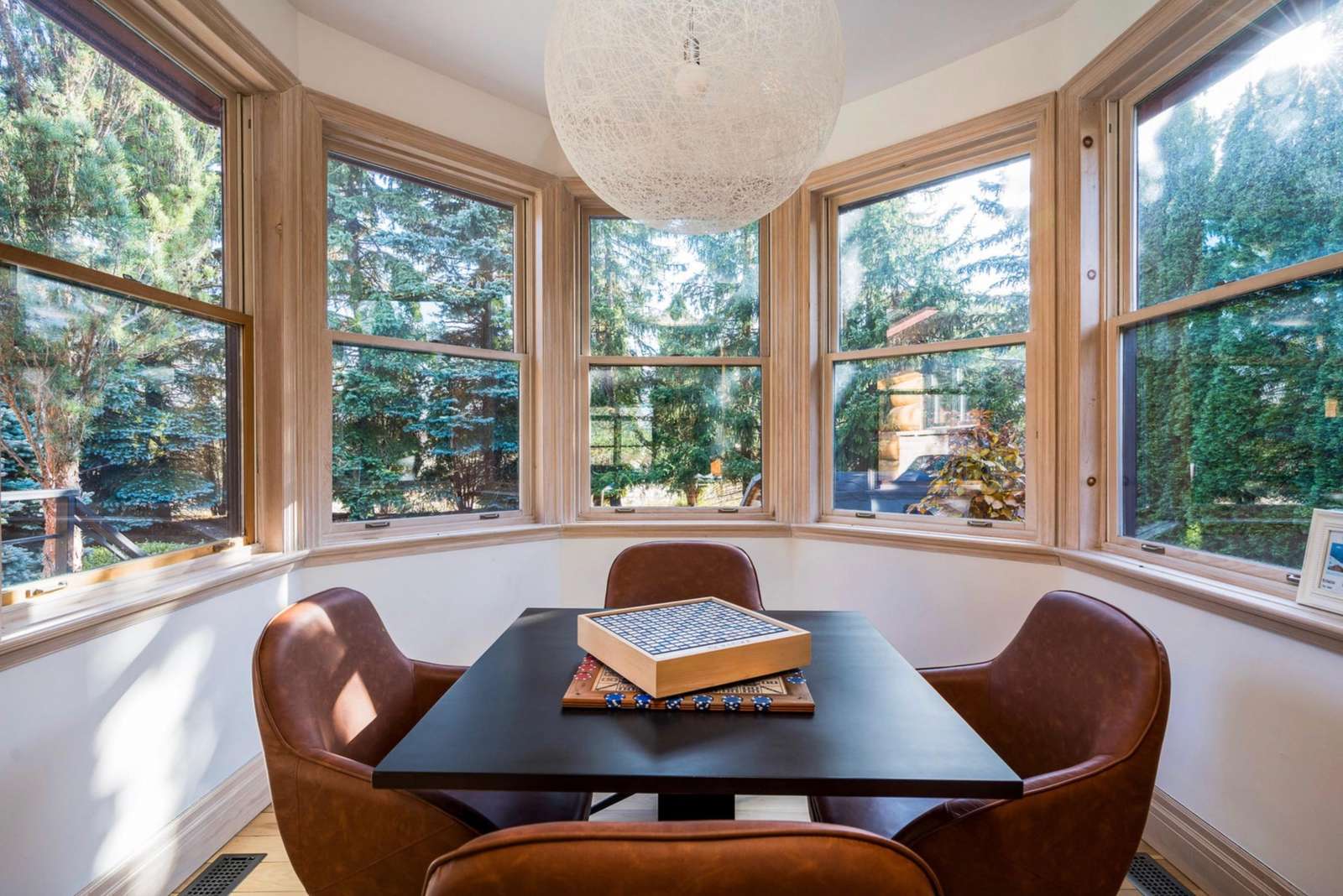 Beautiful, bright sun room surrounded by windows bringing in plenty of natural light. A round table with 4 chairs. A great spot to enjoy your morning coffee or your favourite board game.