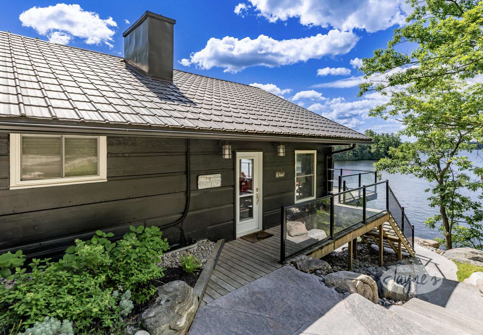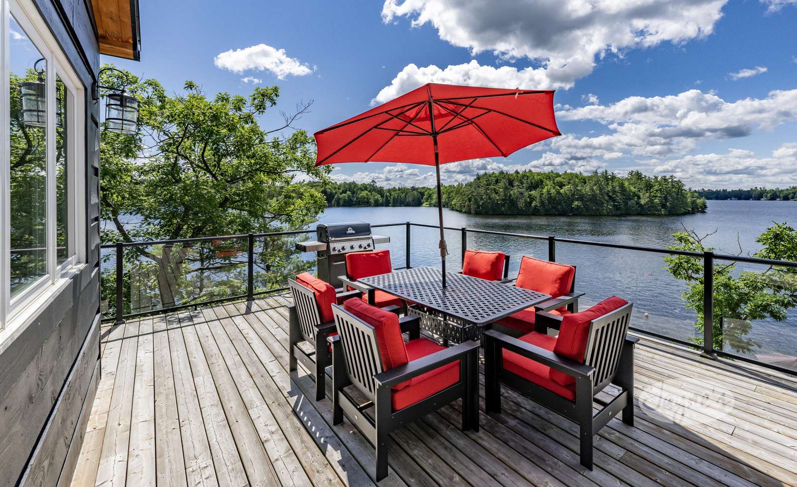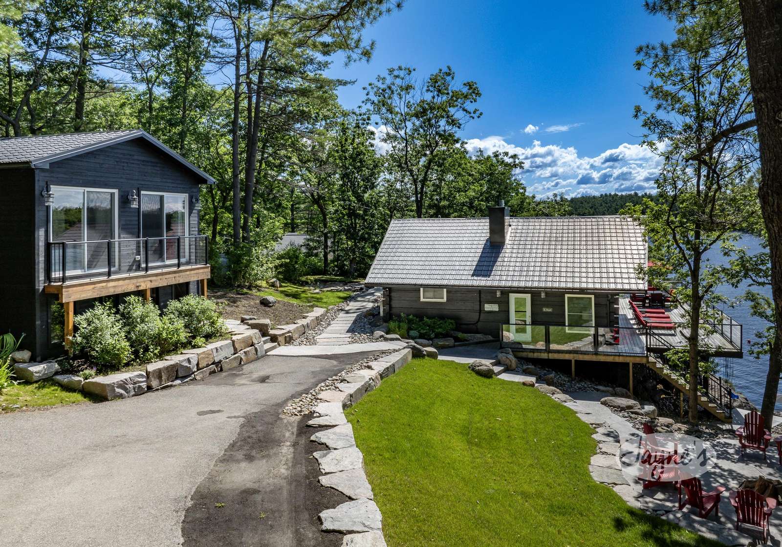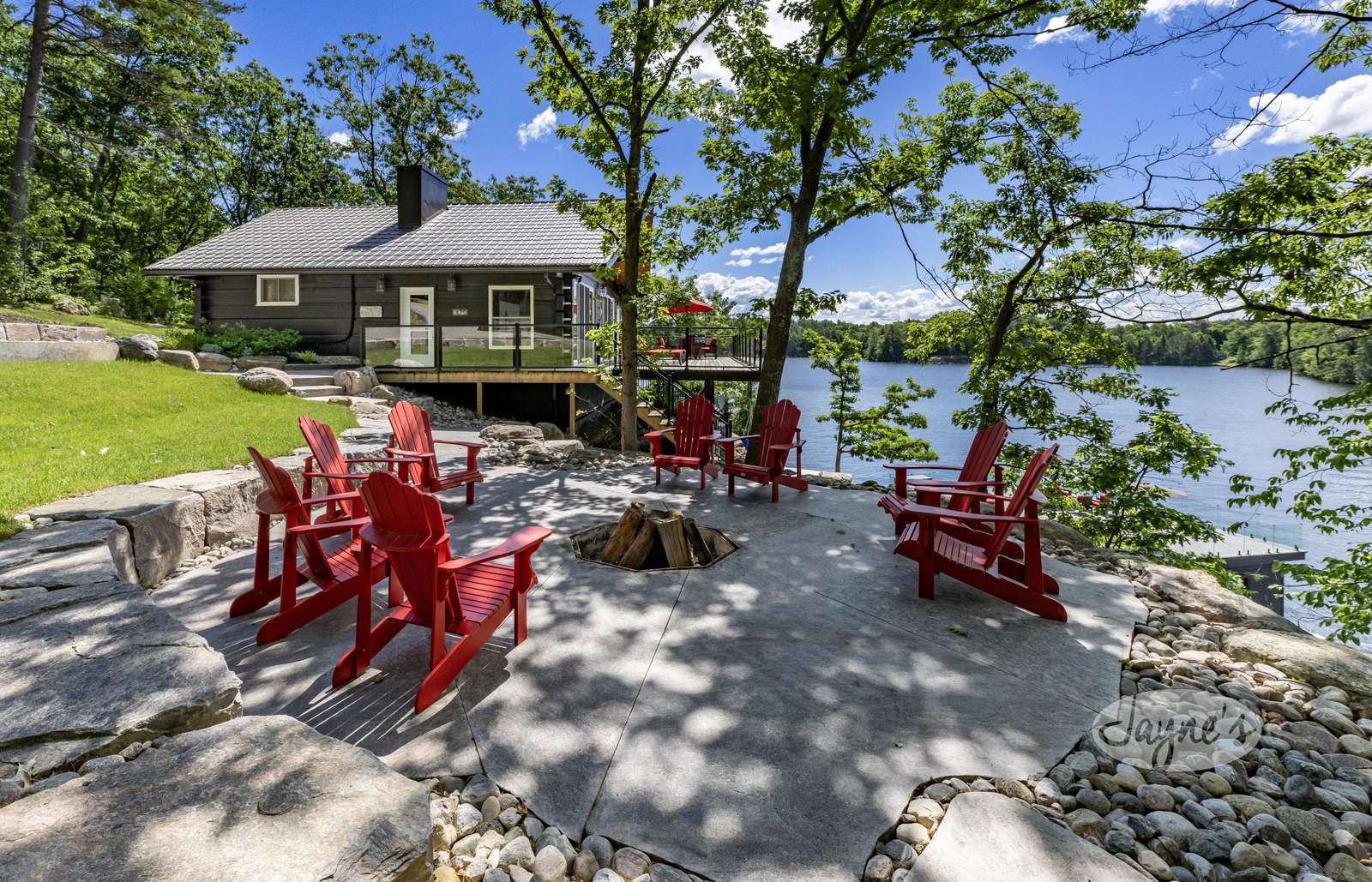 THE CANADIAN DREAM - Perched among the trees on the rugged landscape, The Canadian Dream has been distinctly decorated with modern natural touches with a element of polish. Sweeping views of Lake Muskoka and south west exposure generate all day sun and beautiful sunsets! A two level deck surrounds the cottage with easy stair access to the water and a generous sized dock. The cottage grounds also include a built in area for bonfires, a life size chess board, and screened in gazebo to shield from the elements!