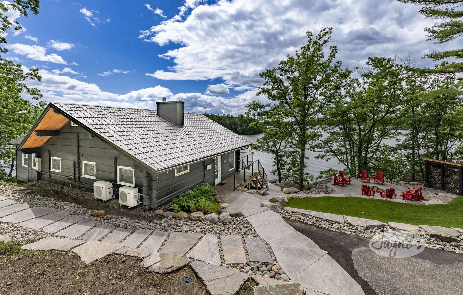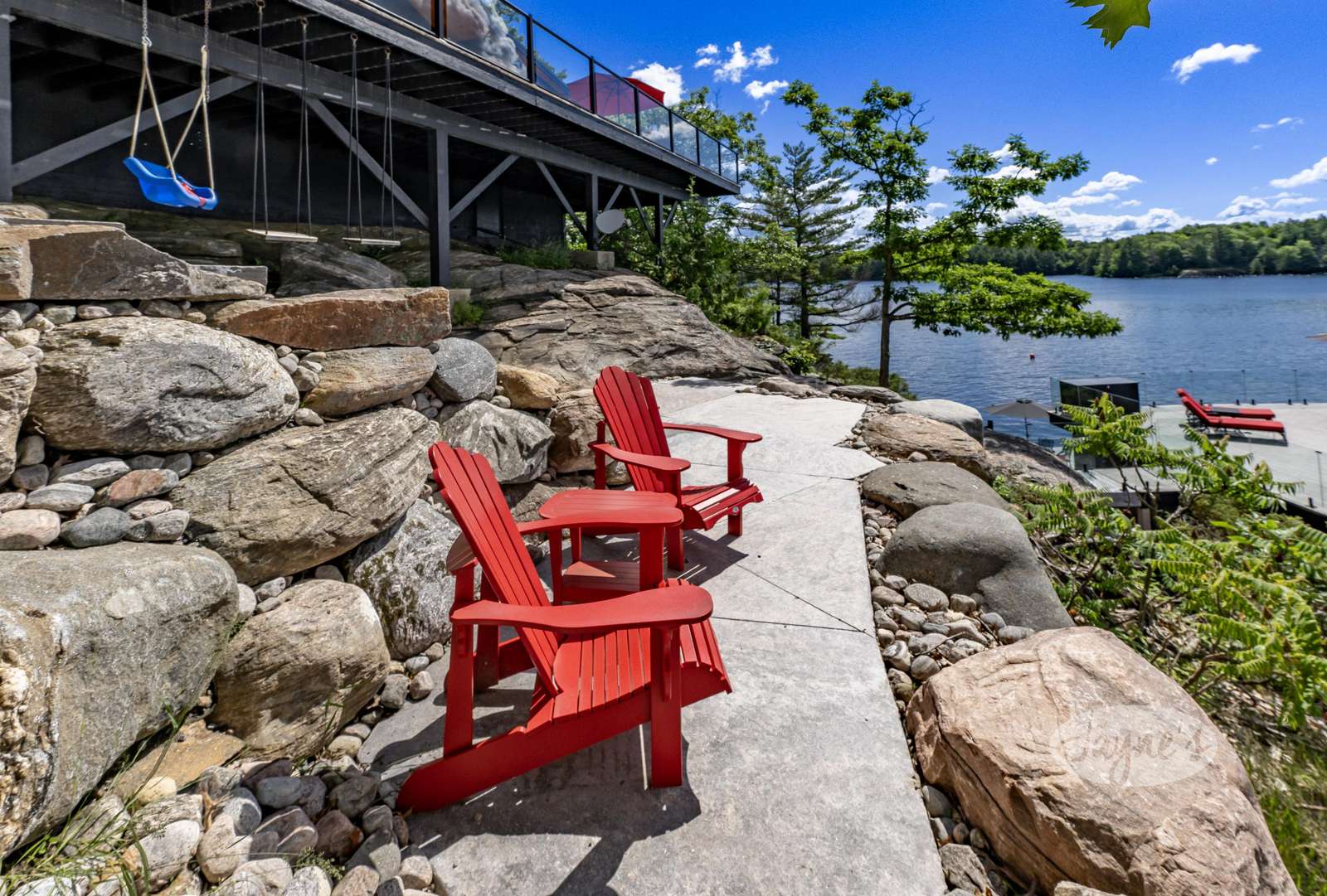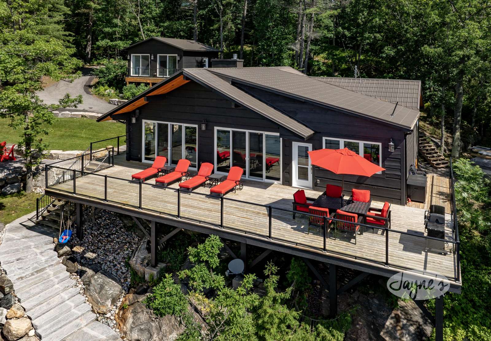 THE CANADIAN DREAM - Perched among the trees on the rugged landscape, The Canadian Dream has been distinctly decorated with modern natural touches with a element of polish. Sweeping views of Lake Muskoka and south west exposure generate all day sun and beautiful sunsets! A two level deck surrounds the cottage with easy stair access to the water and a generous sized dock. The cottage grounds also include a built in area for bonfires, a life size chess board, and screened in gazebo to shield from the elements!