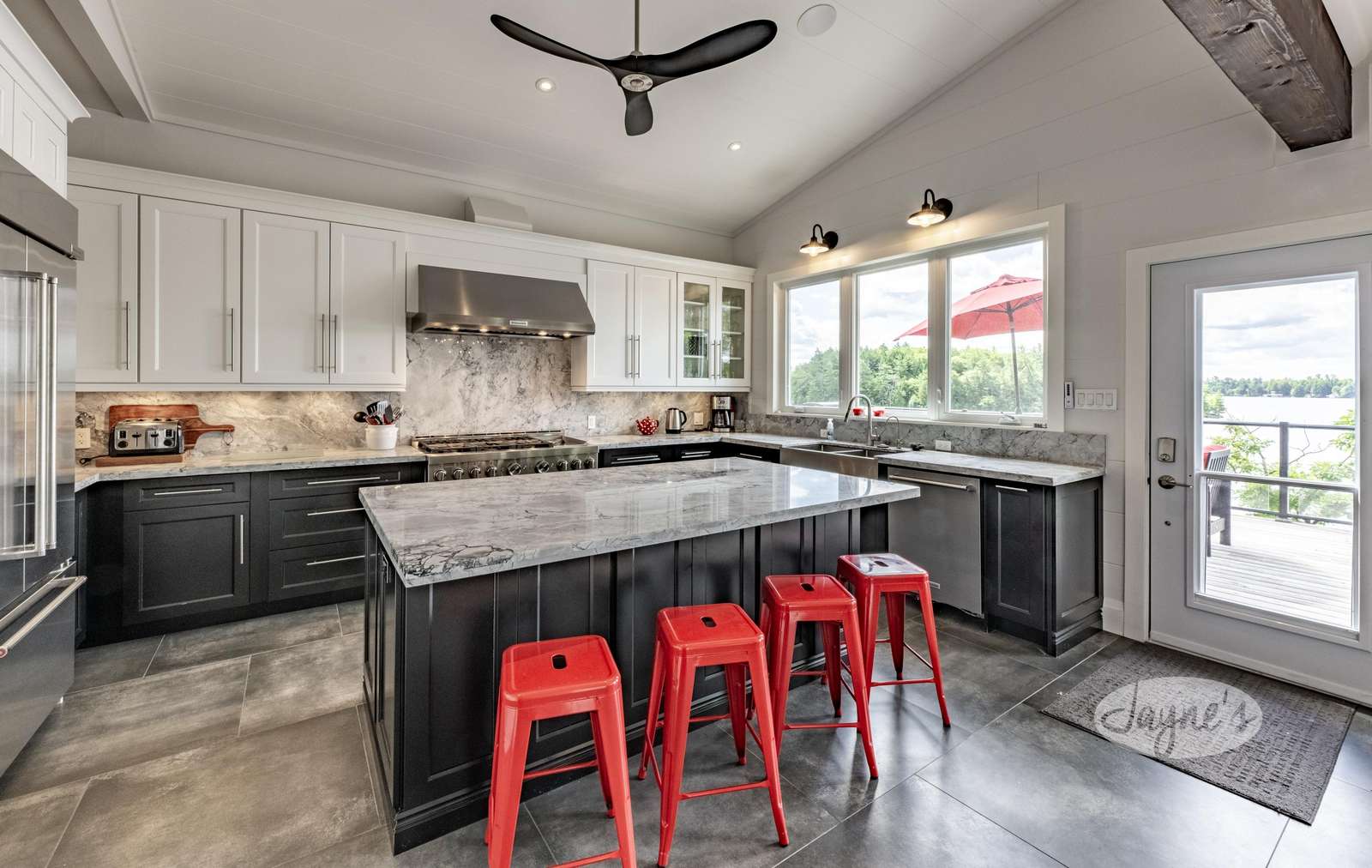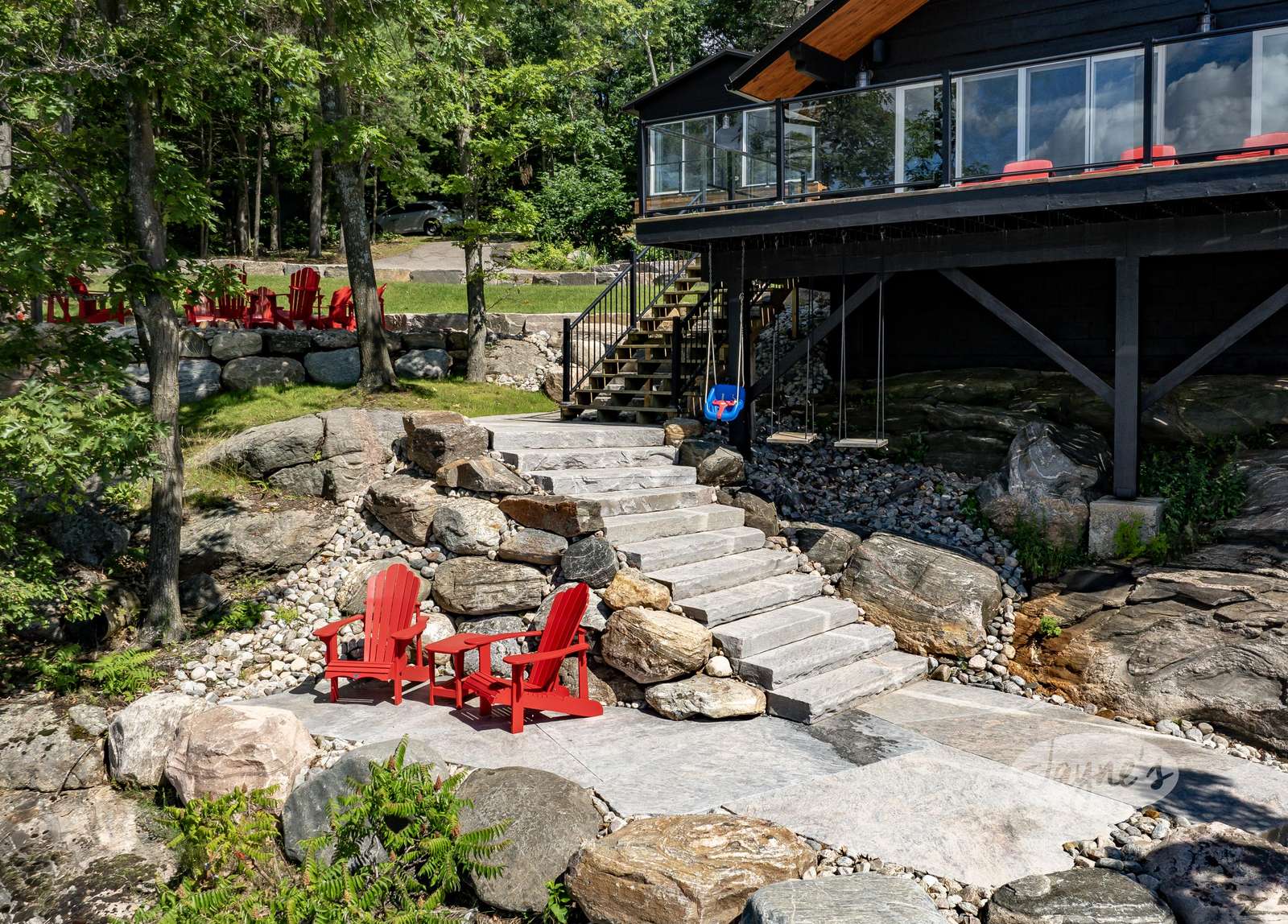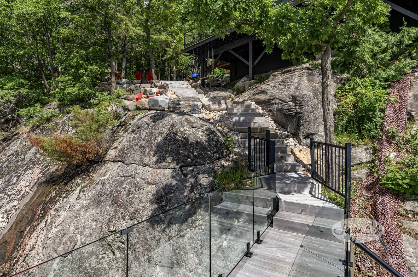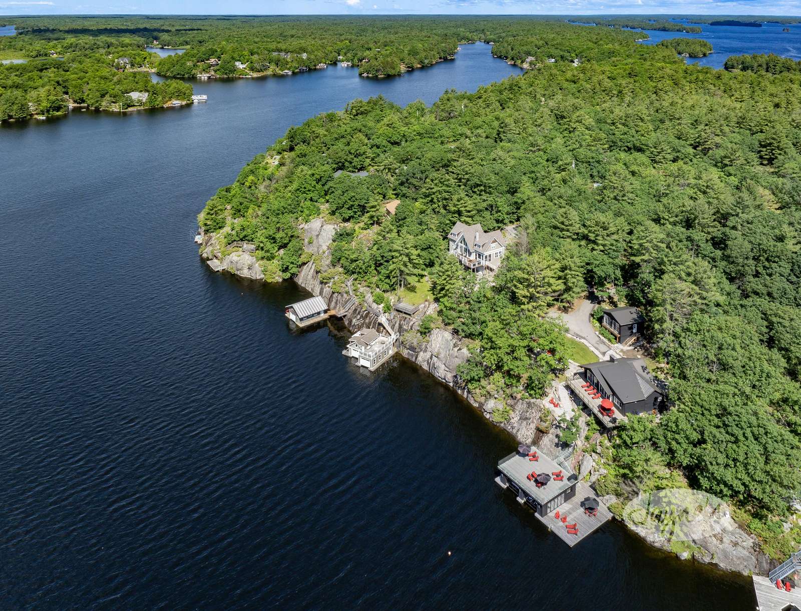 THE CANADIAN DREAM - Perched among the trees on the rugged landscape, The Canadian Dream has been distinctly decorated with modern natural touches with a element of polish. Sweeping views of Lake Muskoka and south west exposure generate all day sun and beautiful sunsets! A two level deck surrounds the cottage with easy stair access to the water and a generous sized dock. The cottage grounds also include a built in area for bonfires, a life size chess board, and screened in gazebo to shield from the elements!
