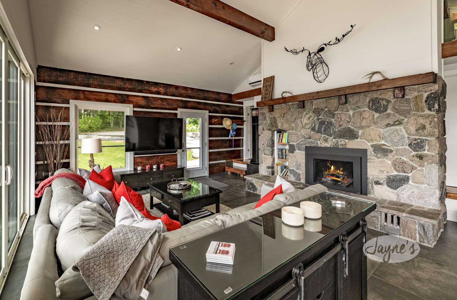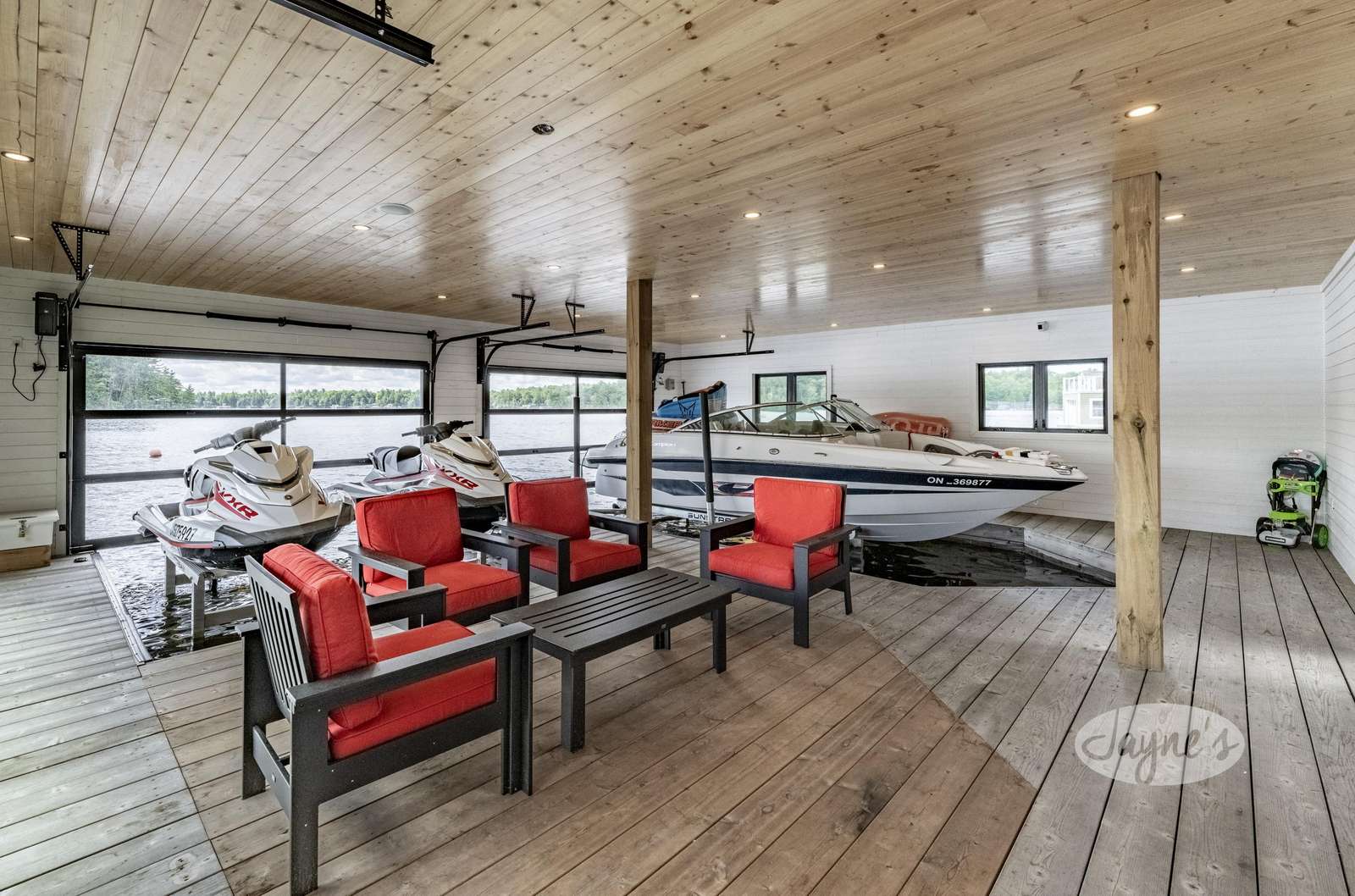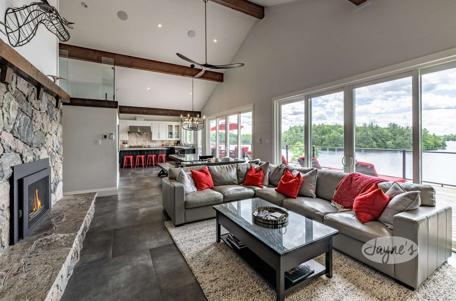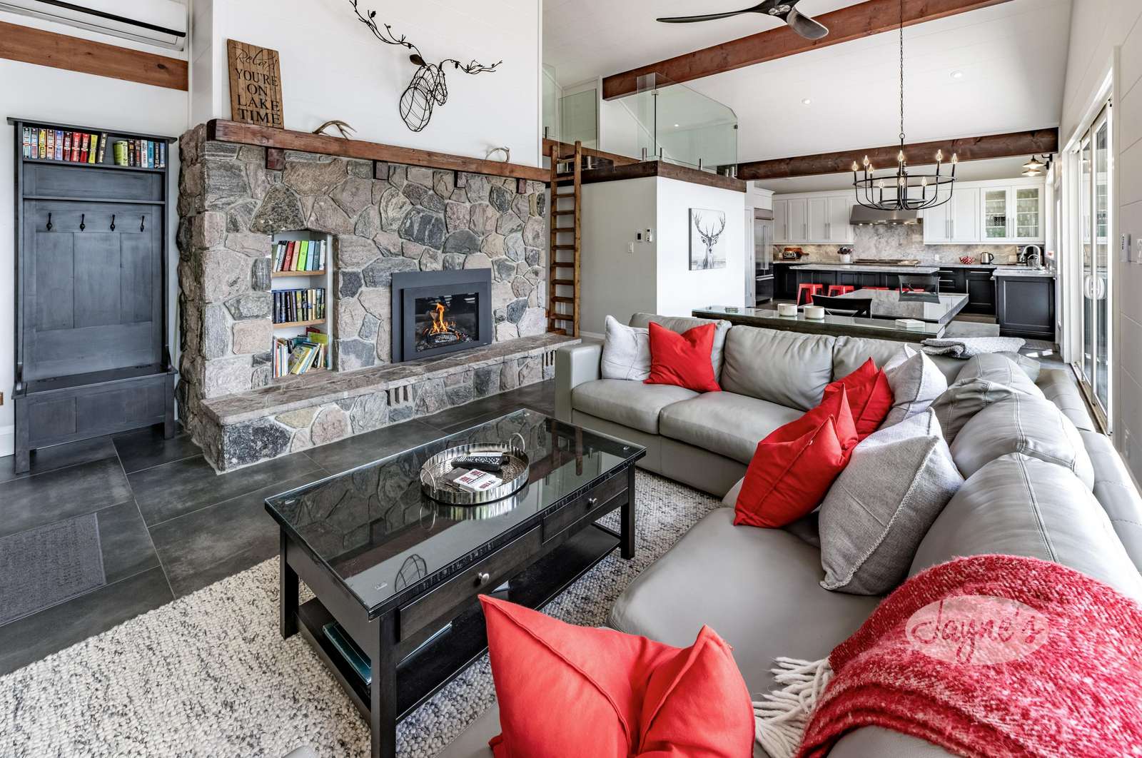 Boasts vaulted ceilings lined with pine beams and a lovely stone gas fireplace. Large patio doors and windows along entire waterfront side offering stunning view of Lake Muskoka. Ceramic radiant heated flooring throughout. A fun reading hangout space with a bean bag overlooks the great room through glass railings and is only accessible by ladder!