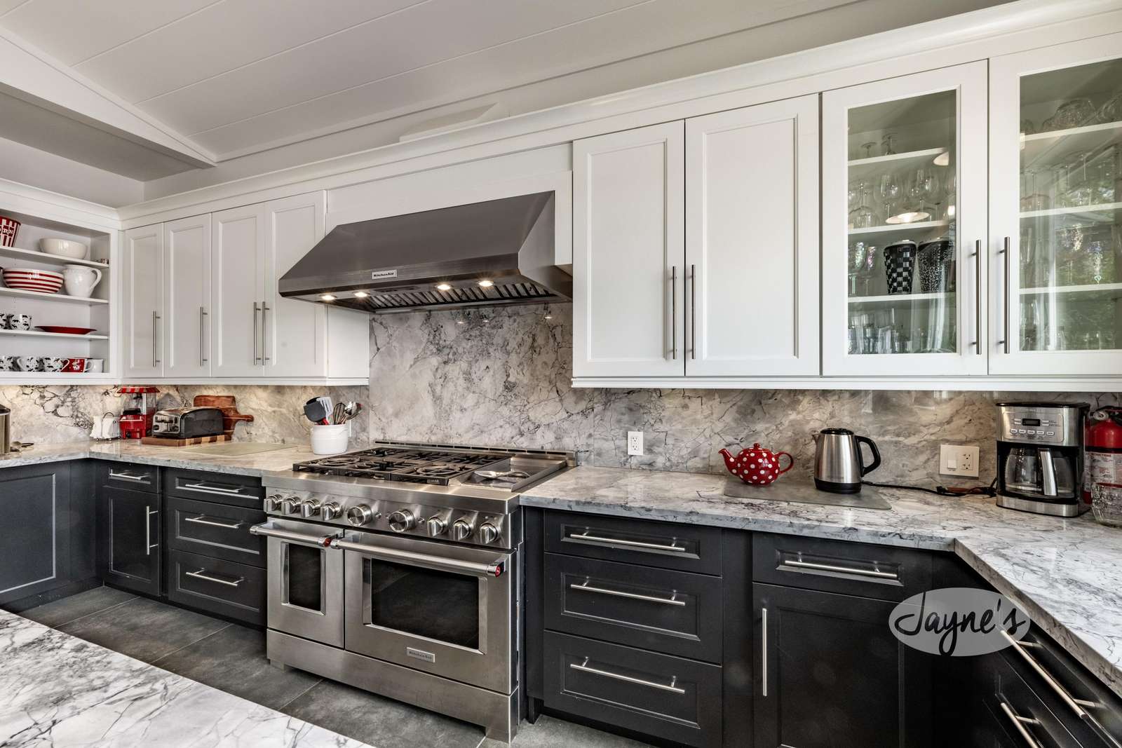 Features stainless steel high-end appliances including a double door fridge & freezer and commercial style 6 burner/double oven and gas range. Marble countertops adorn the kitchen throughout.