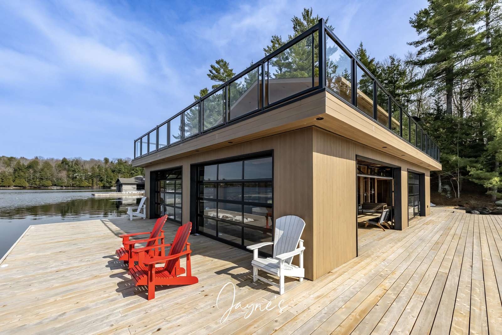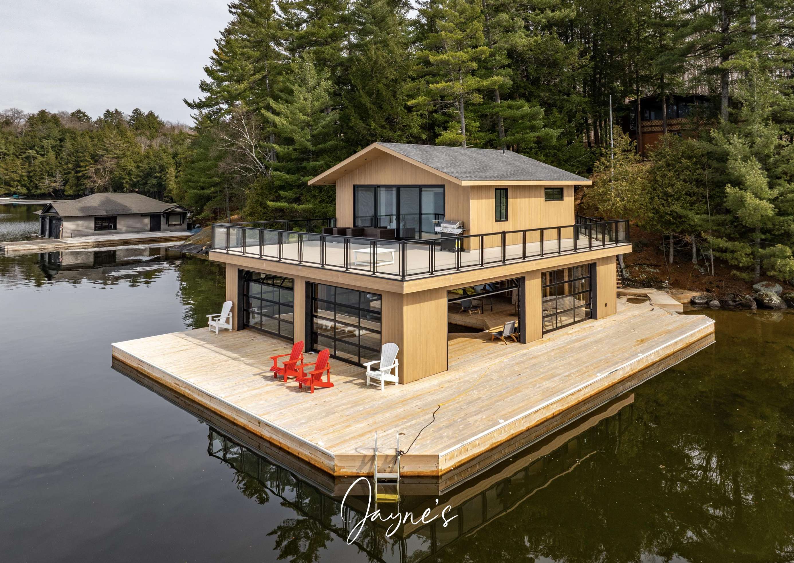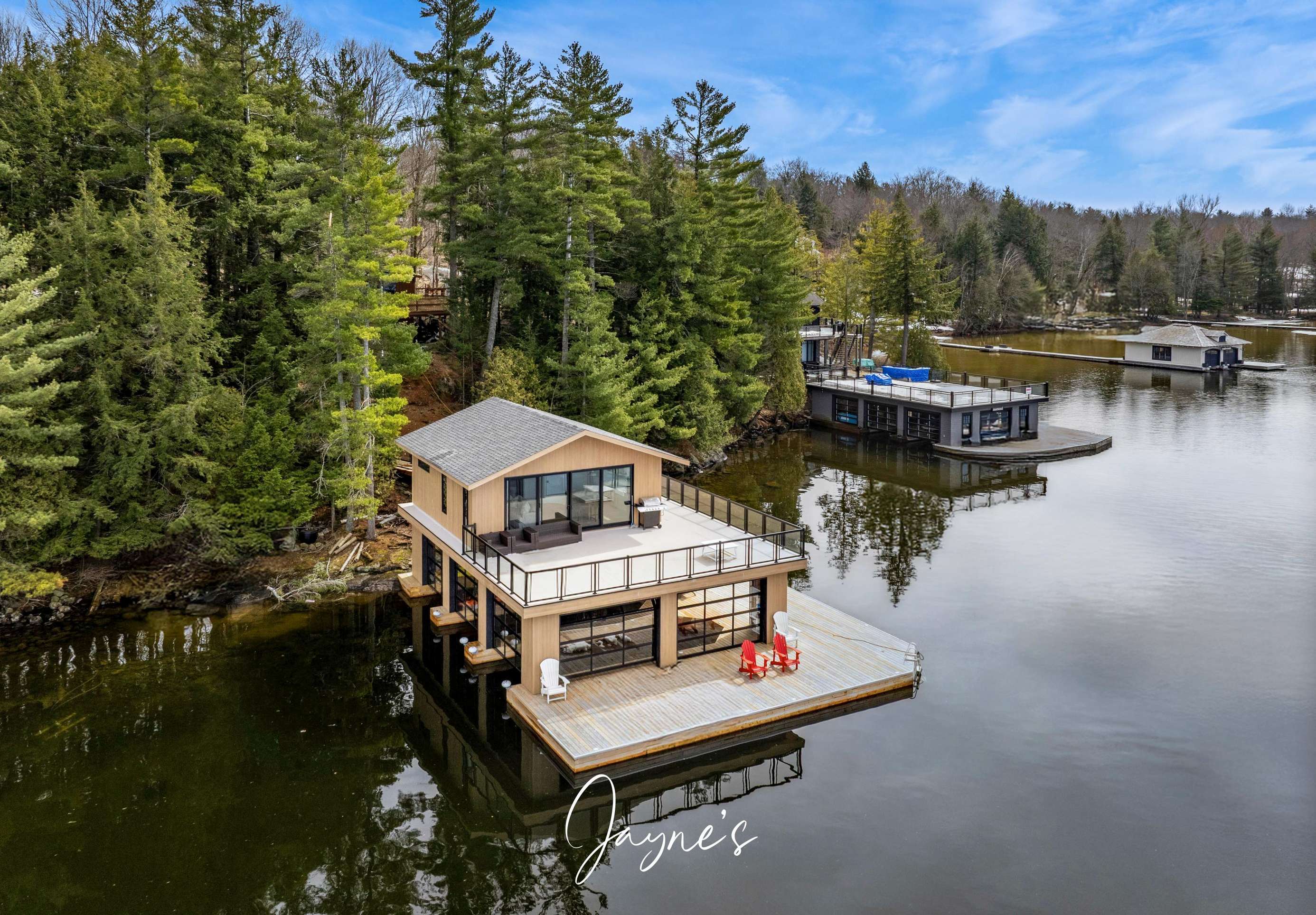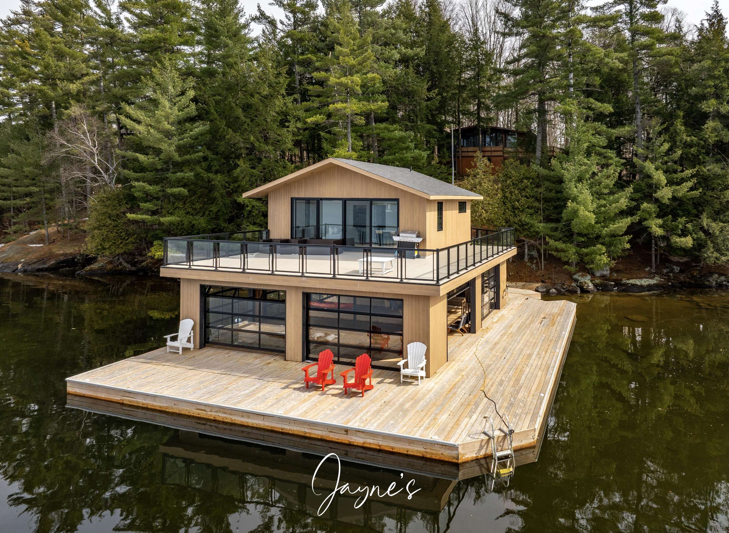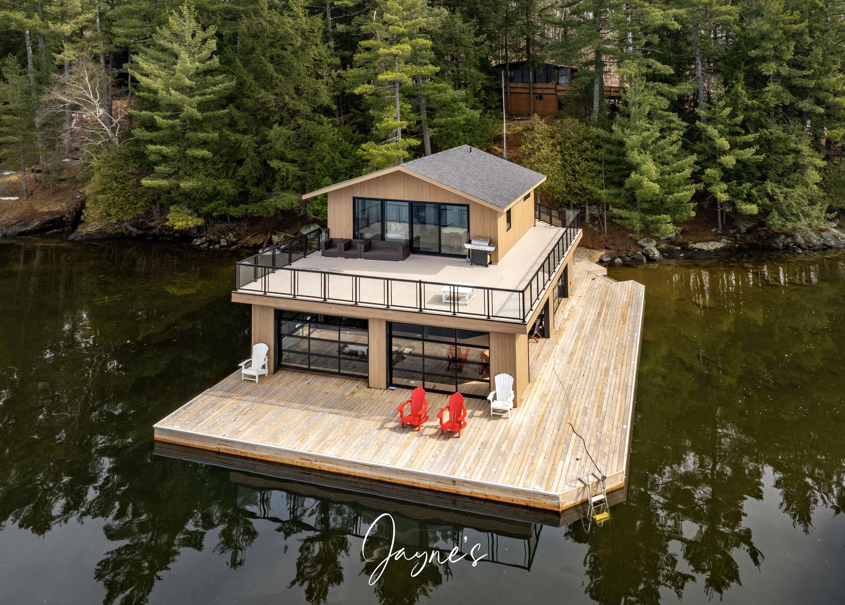 The boathouse is furnished with a new couch, 2 club chairs, a small TV, 4 person dining room table, and a kitchenette with a fridge, sink, dishwasher and a walkout to the deck.