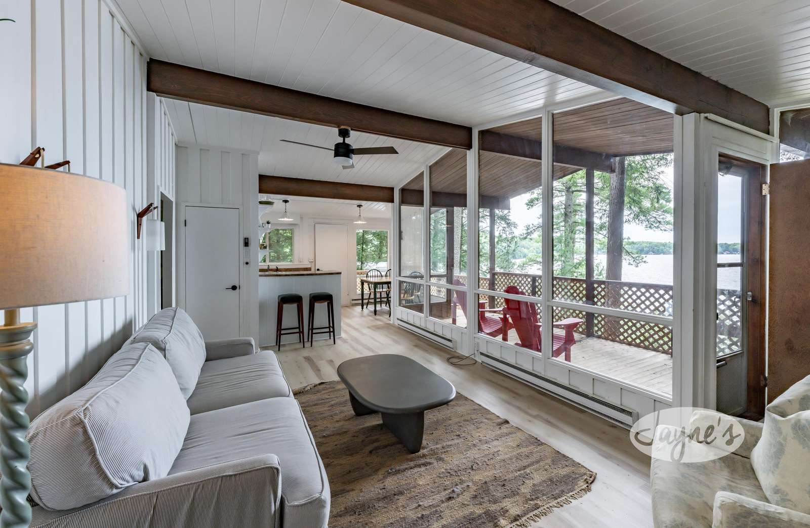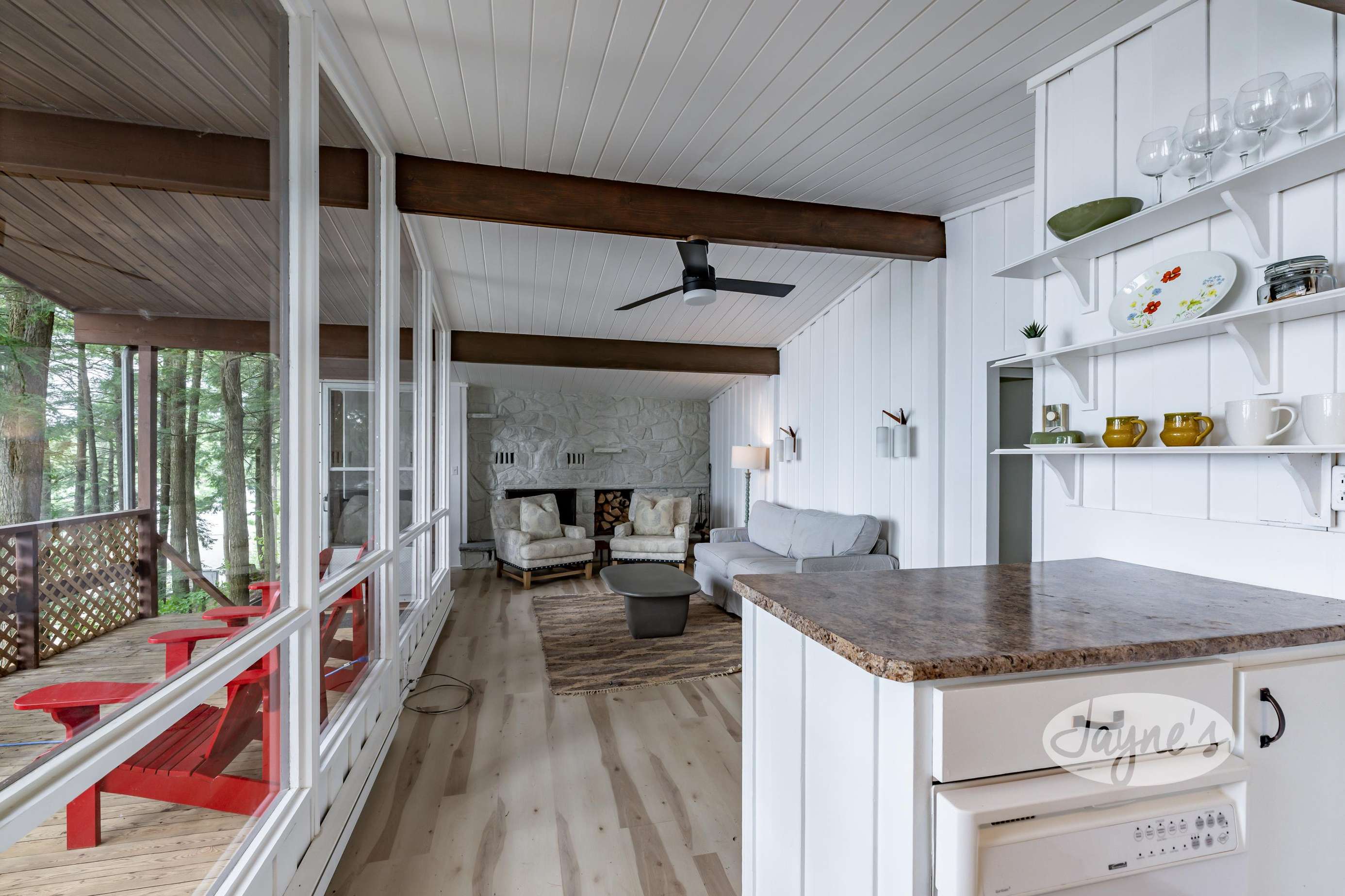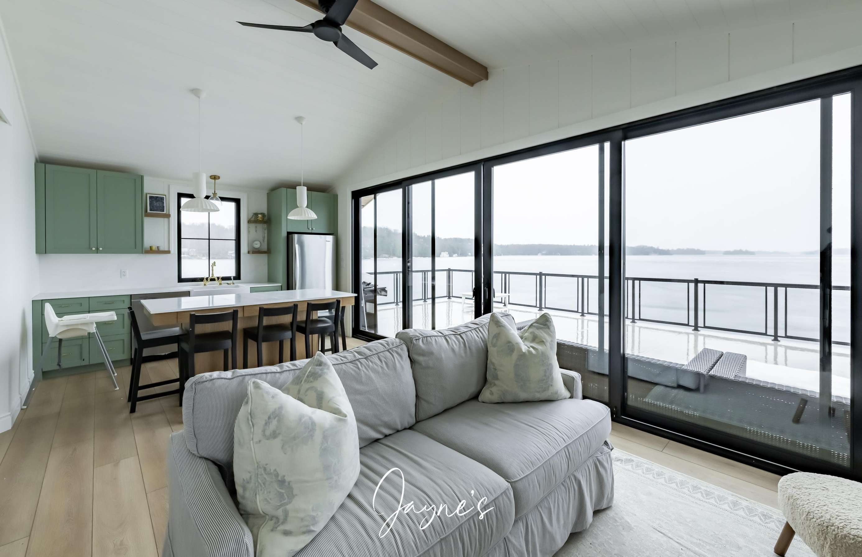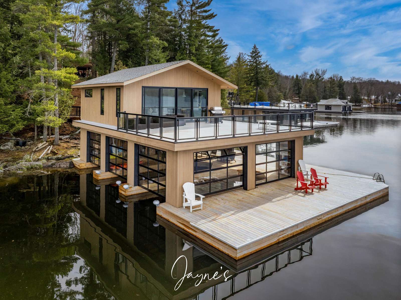 The boathouse is furnished with a new couch, 2 club chairs, a small TV, 4 person dining room table, and a kitchenette with a fridge, sink, dishwasher and a walkout to the deck.