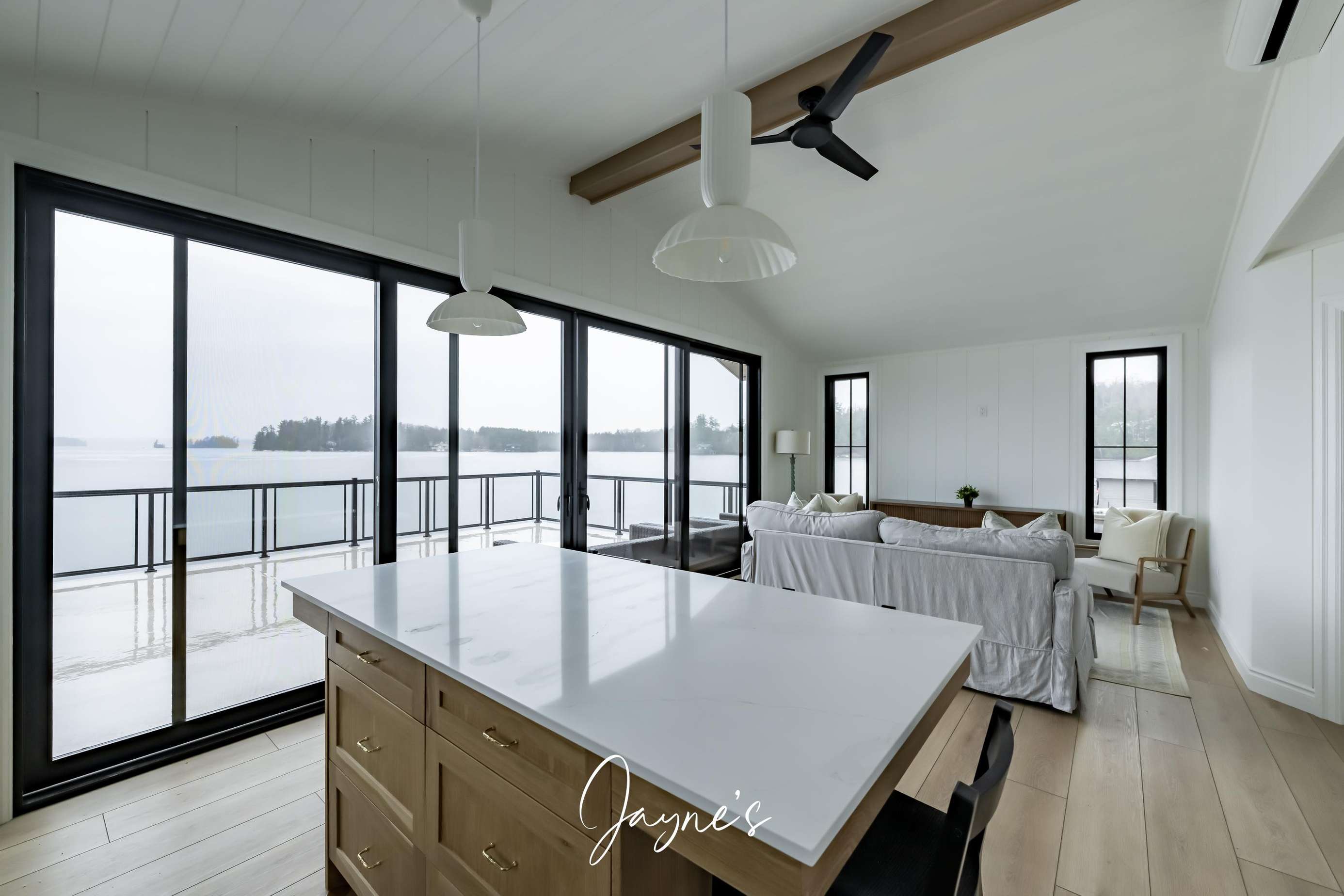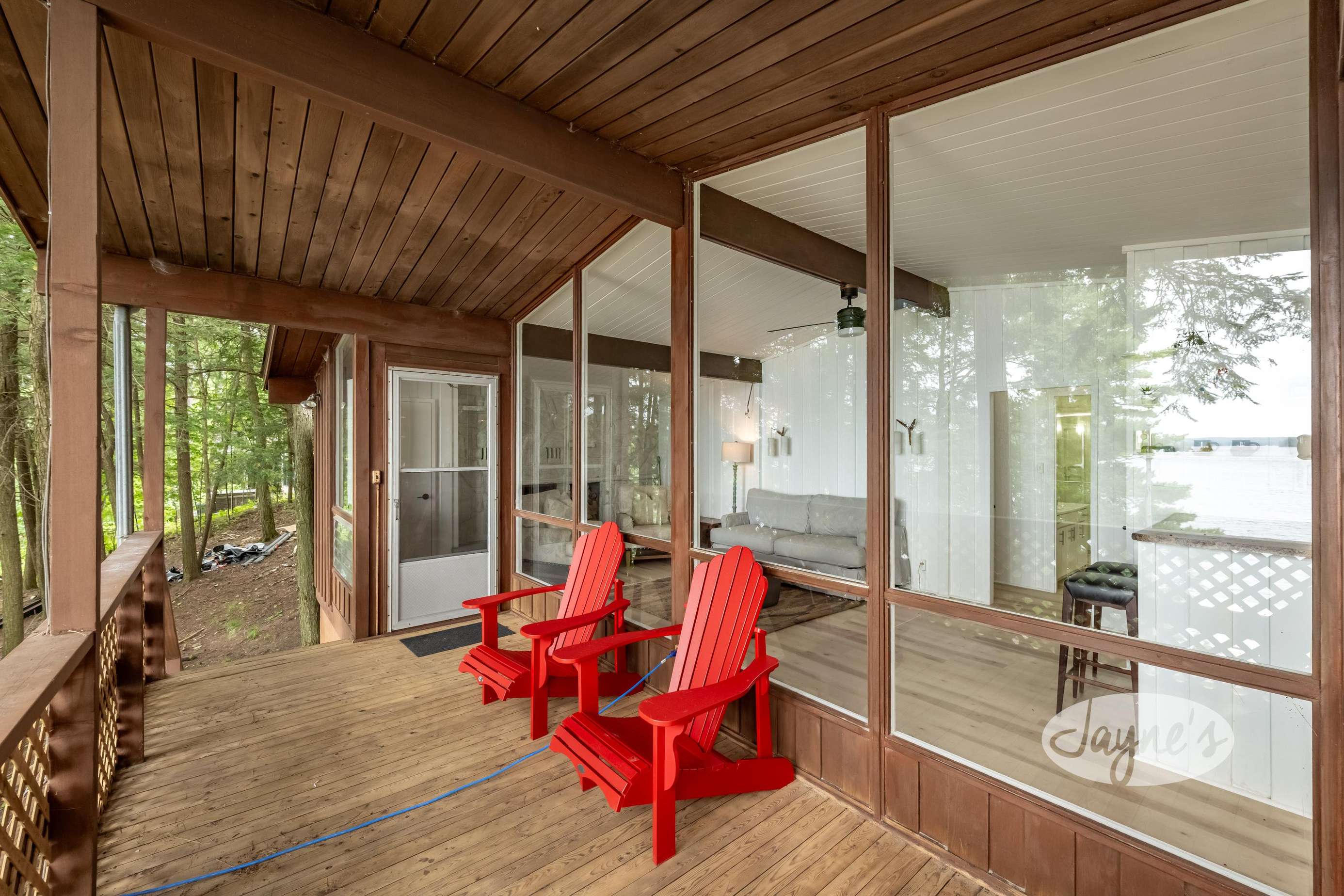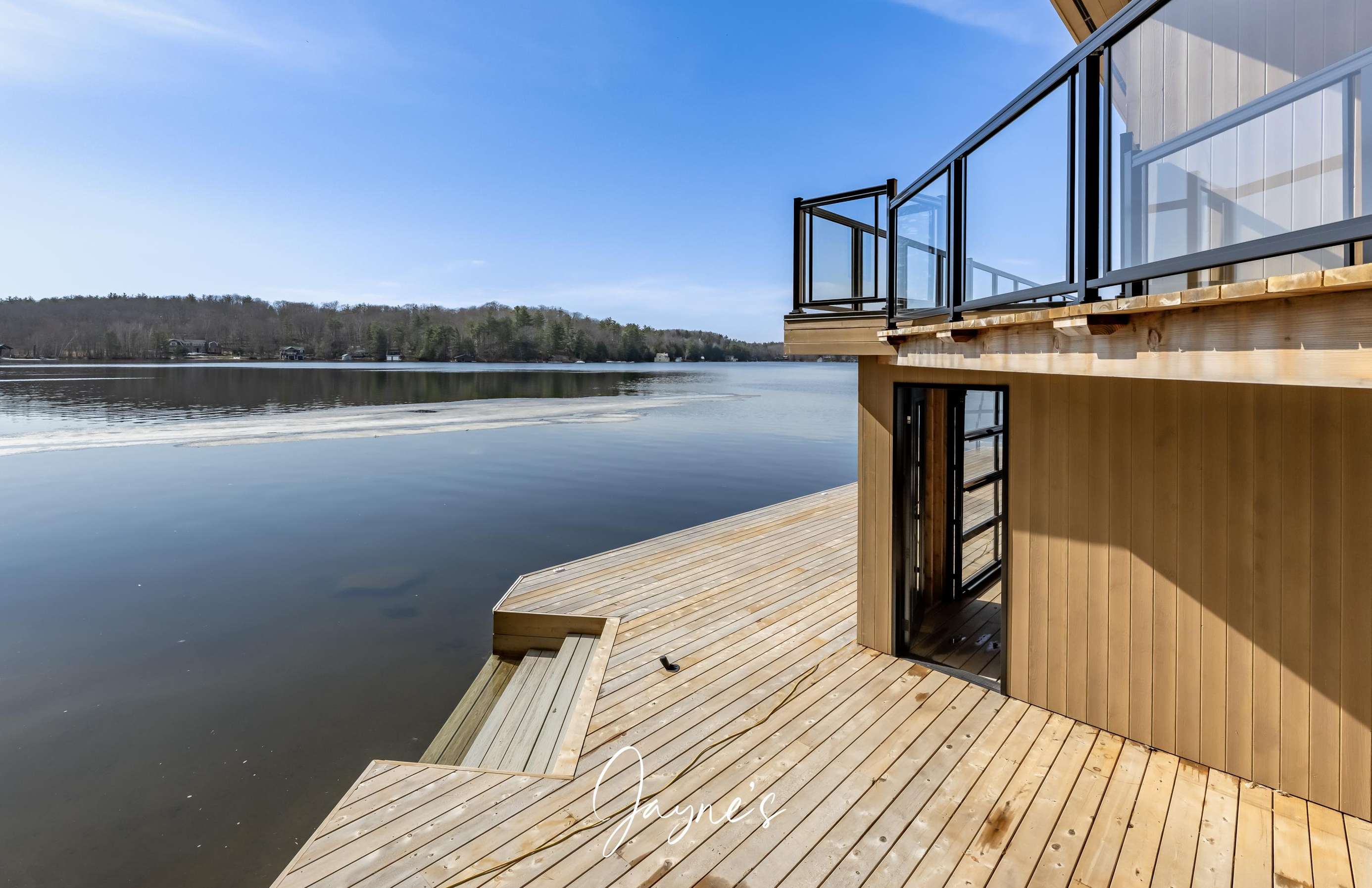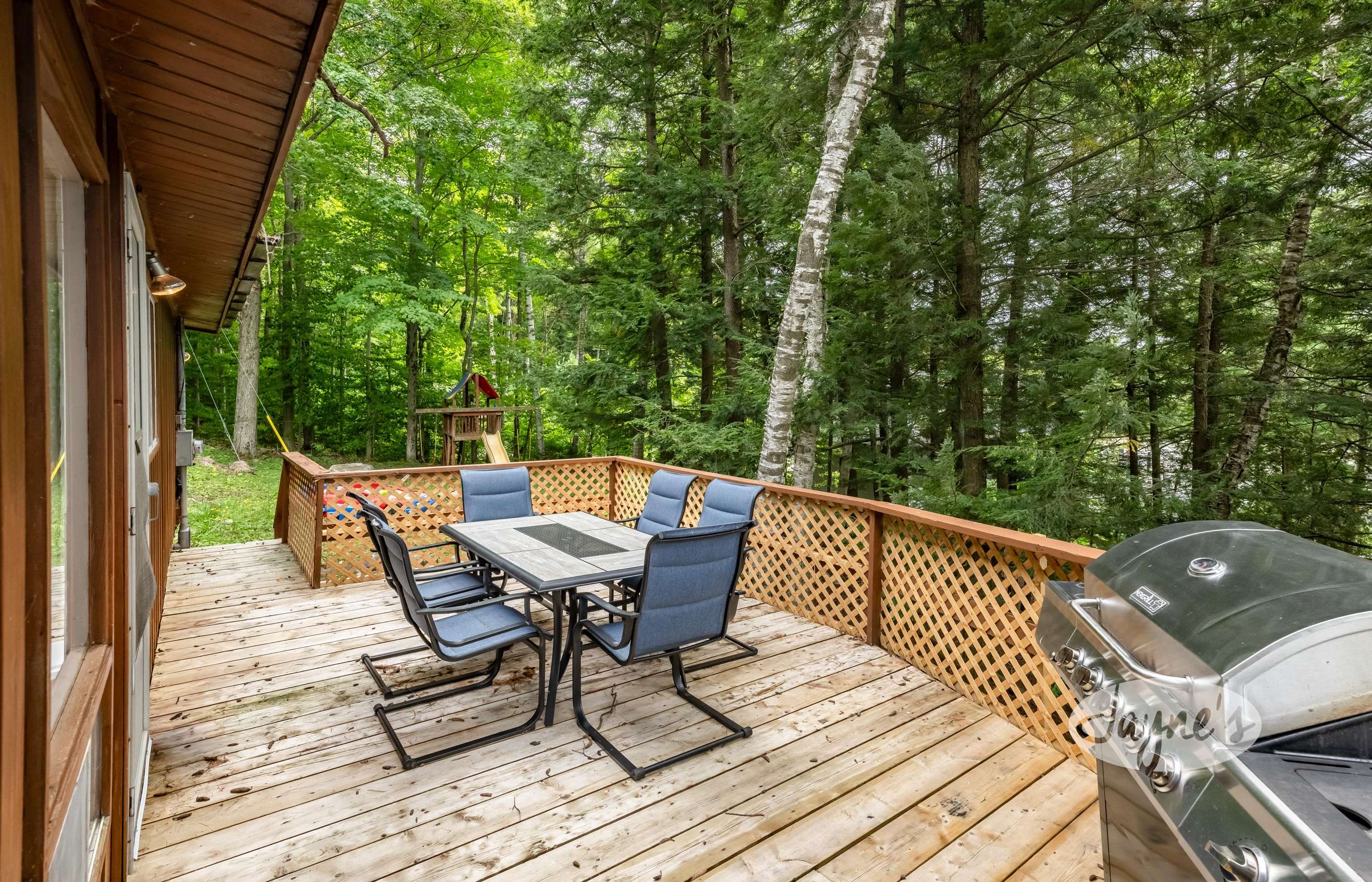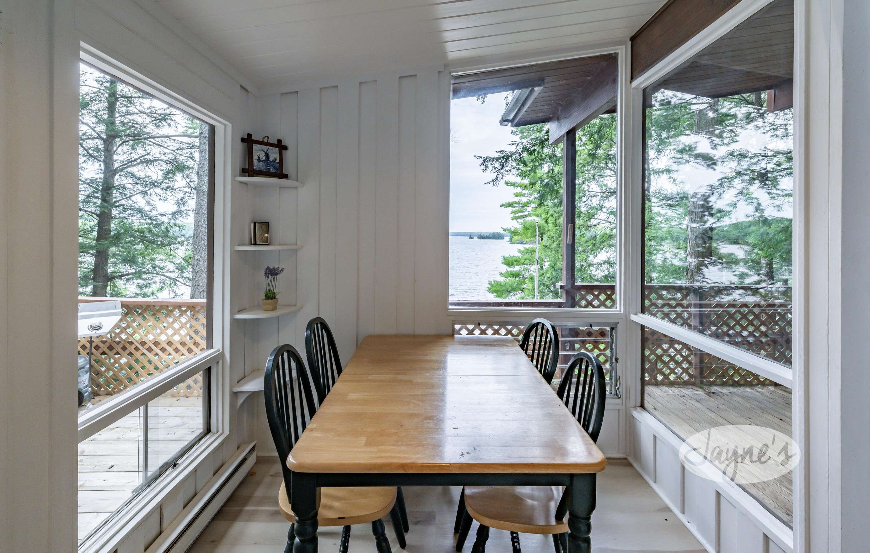 The boathouse is furnished with a new couch, 2 club chairs, a small TV, 4 person dining room table, and a kitchenette with a fridge, sink, dishwasher and a walkout to the deck.