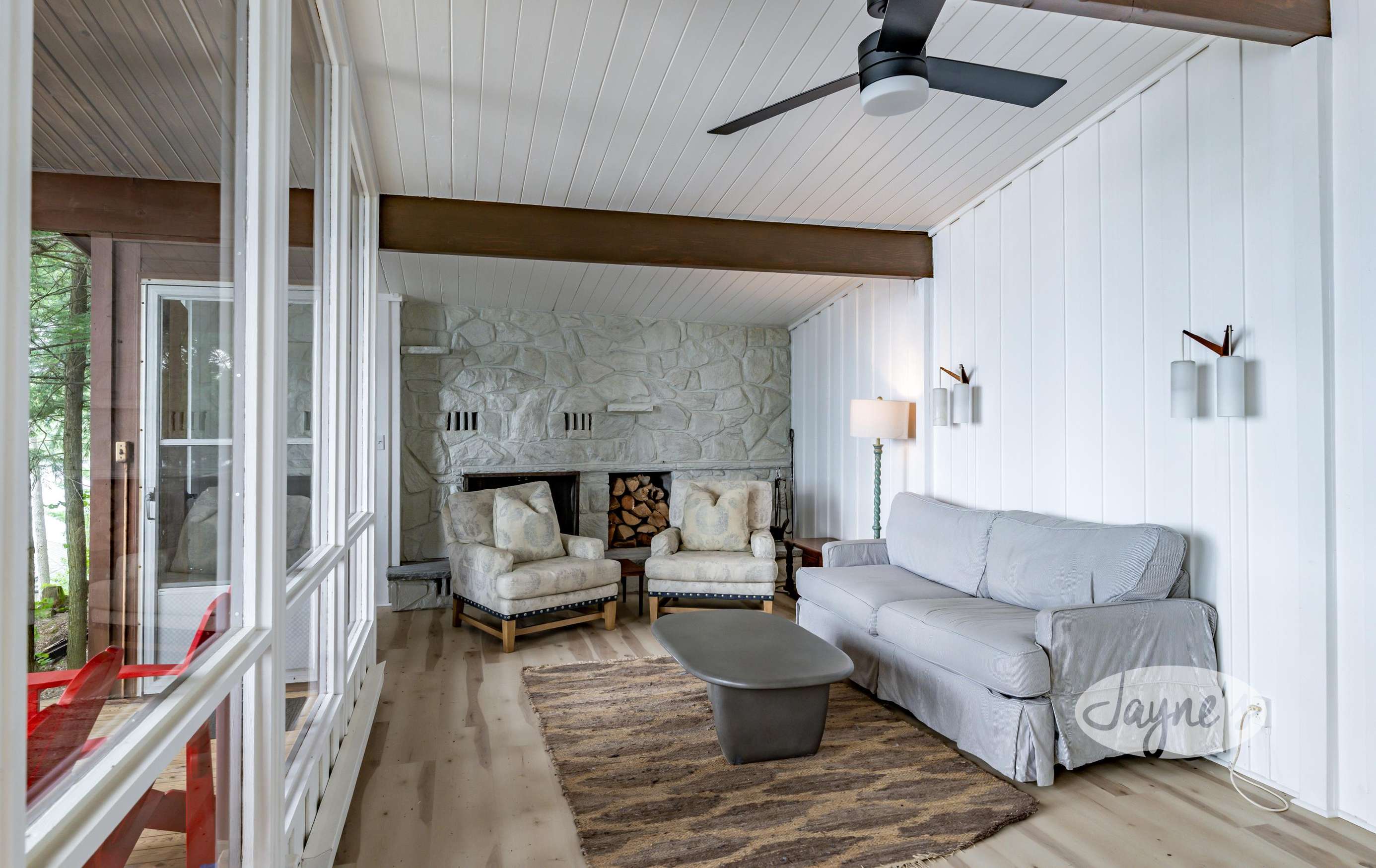 The living room features a TV, a large wood-burning fireplace and is furnished with a couch and 3 club chairs.
