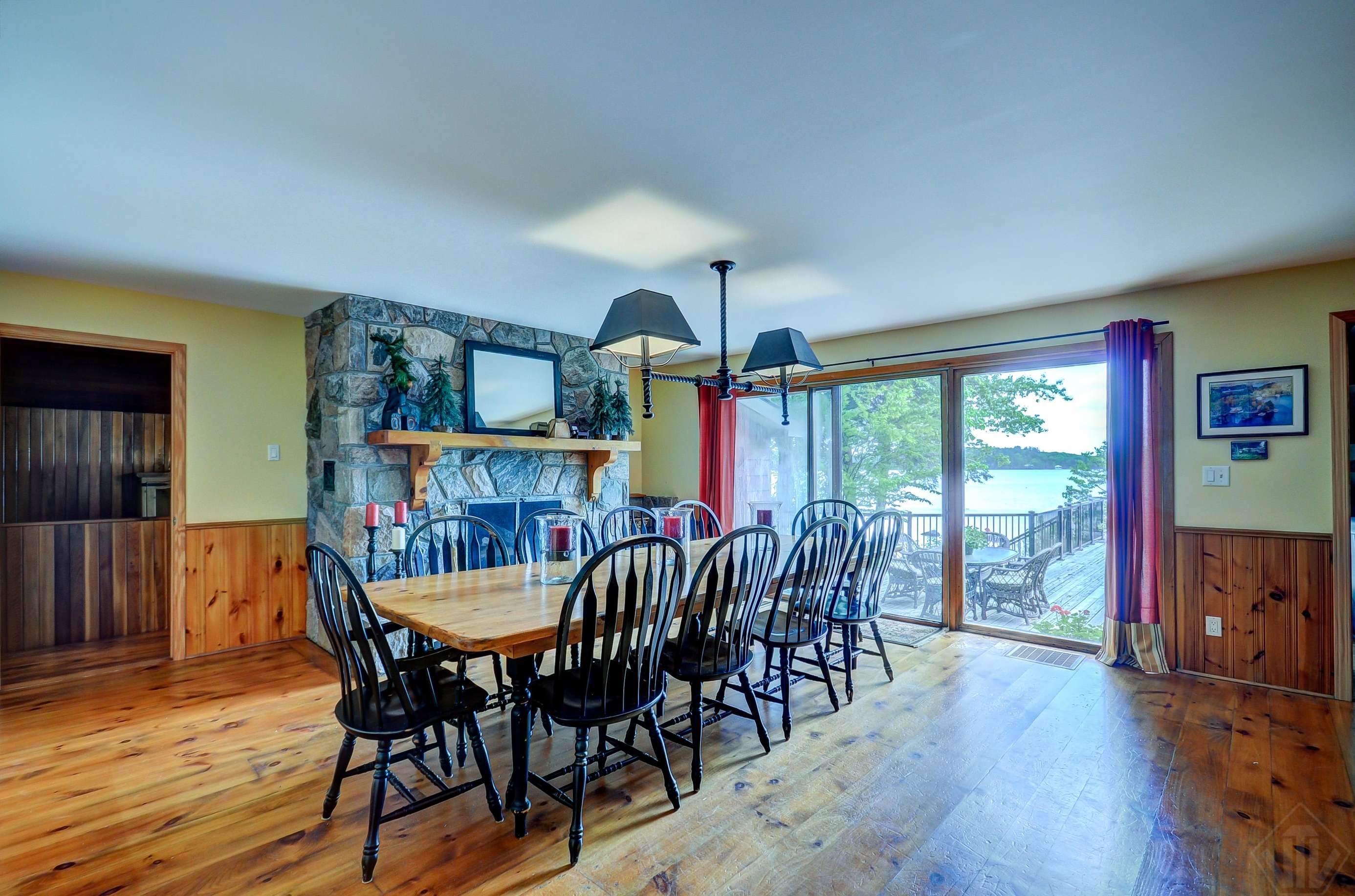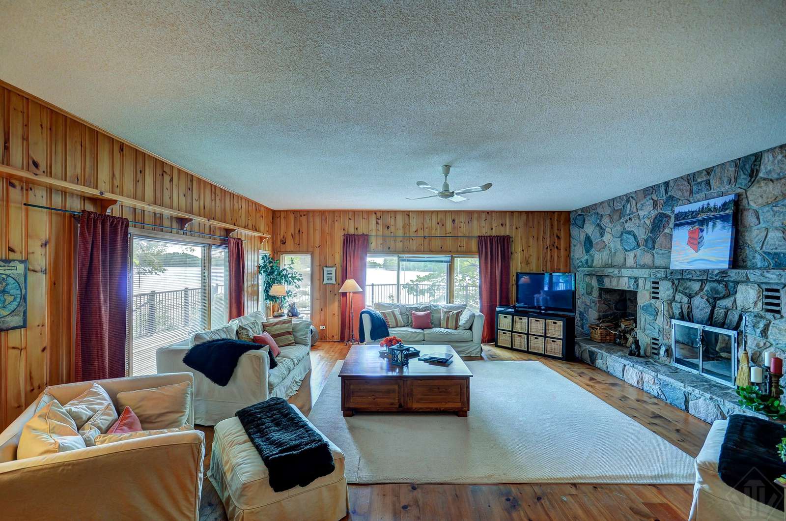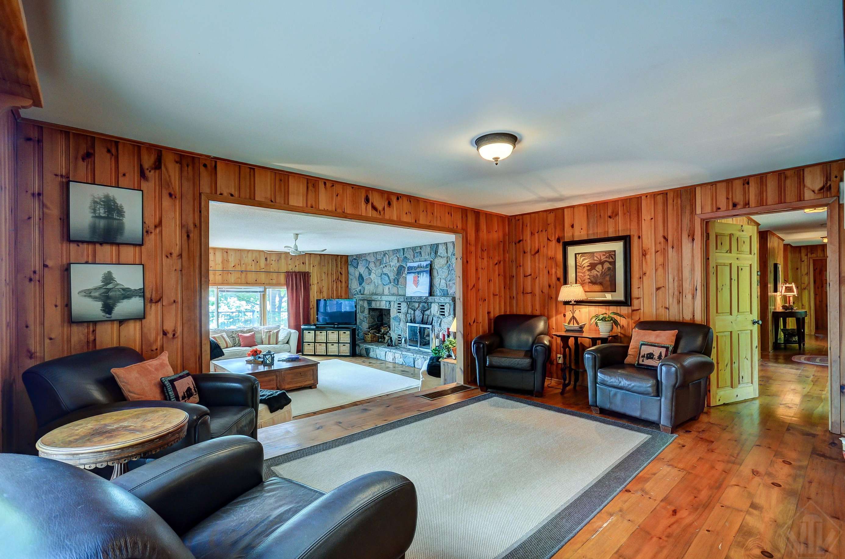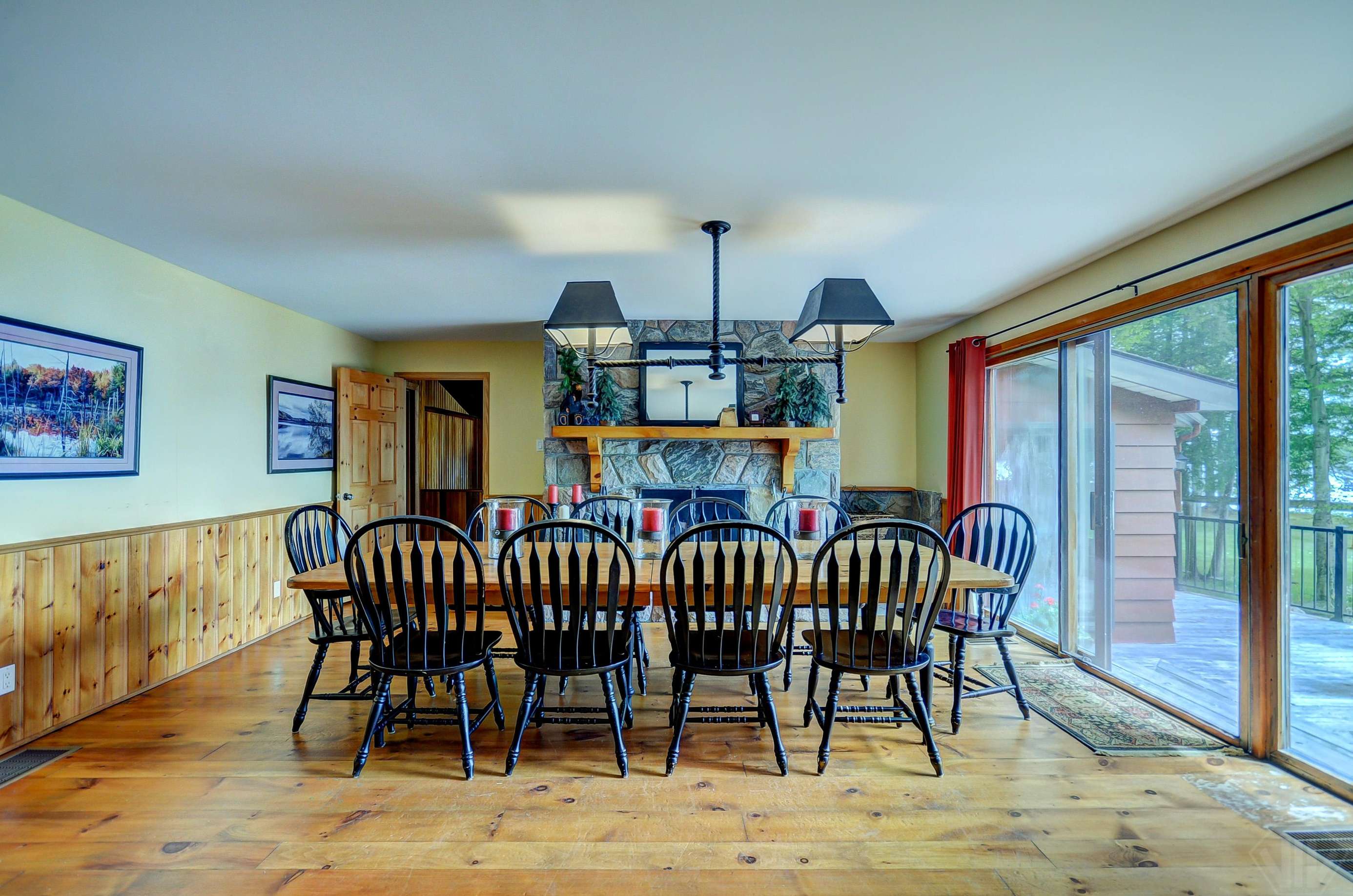 Family gatherings are easily accommodated in the large living room. With the knotty pine walls and floors, and the stone of the wood burning fireplace extending across the entire wall, this room exudes warm, rustic charm. Family movie nights are enjoyed with a 50" TV (satellite viewing), a Blue Ray DVD player, and plenty of seating space. The family room, dining room, and living room all have sliding door access to the large outdoor deck.