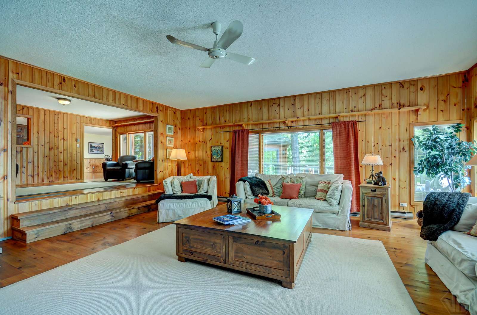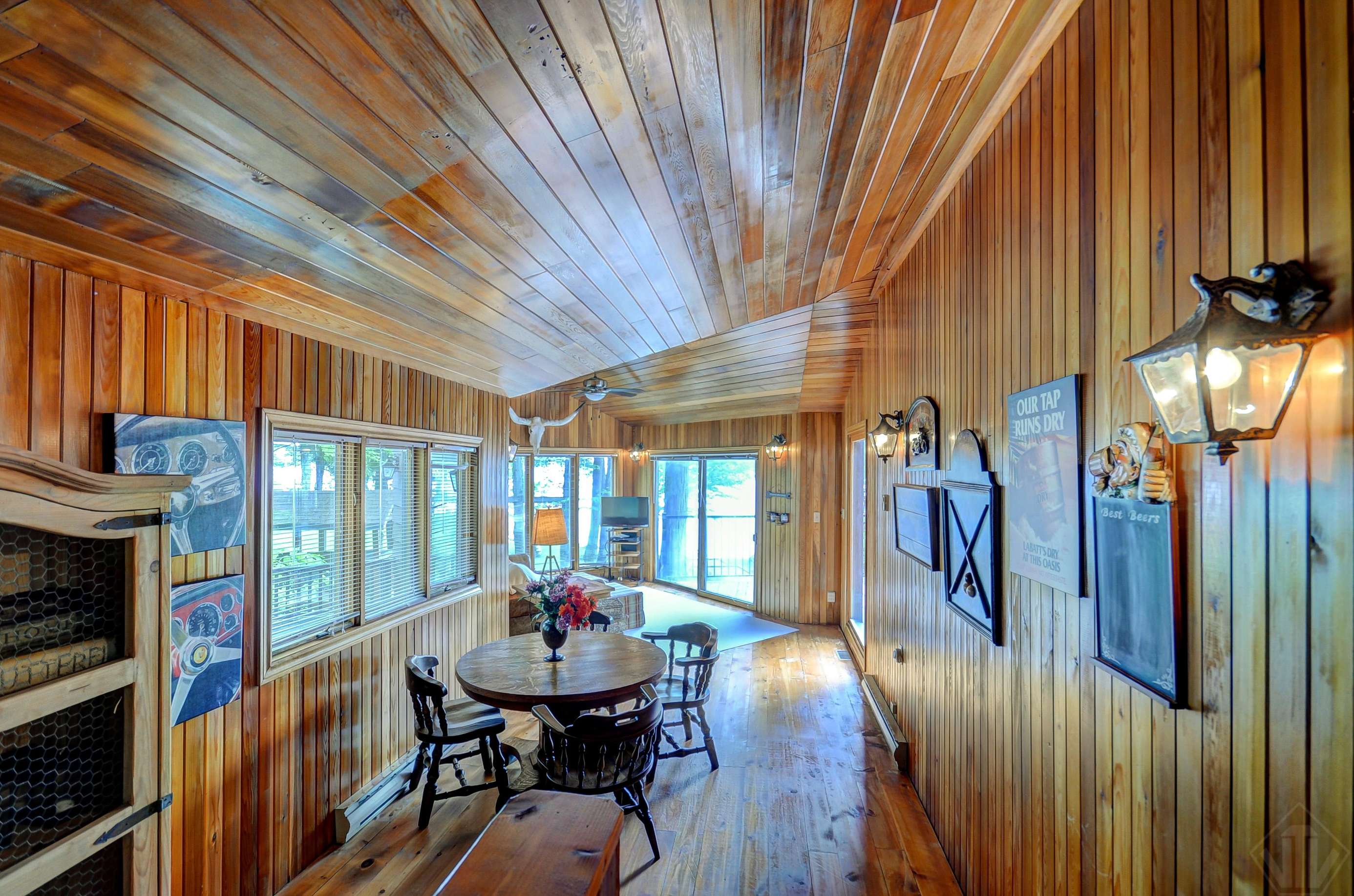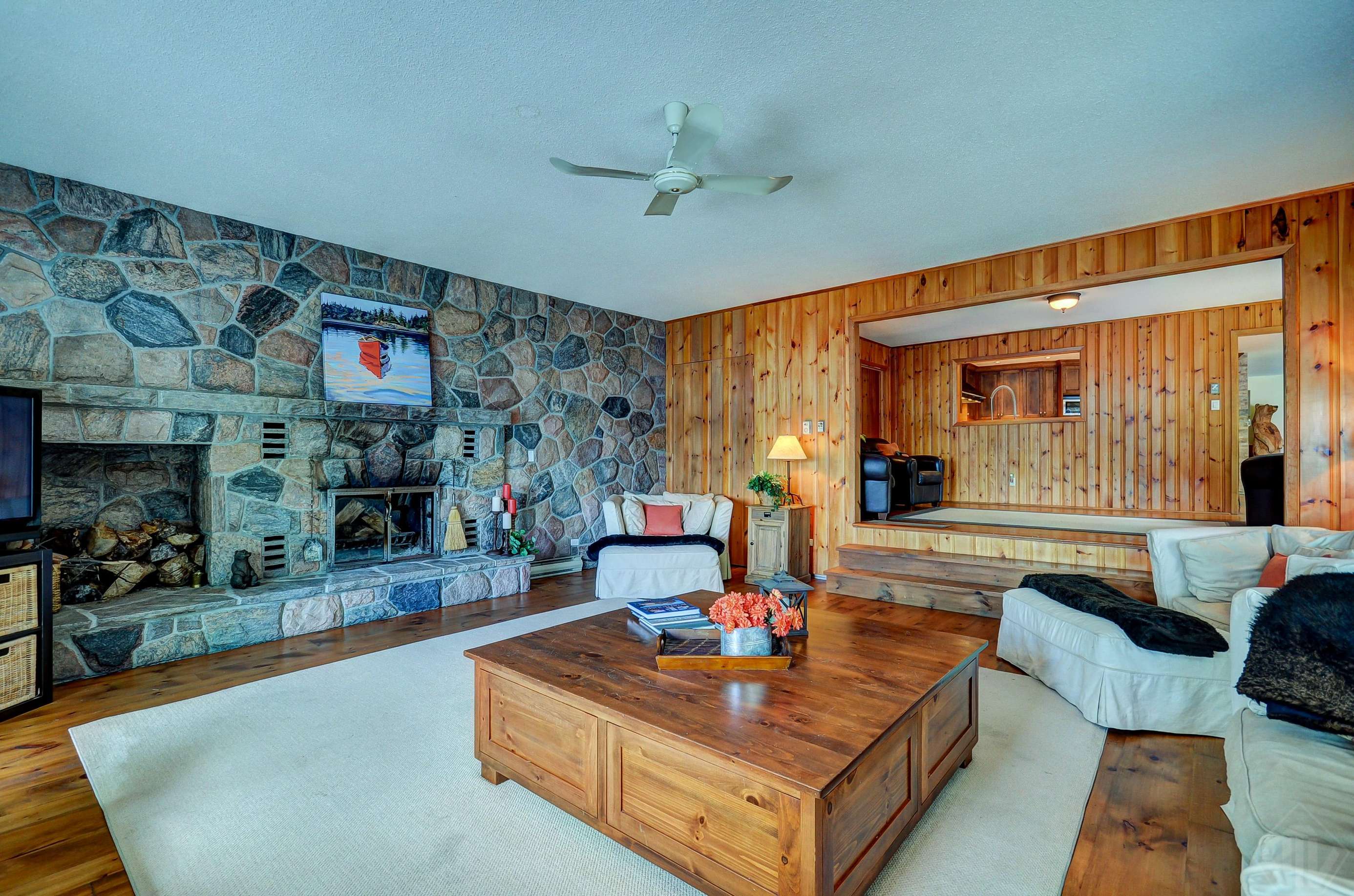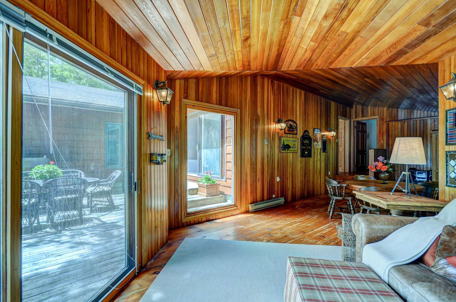 Family gatherings are easily accommodated in the large living room. With the knotty pine walls and floors, and the stone of the wood burning fireplace extending across the entire wall, this room exudes warm, rustic charm. Family movie nights are enjoyed with a 50" TV (satellite viewing), a Blue Ray DVD player, and plenty of seating space. The family room, dining room, and living room all have sliding door access to the large outdoor deck.