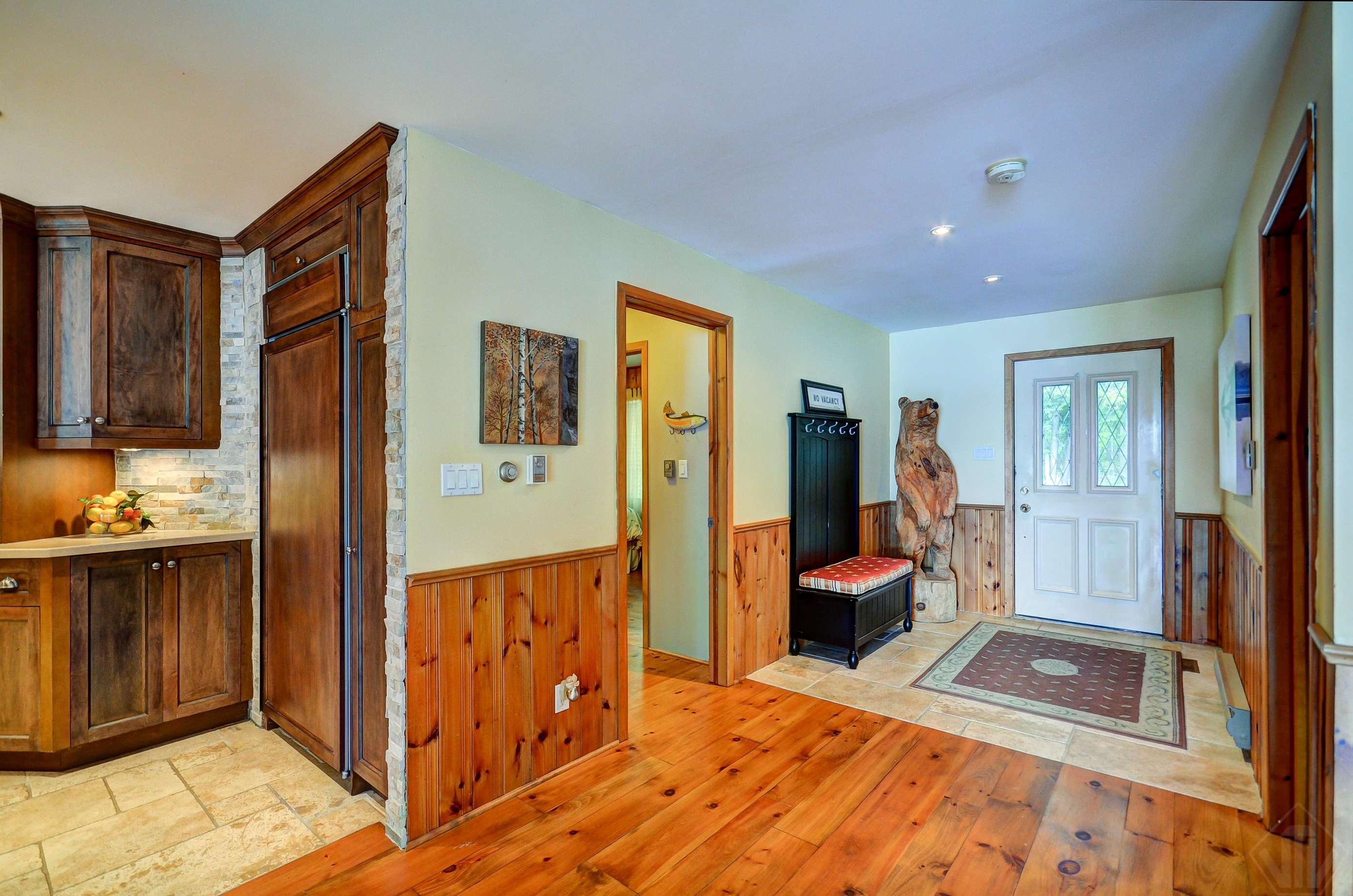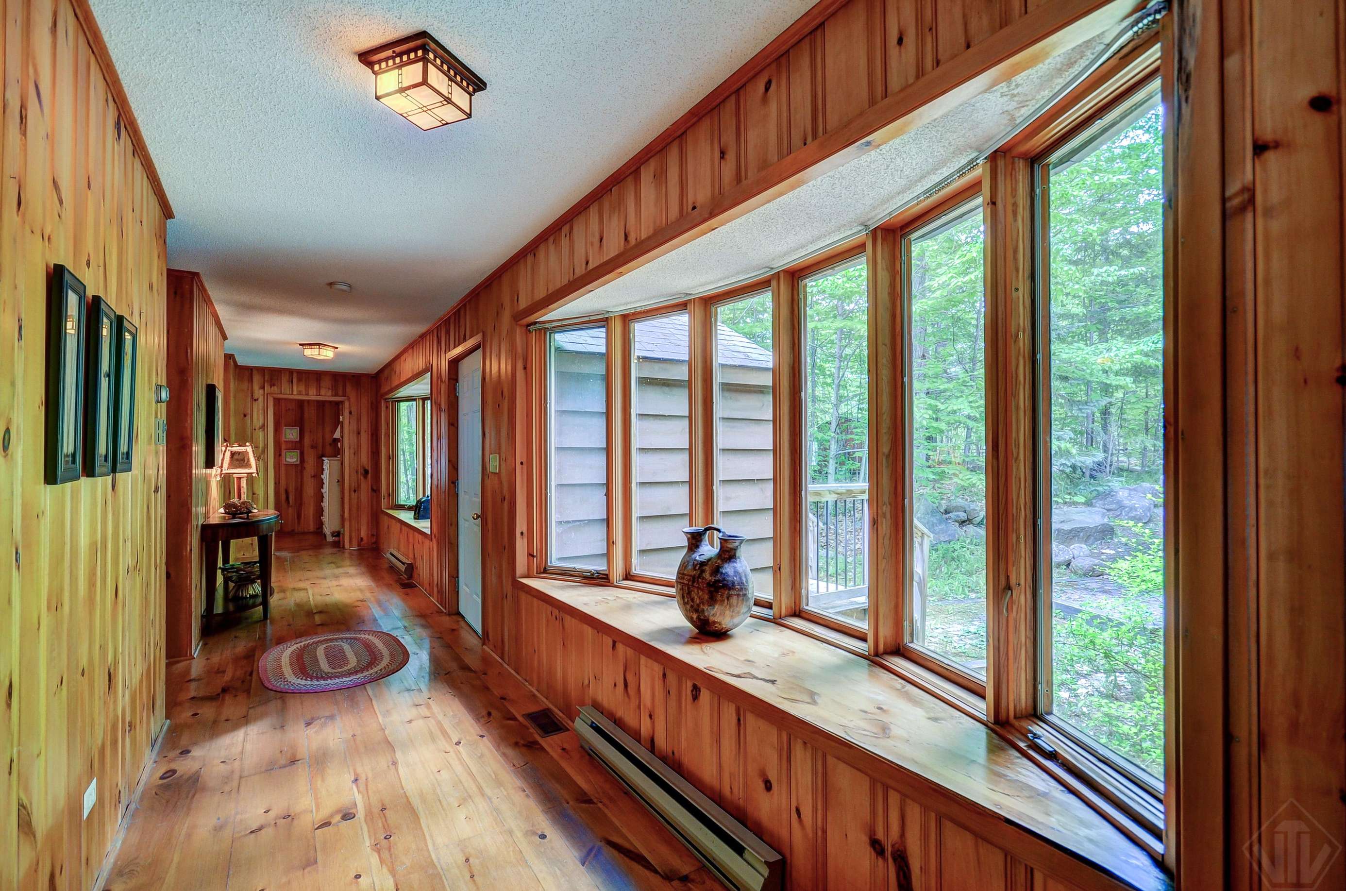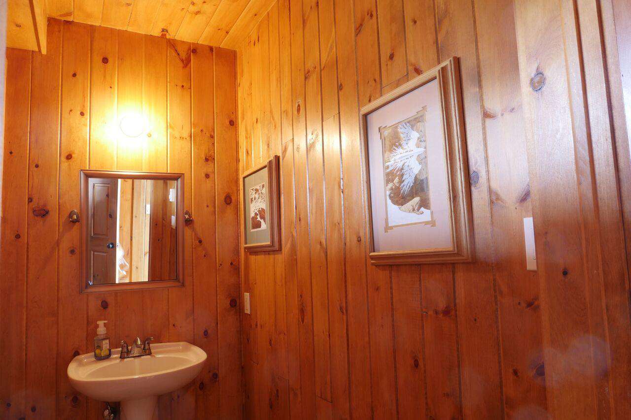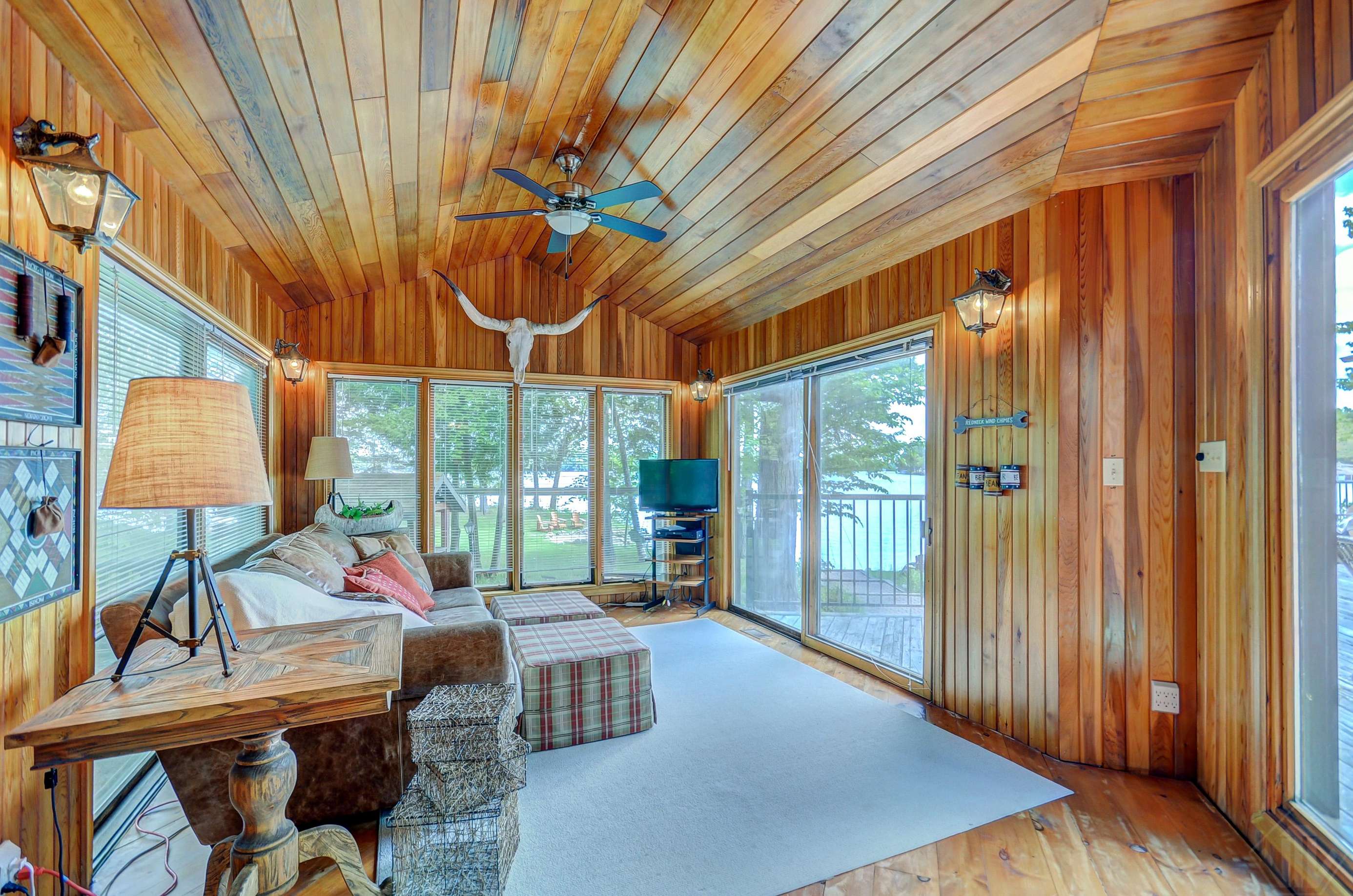 Family gatherings are easily accommodated in the large living room. With the knotty pine walls and floors, and the stone of the wood burning fireplace extending across the entire wall, this room exudes warm, rustic charm. Family movie nights are enjoyed with a 50" TV (satellite viewing), a Blue Ray DVD player, and plenty of seating space. The family room, dining room, and living room all have sliding door access to the large outdoor deck.