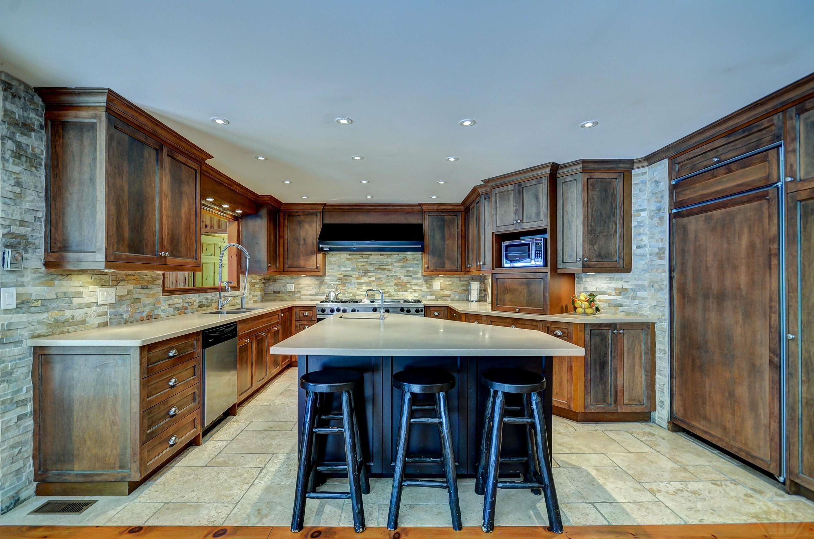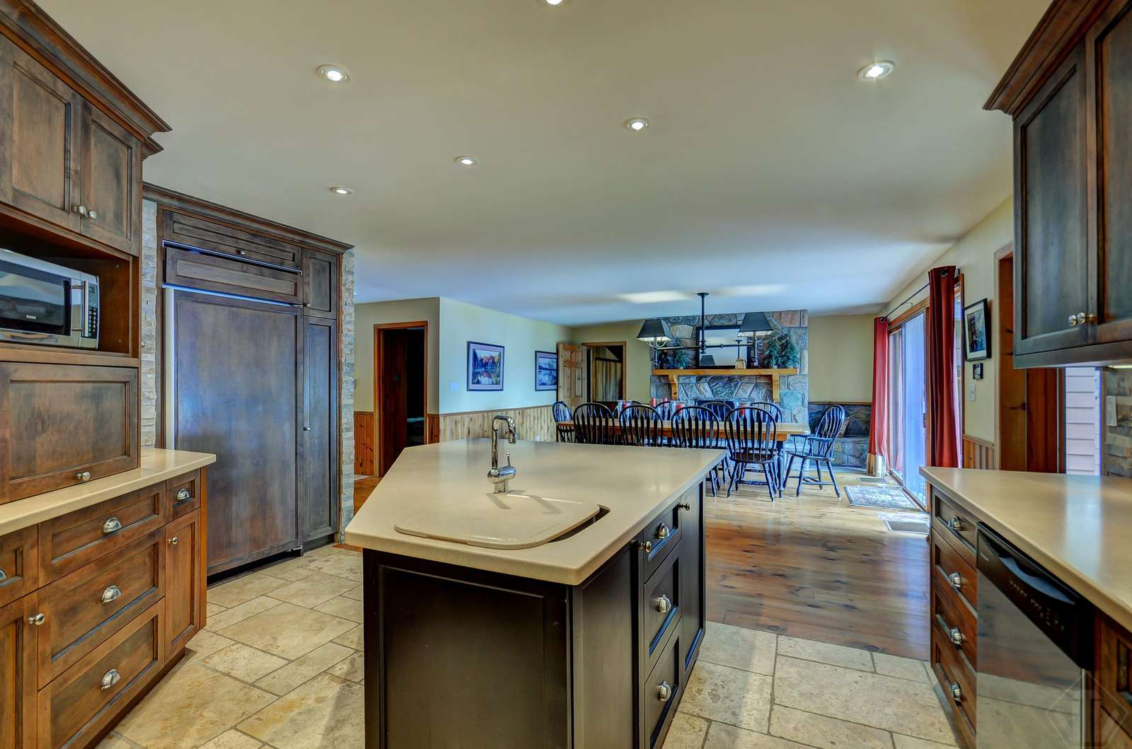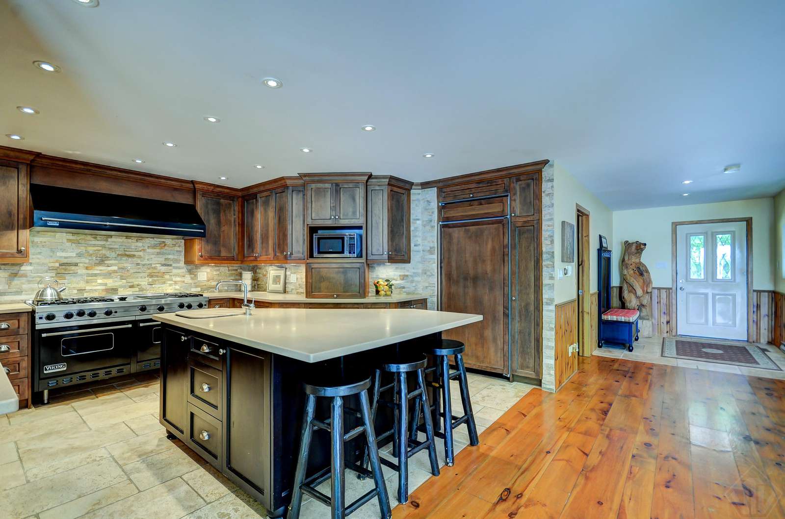 Equipped for fun and relaxation, a card table in the family room is ready for a game of Crazy Eights or your favourite board game, or you can simply enjoy a quiet evening of television or reading. There is also a TV in the Family Room. Family meals can be enjoyed at a dining room table that seats 12 comfortably, while a fire in the wood burning stone fireplace casts a warm glow throughout the room. The gourmet kitchen comes fully equipped, and a large built-in fridge, a microwave, and a Viking range with 6 burners and two ovens will inspire any chef to prepare delicious home-cooked meals.