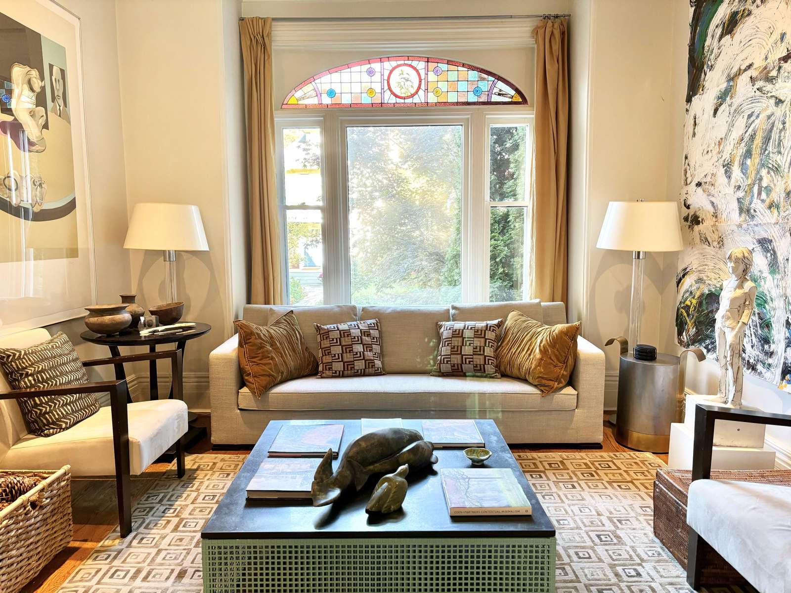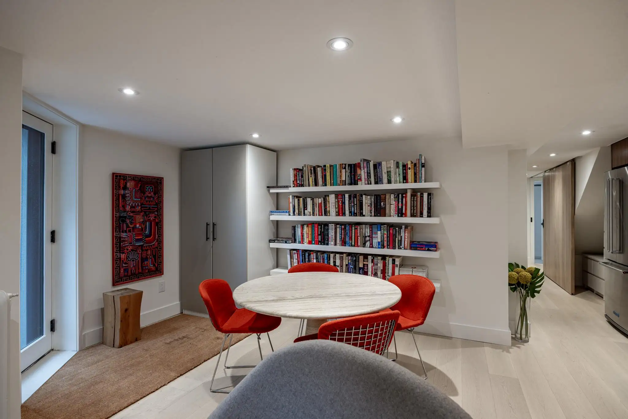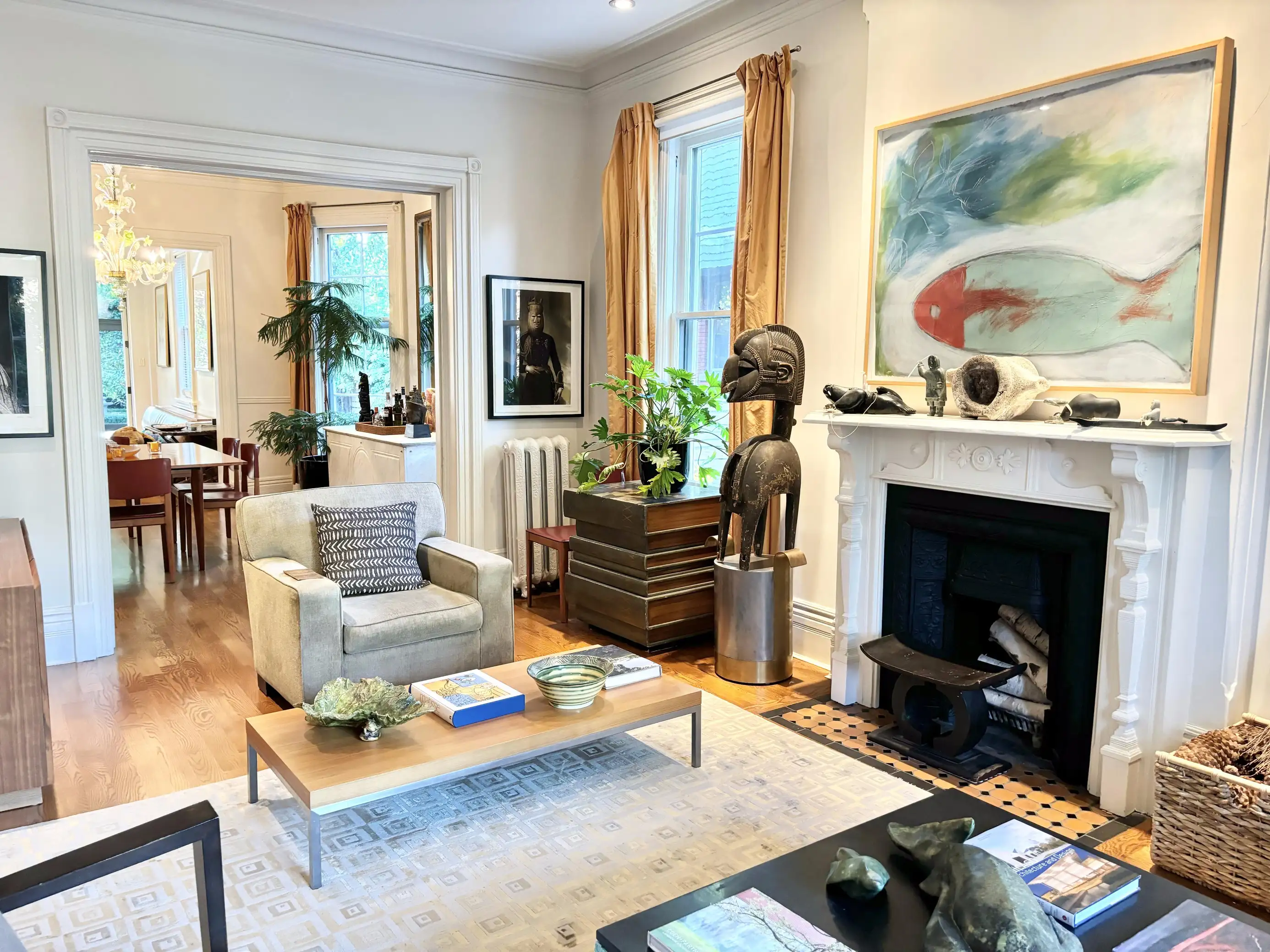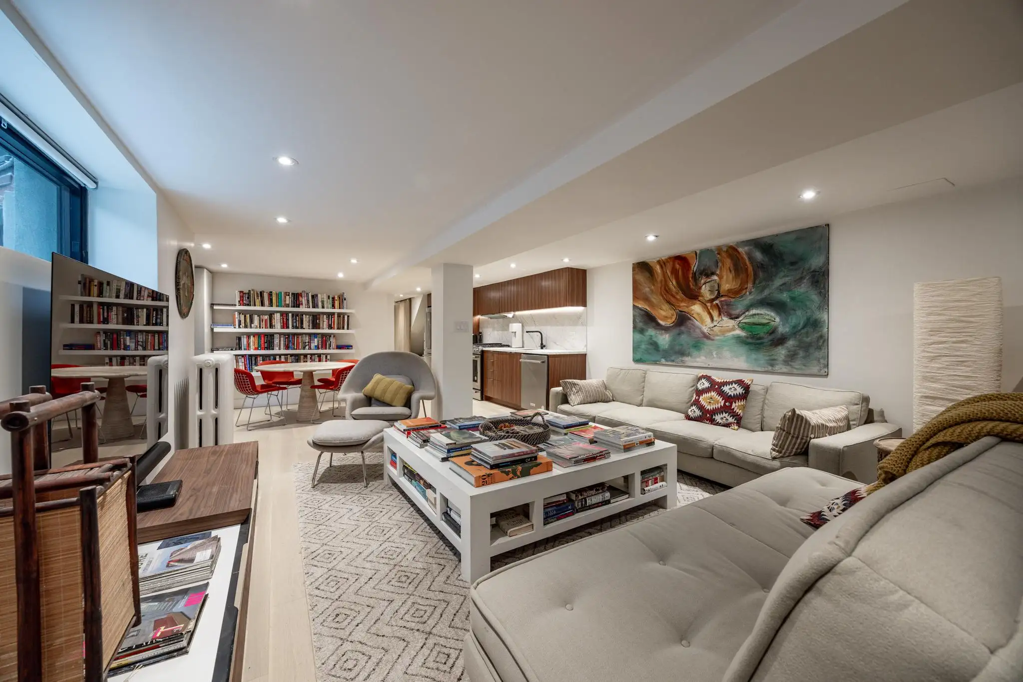 At the front of the home, the living room is a great place to spend with family and friends, surrounded by objects collected from the ownerβs life and work. The room offers 2 cozy arm chairs and a large couch seating 3.