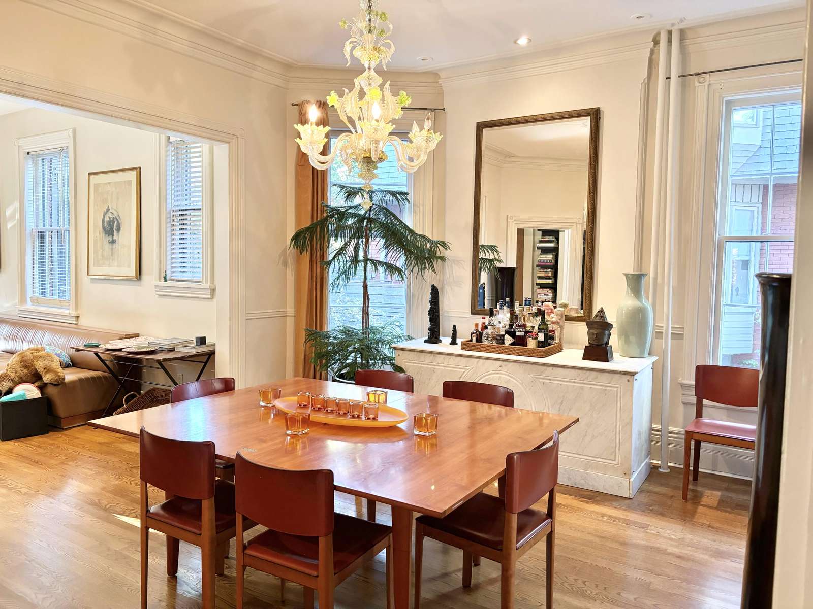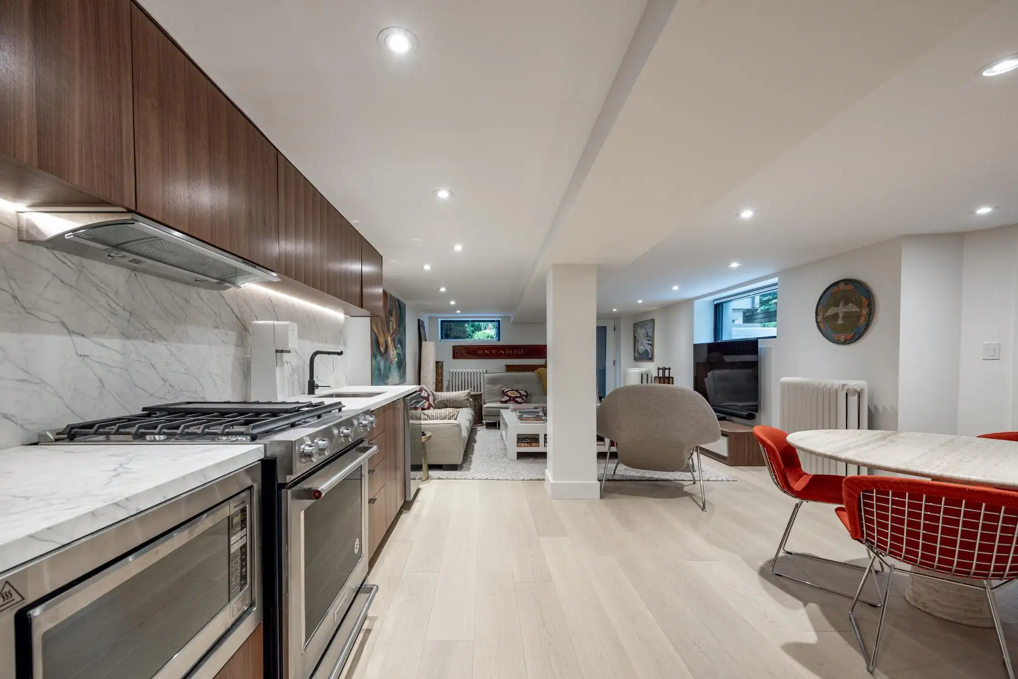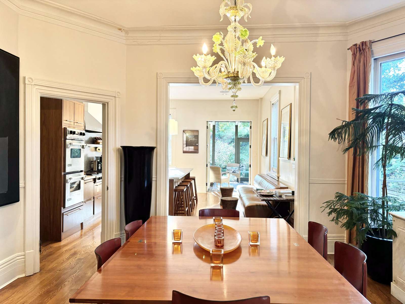 A chandelier hangs in the dining room which is furnished with high-end Italian chairs and a table that seats up to 8 people.