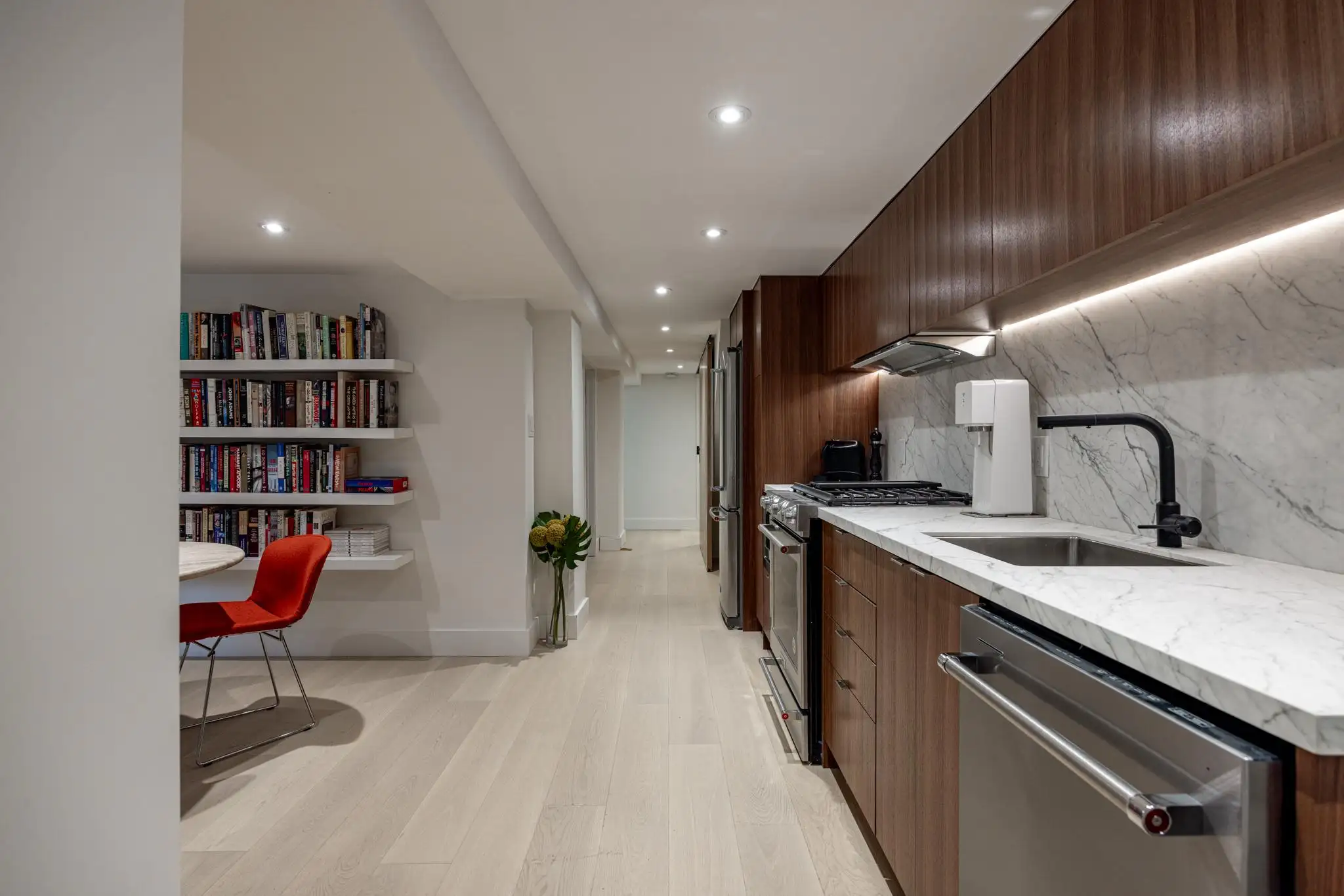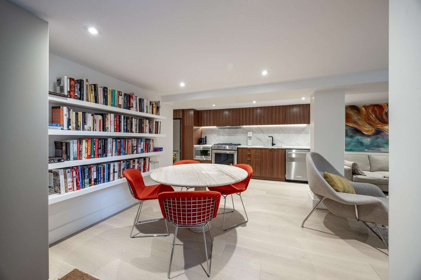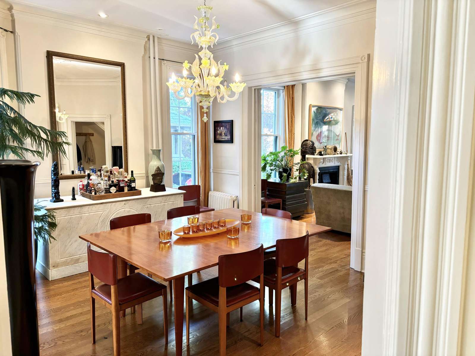 A chandelier hangs in the dining room which is furnished with high-end Italian chairs and a table that seats up to 8 people.