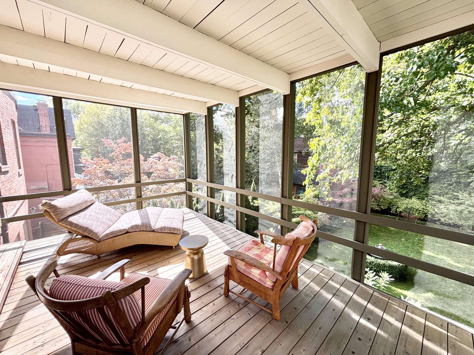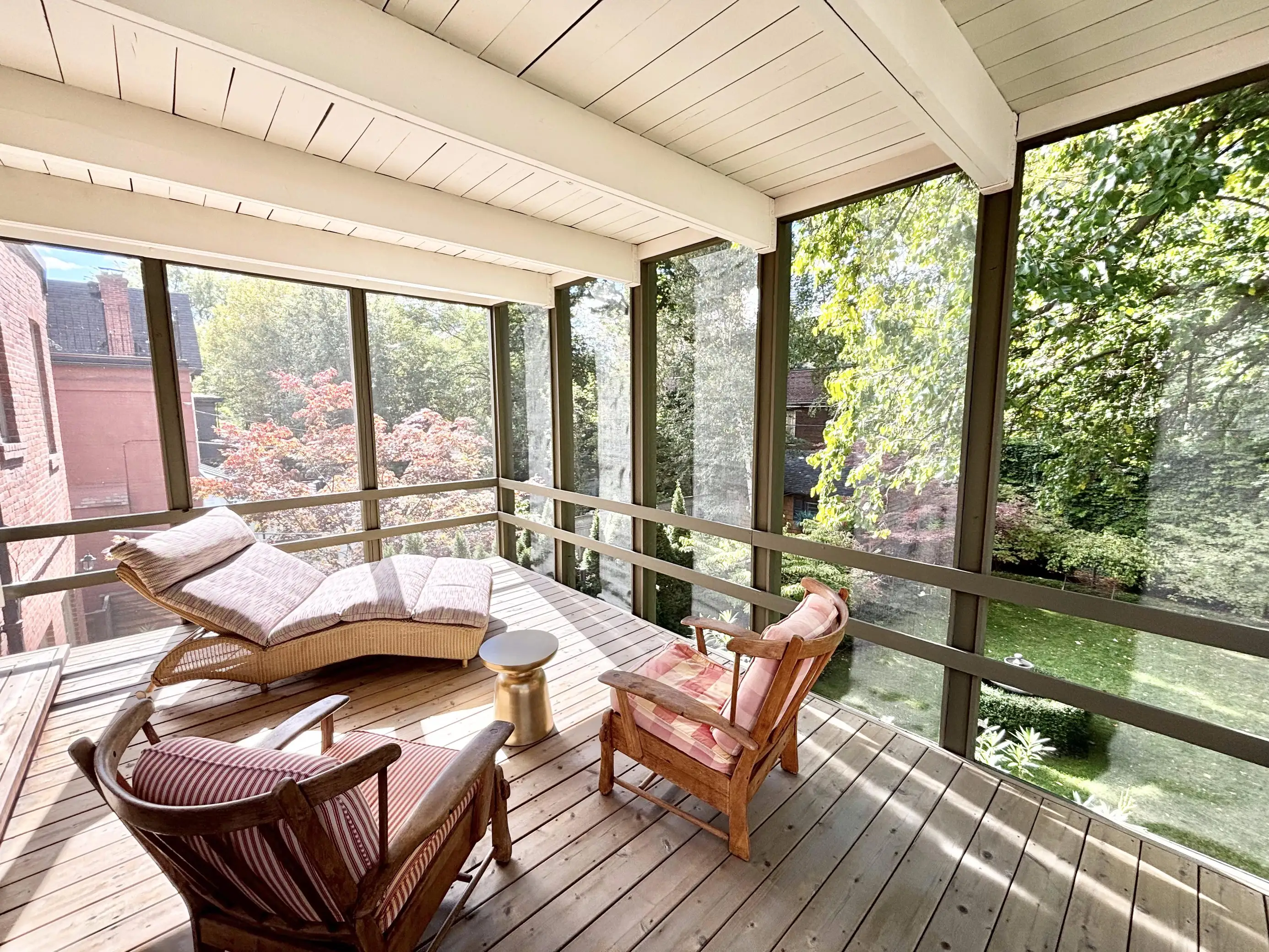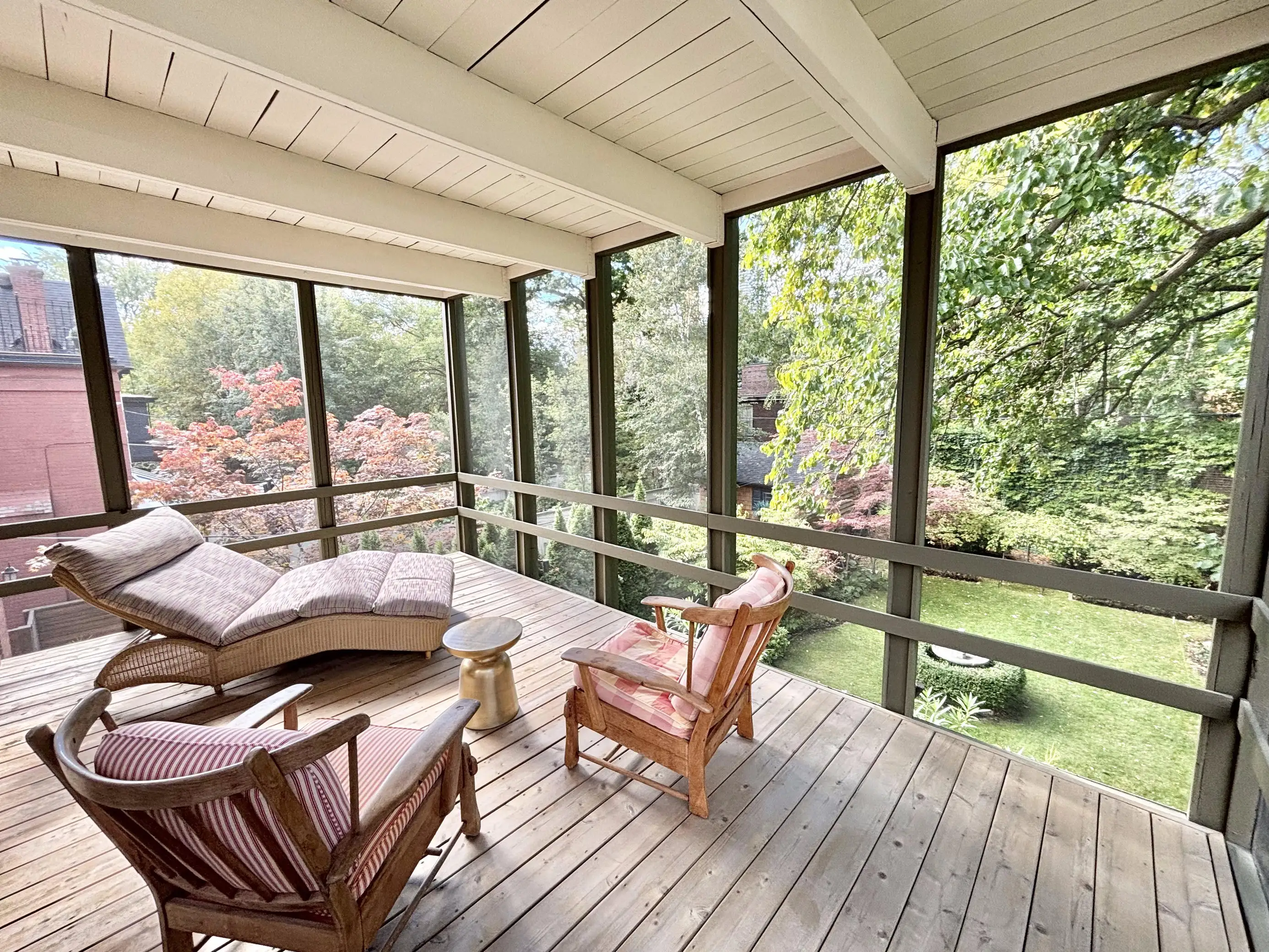 Bedroom 1 - King (Primary) with ensuite and 3-season screened-in patio overlooking the backyard, with a lounge chair, 2 arm chairs and a swing.