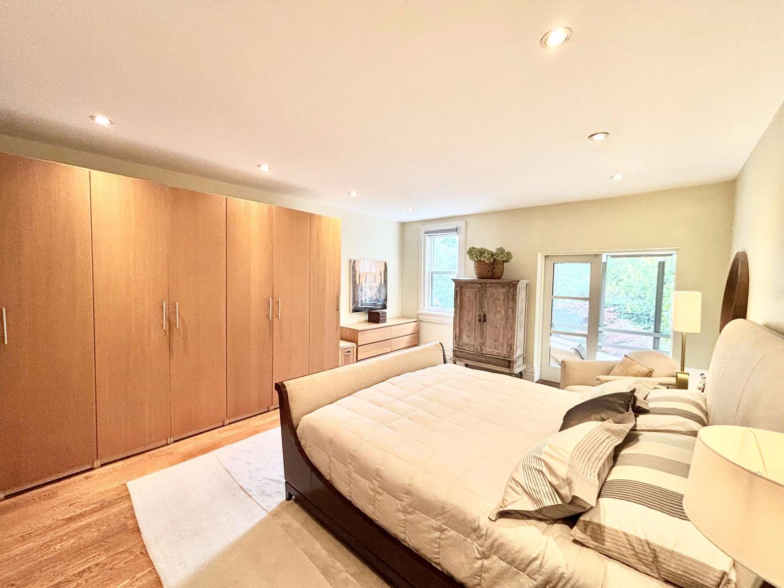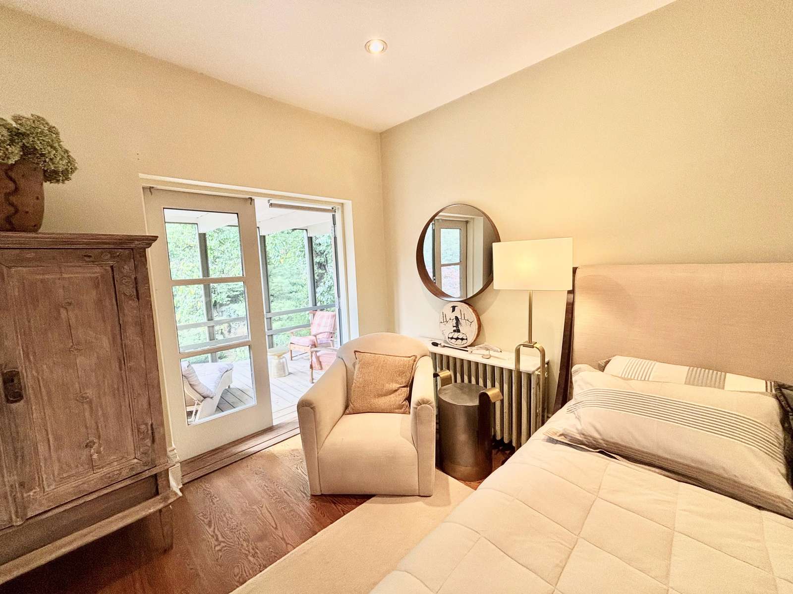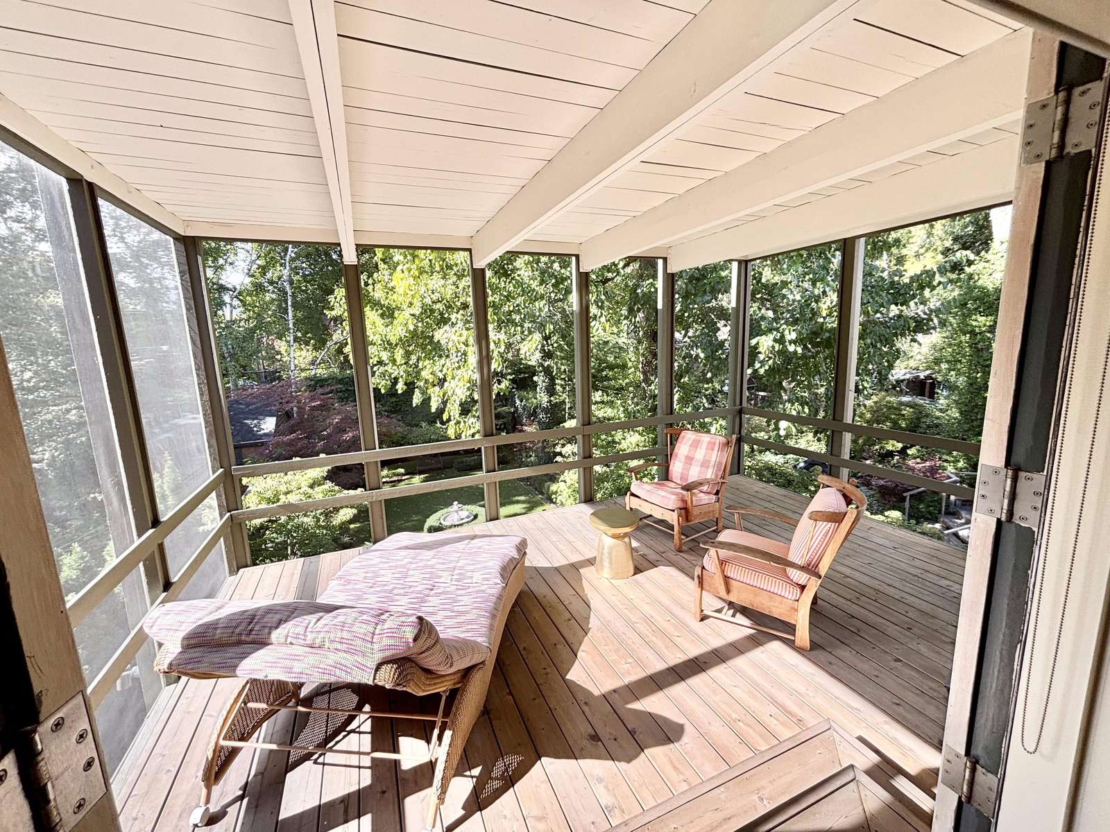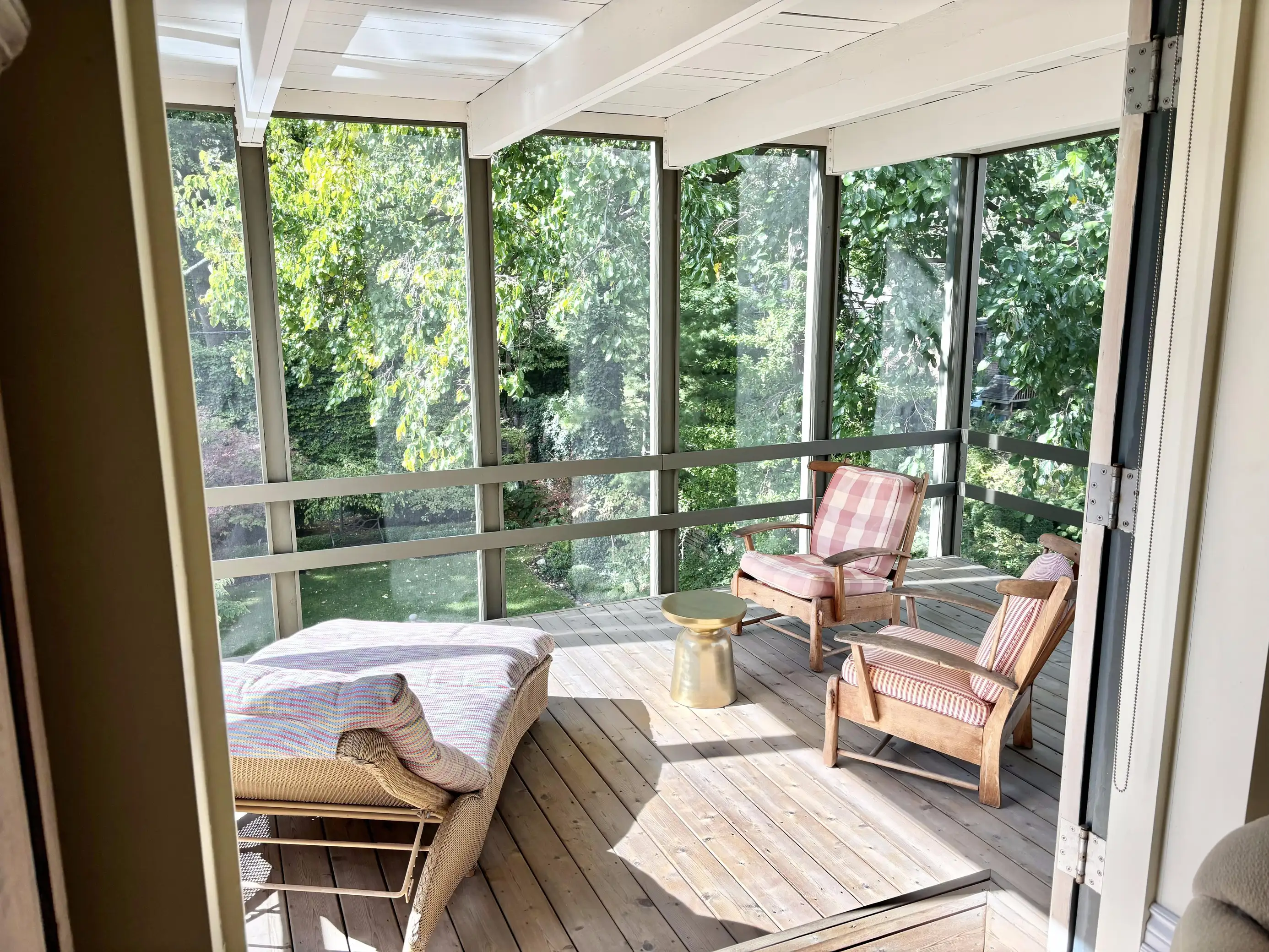 Bedroom 1 - King (Primary) with ensuite and 3-season screened-in patio overlooking the backyard, with a lounge chair, 2 arm chairs and a swing.