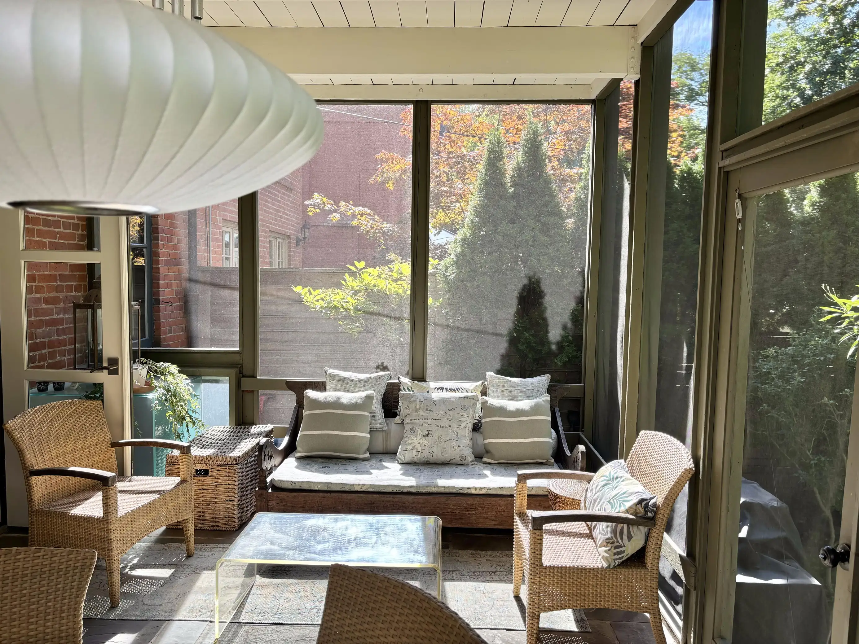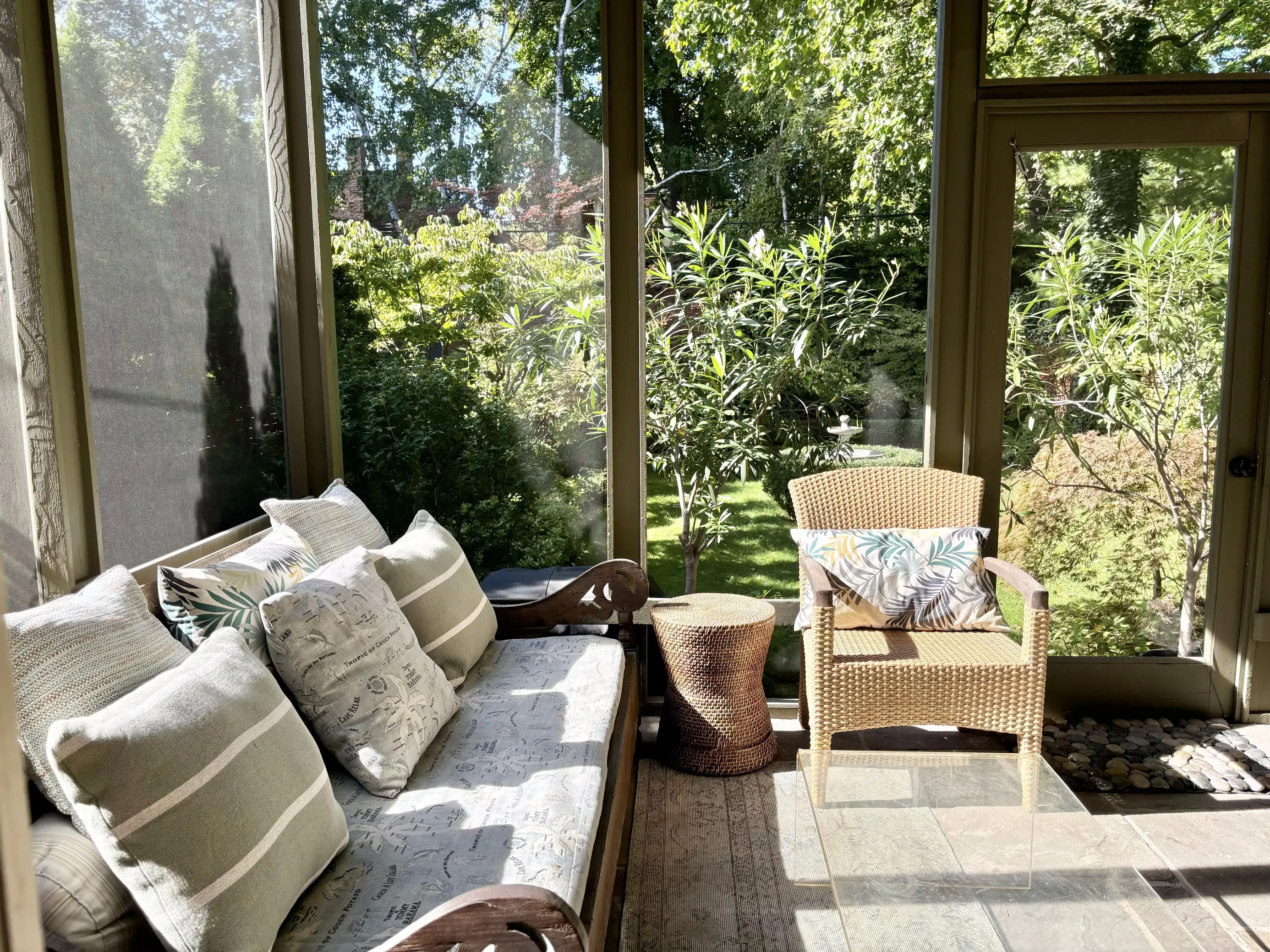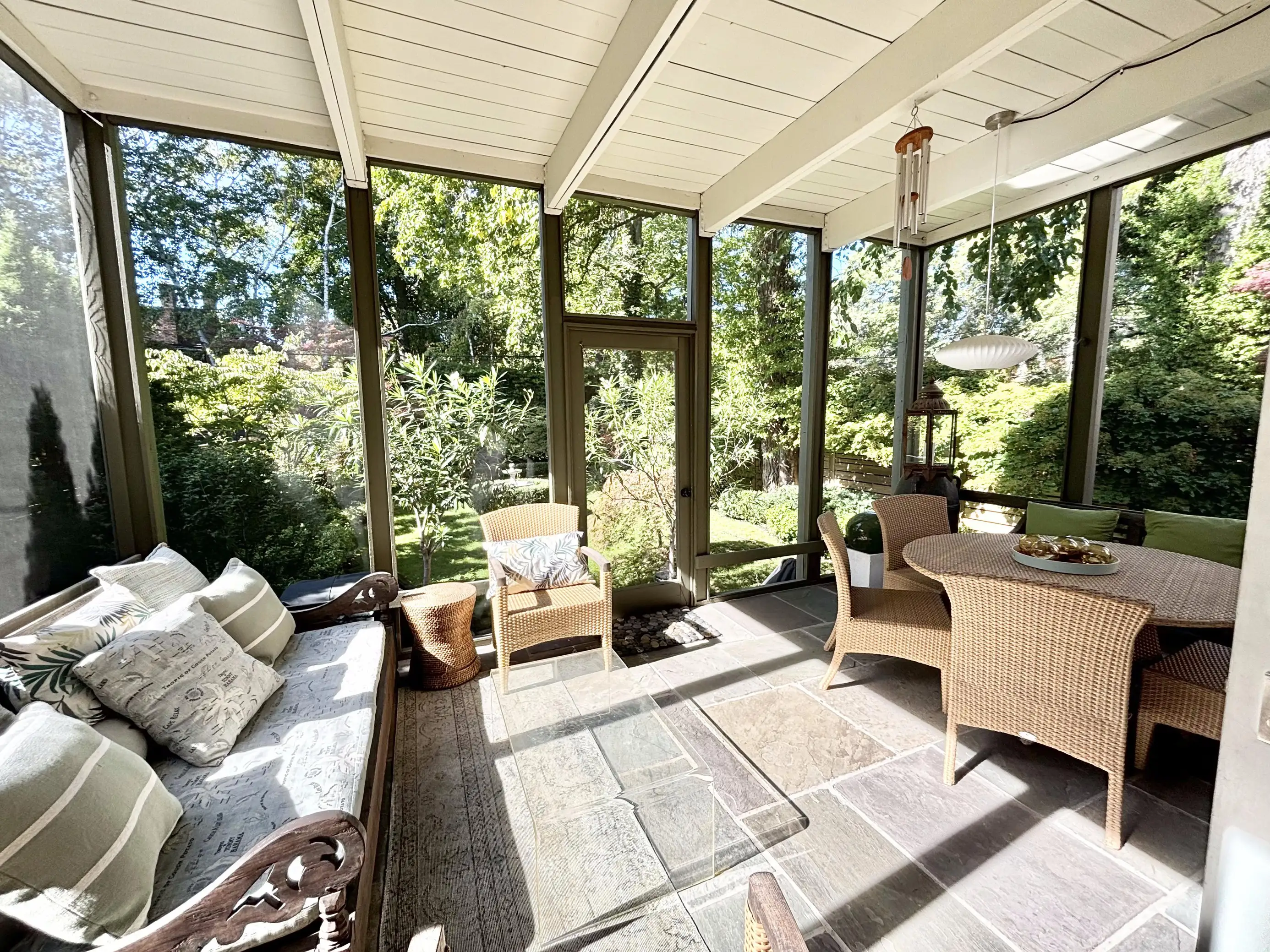 Double doors open to the 3-season screened-in sun room off the kitchen. Enjoy coffee lounging in the love seat of one of 2 chairs, or have a meal at the round table that seats 5. Screen window and doors open to the private backyard garden oasis.