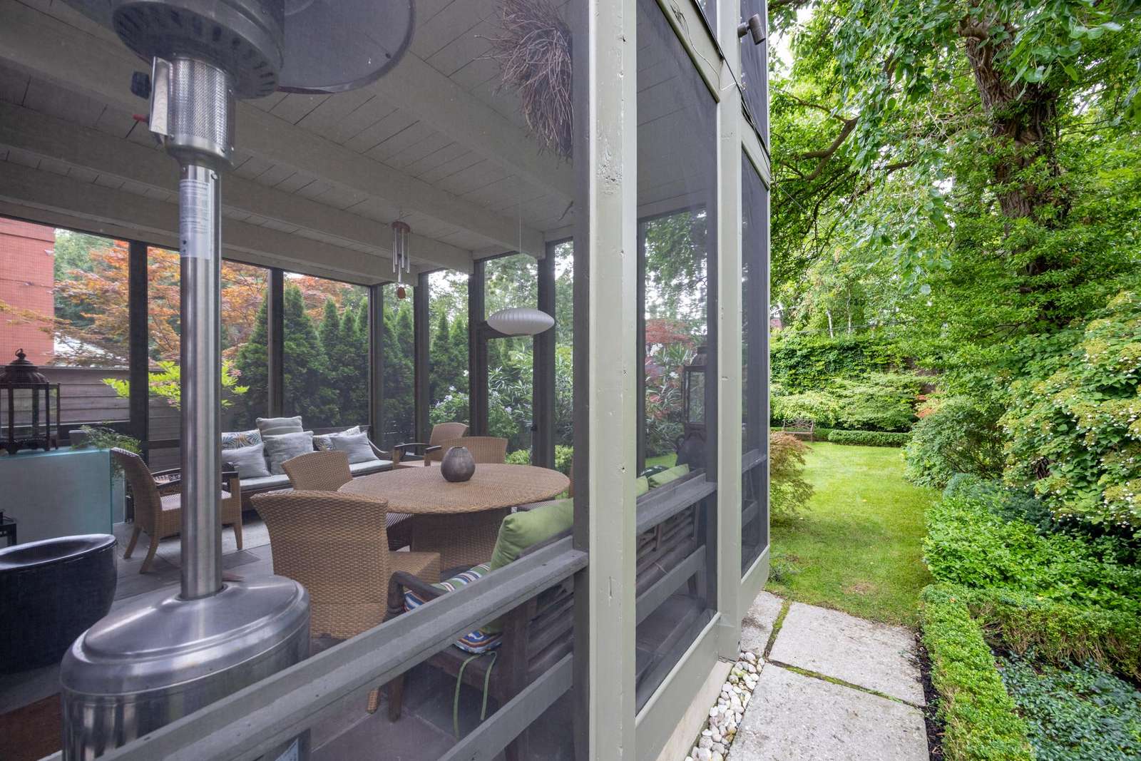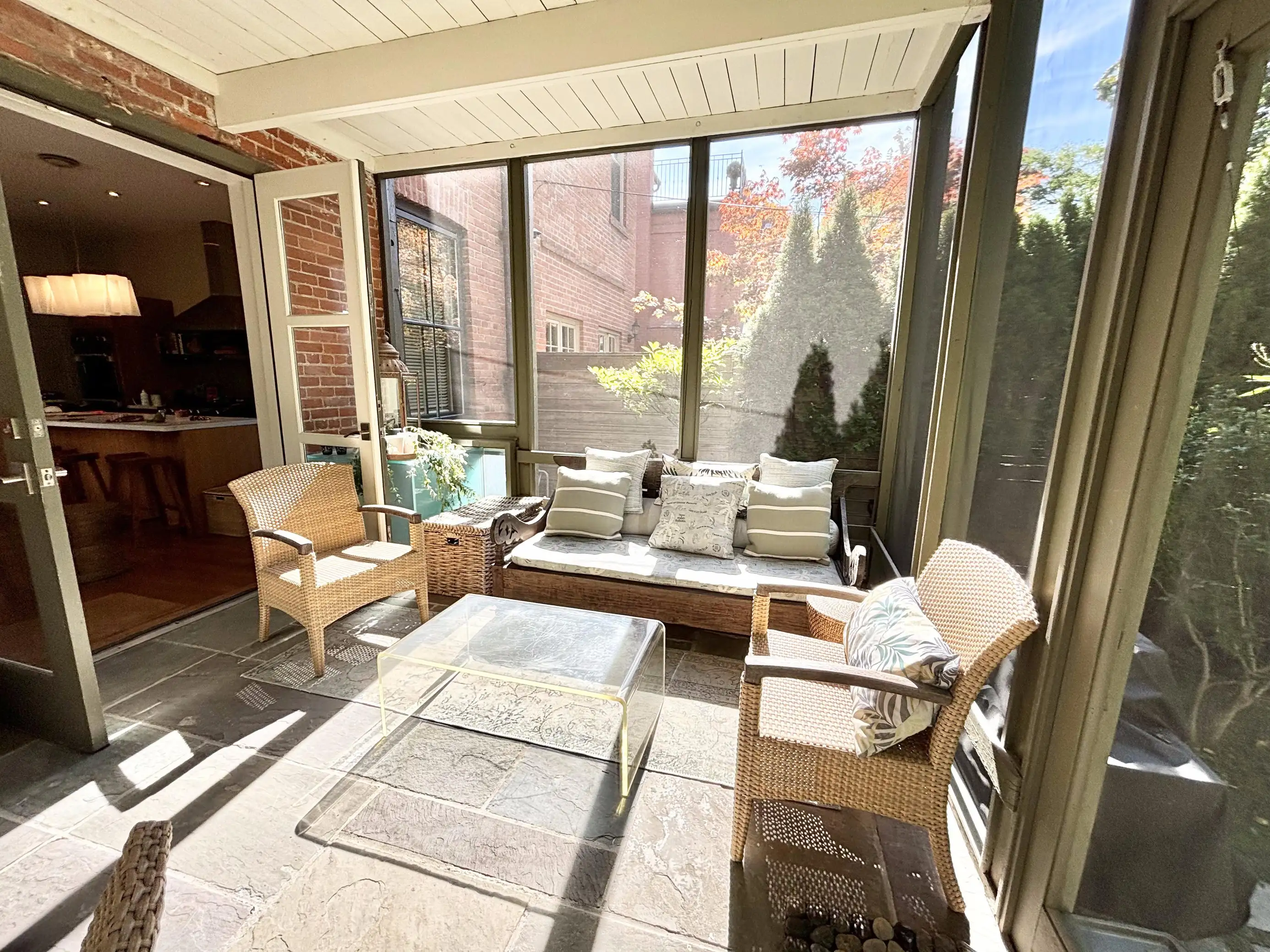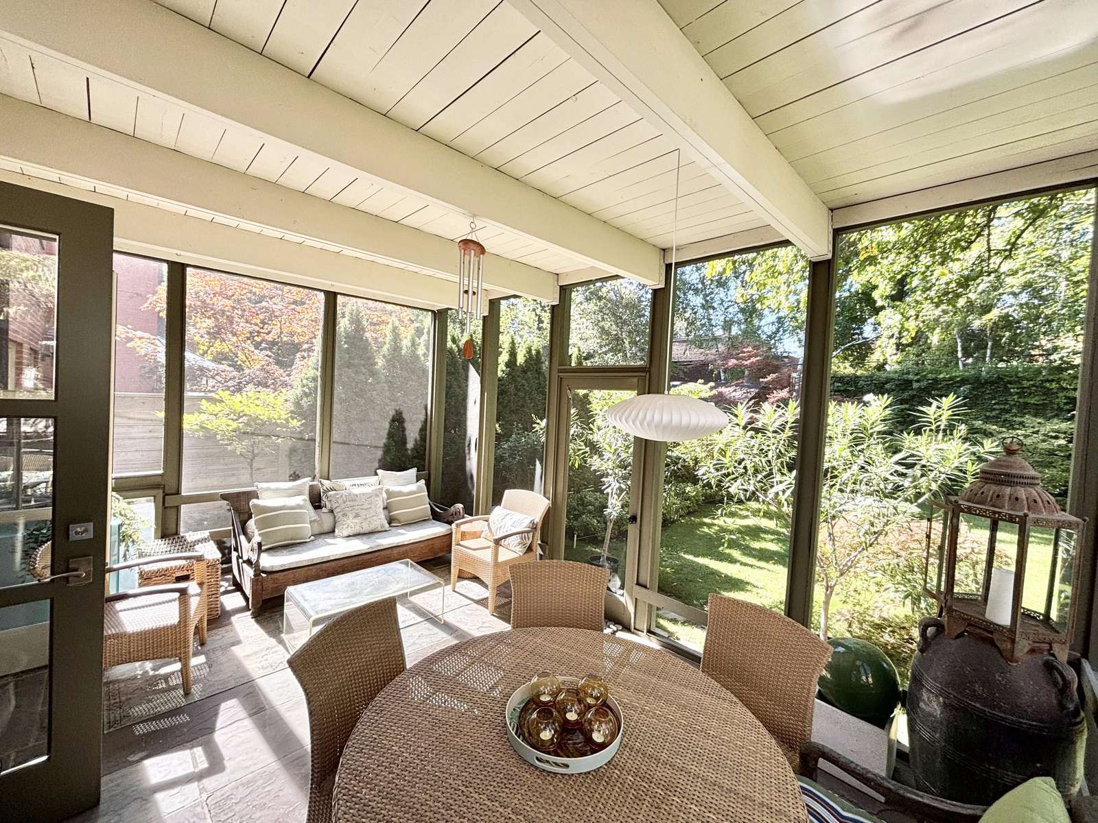 Double doors open to the 3-season screened-in sun room off the kitchen. Enjoy coffee lounging in the love seat of one of 2 chairs, or have a meal at the round table that seats 5. Screen window and doors open to the private backyard garden oasis.