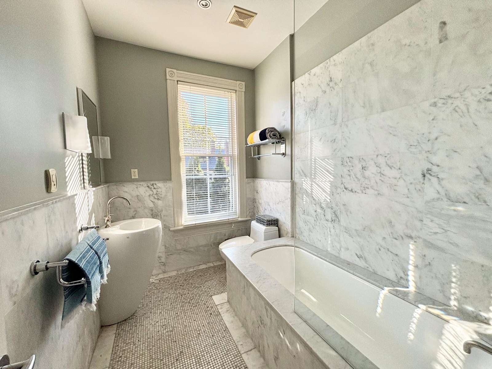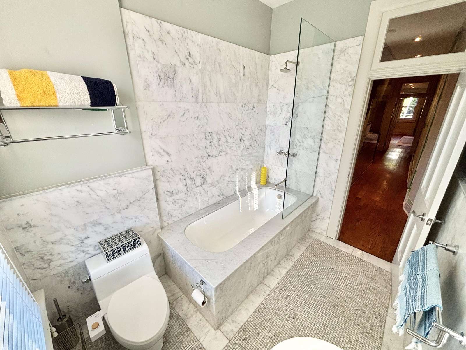 Bathroom 3 - 4-piece bathroom with marble tiles, single vanity, bath, shower,
