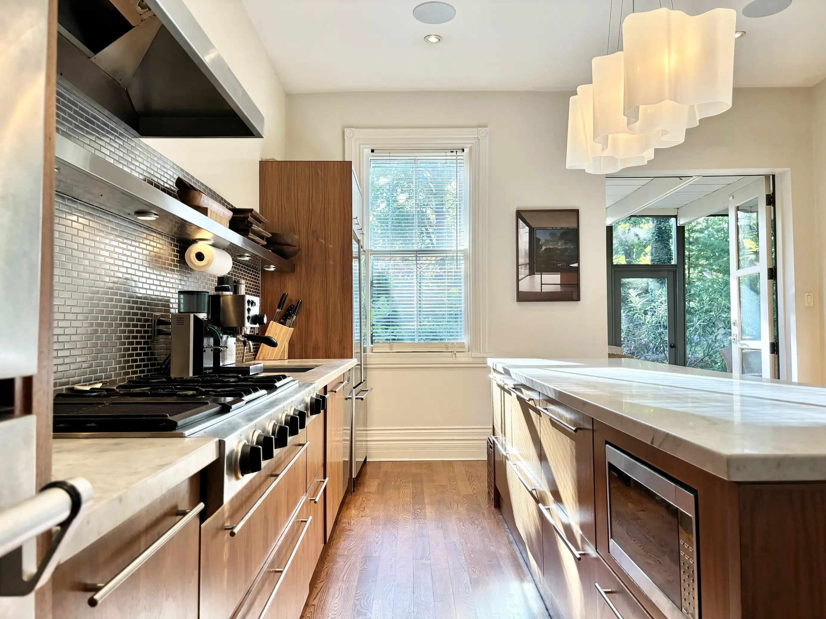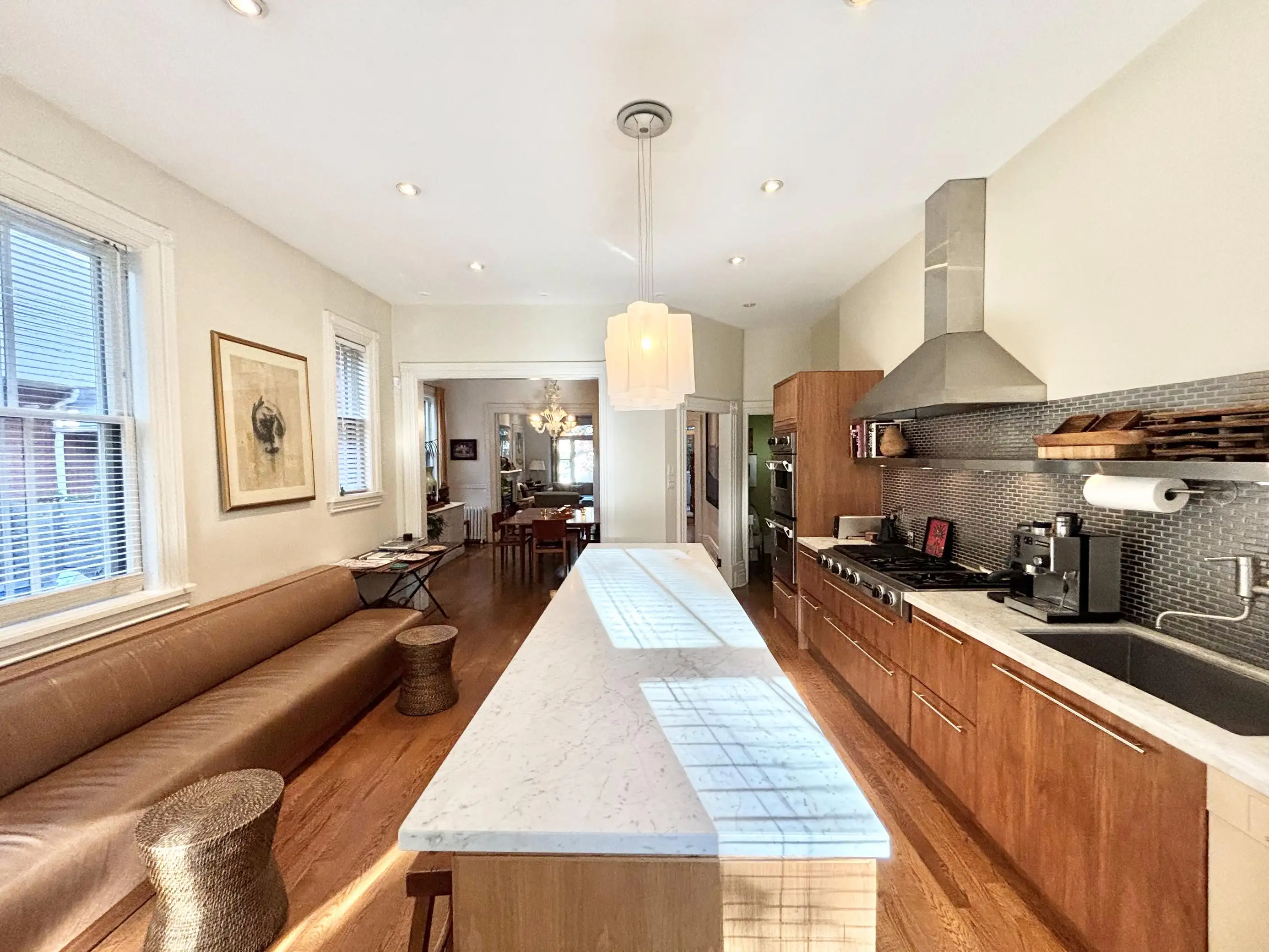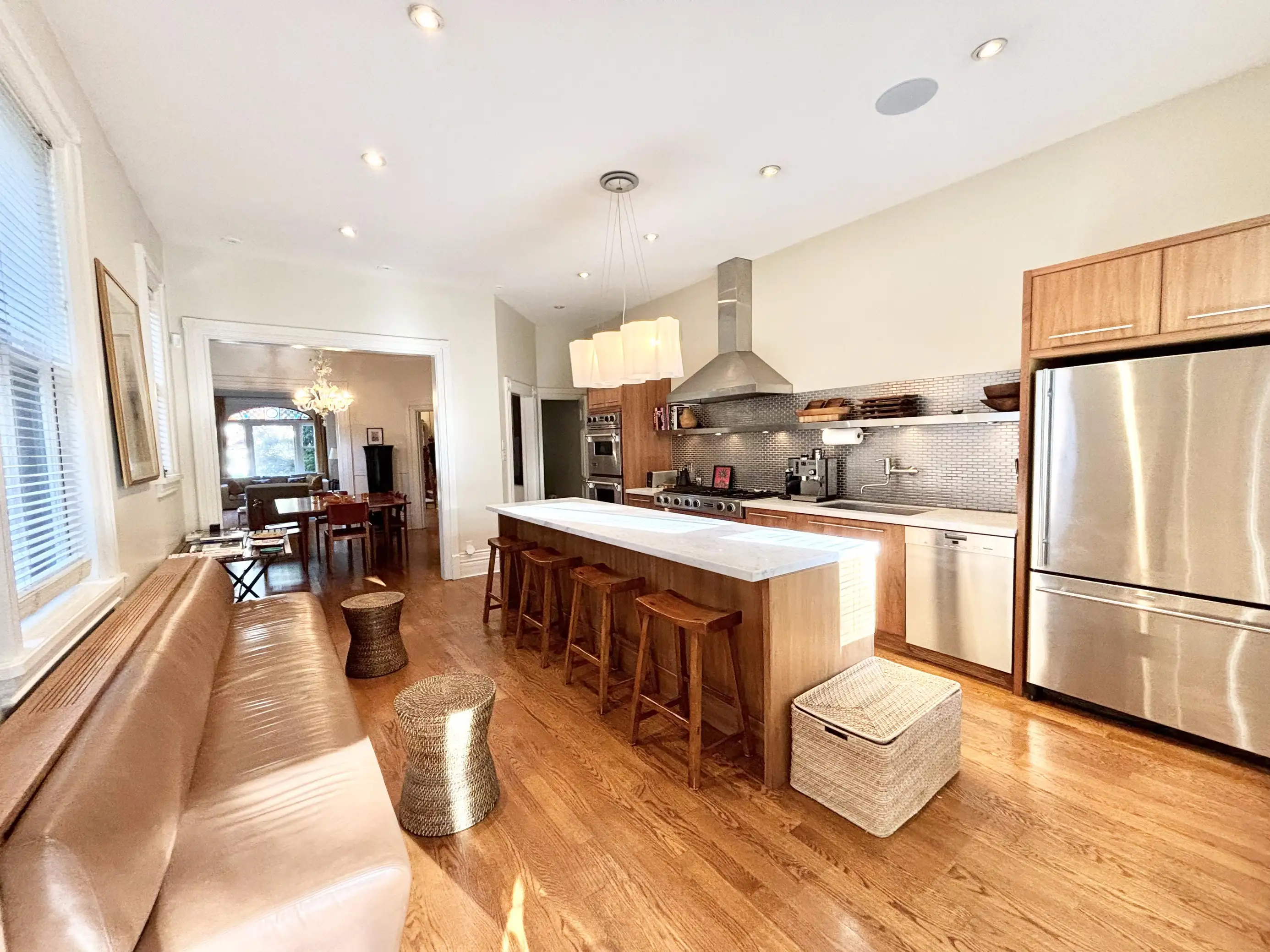 The open concept kitchen has stainless steel appliances and backsplash, a marble-topped island with seating for 4 and 4-seater leather banquet, Sonos sound system, and hardwood floors, opening up to the luxurious back patio. Appliances include gas range, dishwasher, fridge, microwave and double oven.