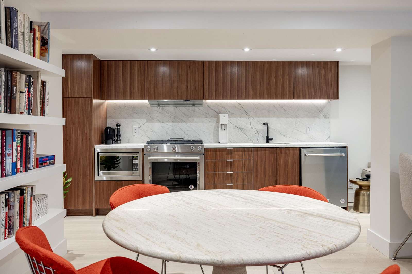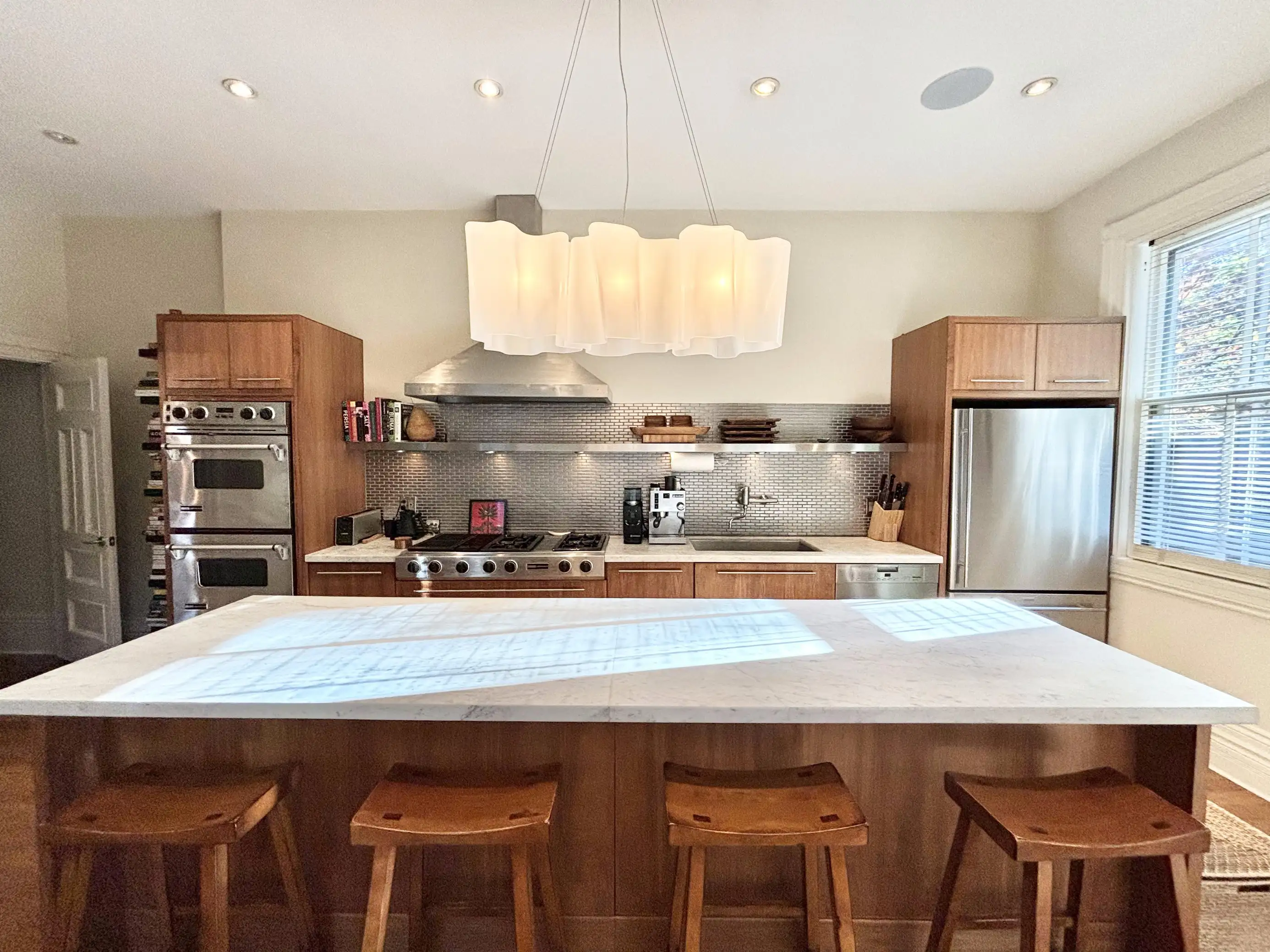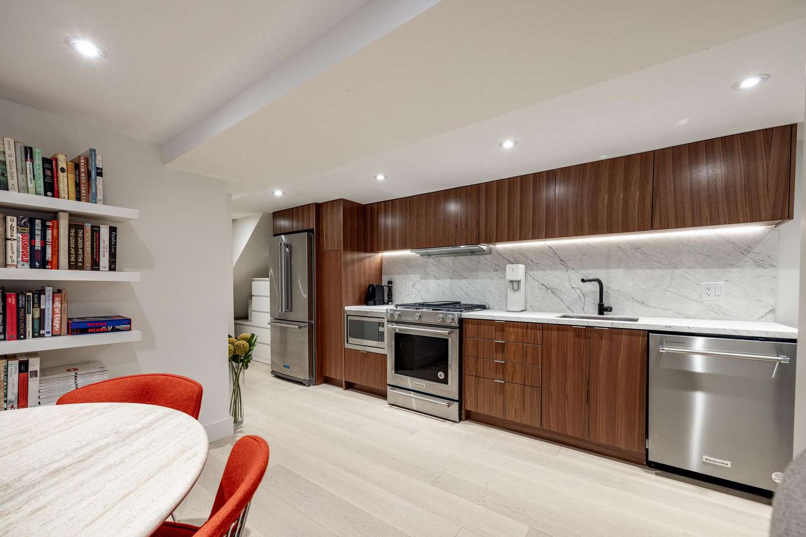 The open concept kitchen has stainless steel appliances and backsplash, a marble-topped island with seating for 4 and 4-seater leather banquet, Sonos sound system, and hardwood floors, opening up to the luxurious back patio. Appliances include gas range, dishwasher, fridge, microwave and double oven.