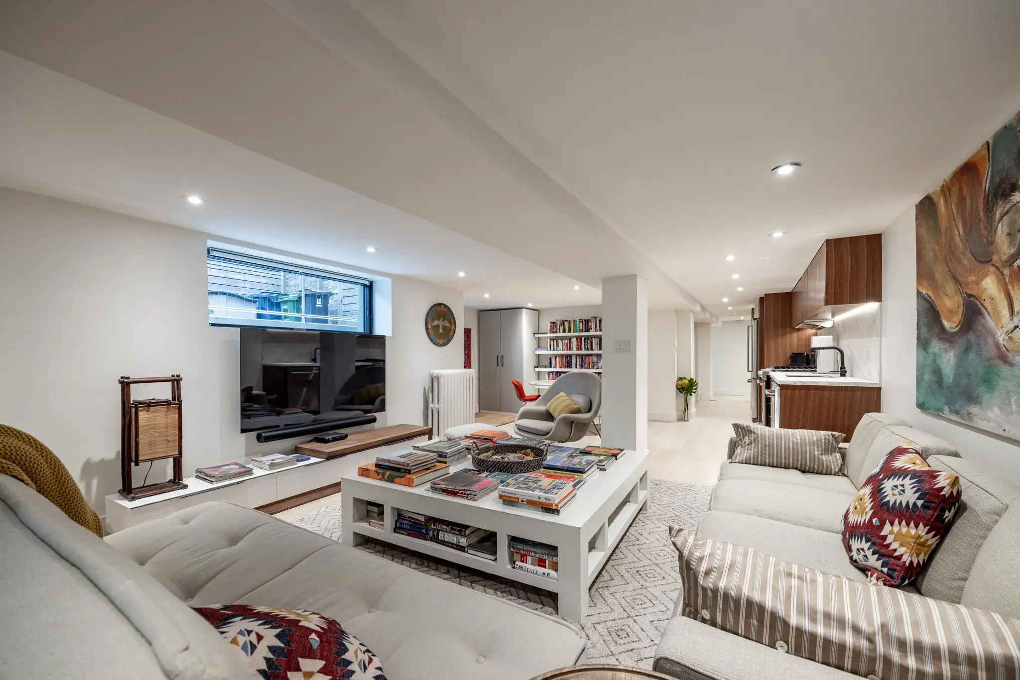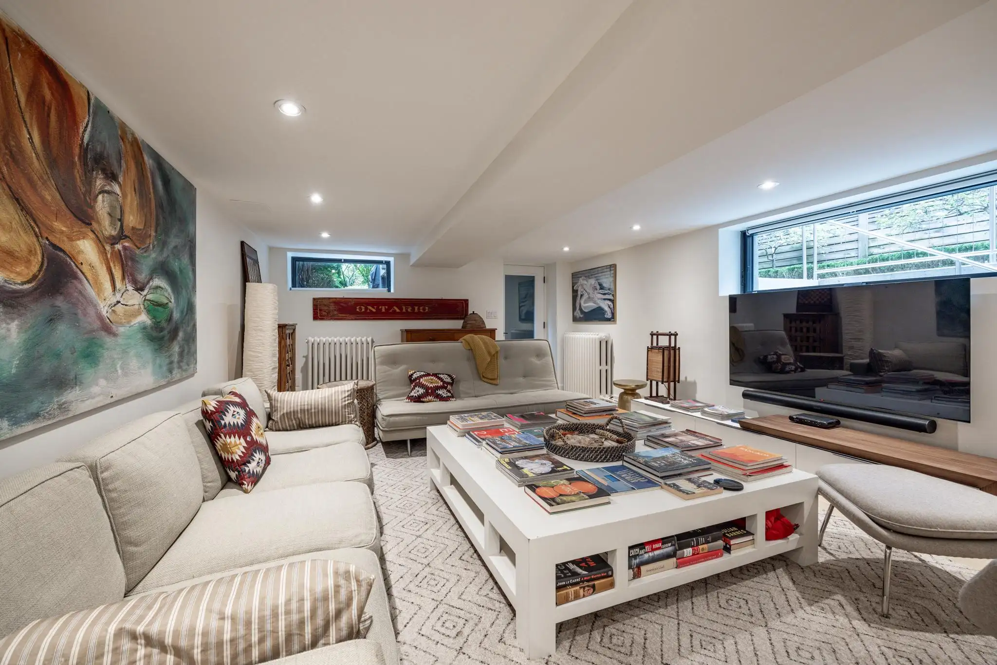 Large 4-seater couch, a love seat and arm chair provides a cozy living space with 70β flatscreen tv and Sonos speakers.